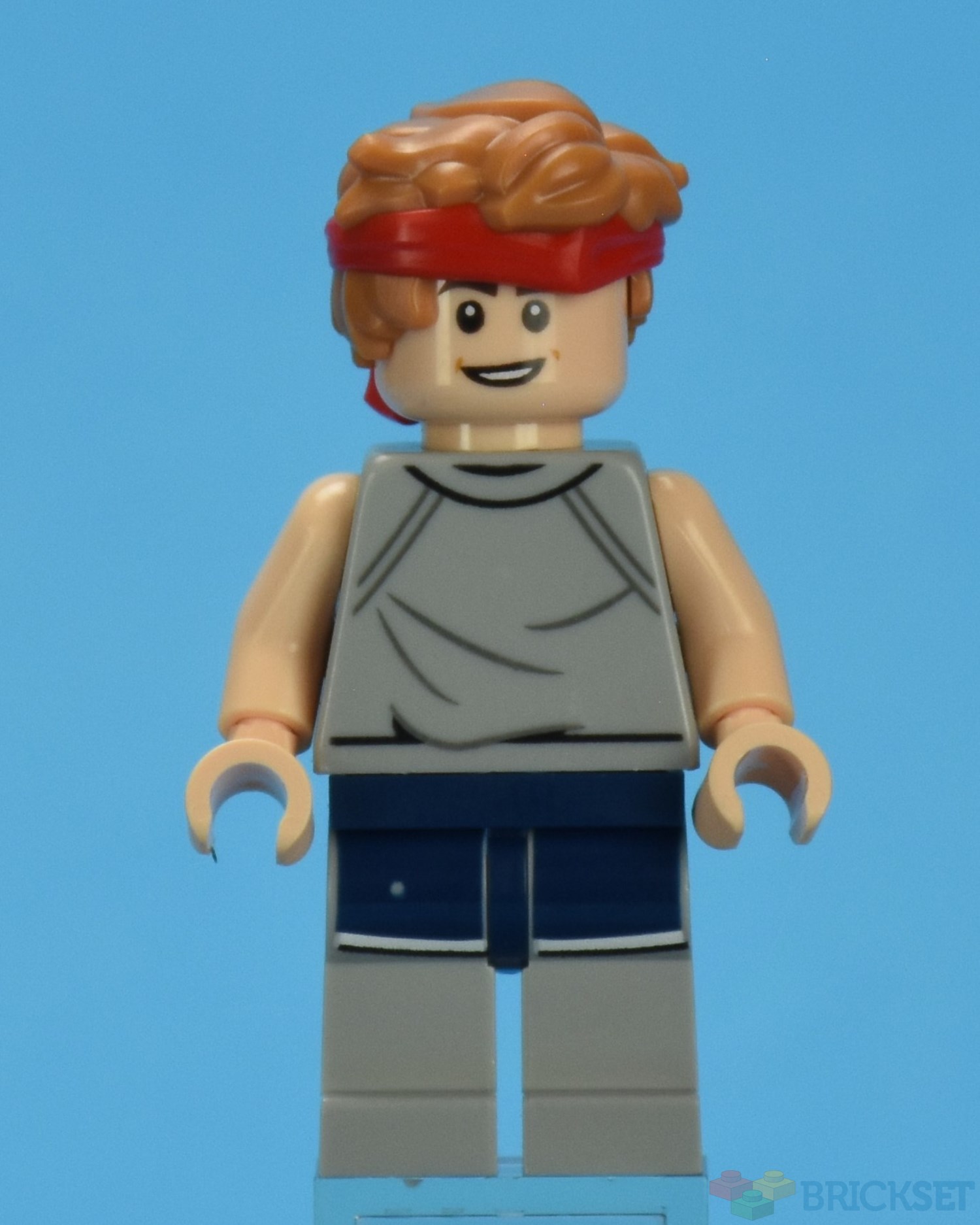 Brand is Mikey's older brother. He is wearing a grey sleeveless T-shirt. He is wearing blue gym shorts over his grey track pants.