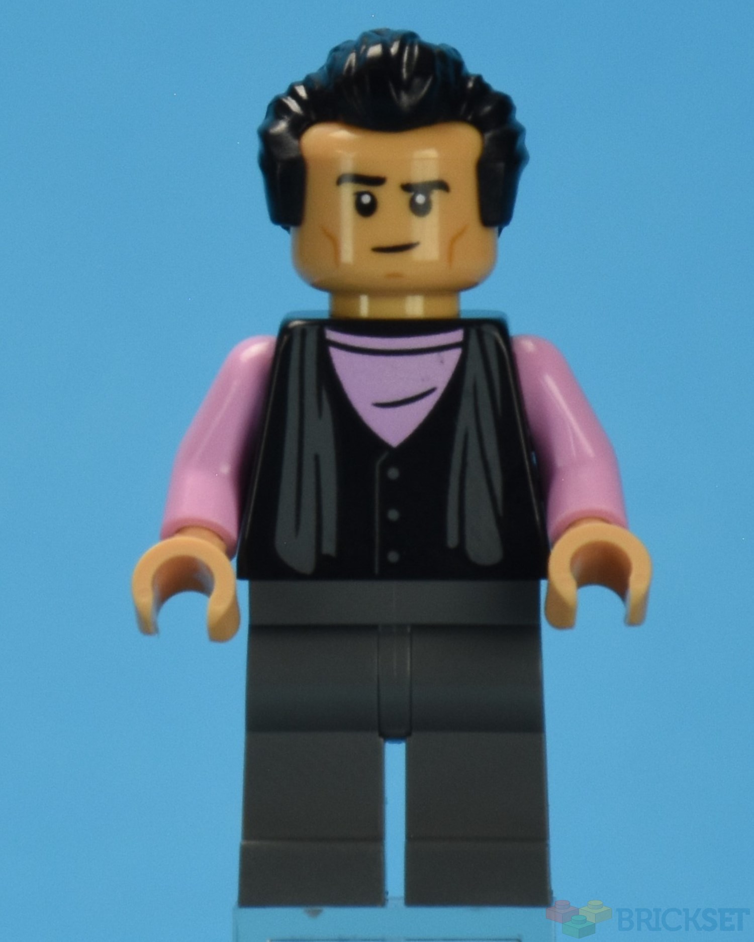Jake wears a dark grey waistcoat over a pink shirt.