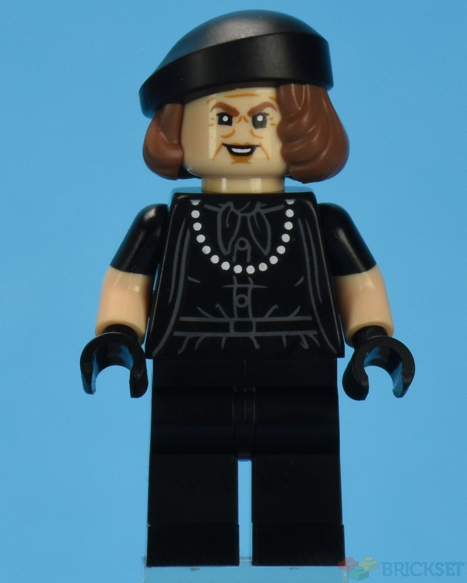 Mama is wearing a short-sleeved black blouse and has a single string of pearls around her neck. She is wearing a pair of black leather gloves and a matching black beret.