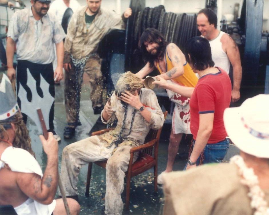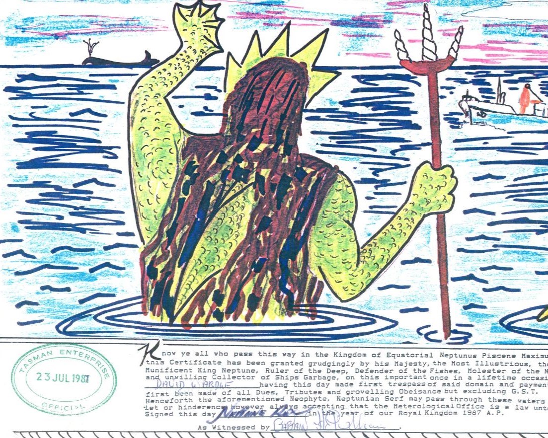 The image below shows me being drenched with food scraps that had been festering in a bucket in the tropical heat for several days. My Crossing the Line certificate (dated 23 July 1987) proves that I am now a Shellback.