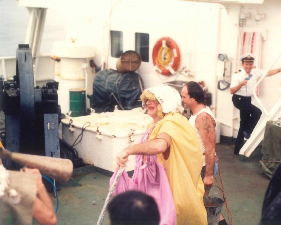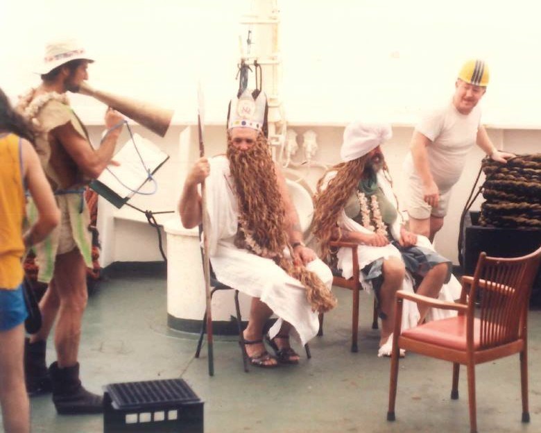 The image below left shows King Neptune and Queen Amphitrite who had boarded the Tasman Enterprise as she sailed across the Equator. The person holding the trumpet is the Chief Officer and playing the Court Jester. The Third Engineer is dressed up as Queen Amphitrite while one of the Motormen is King Neptune.