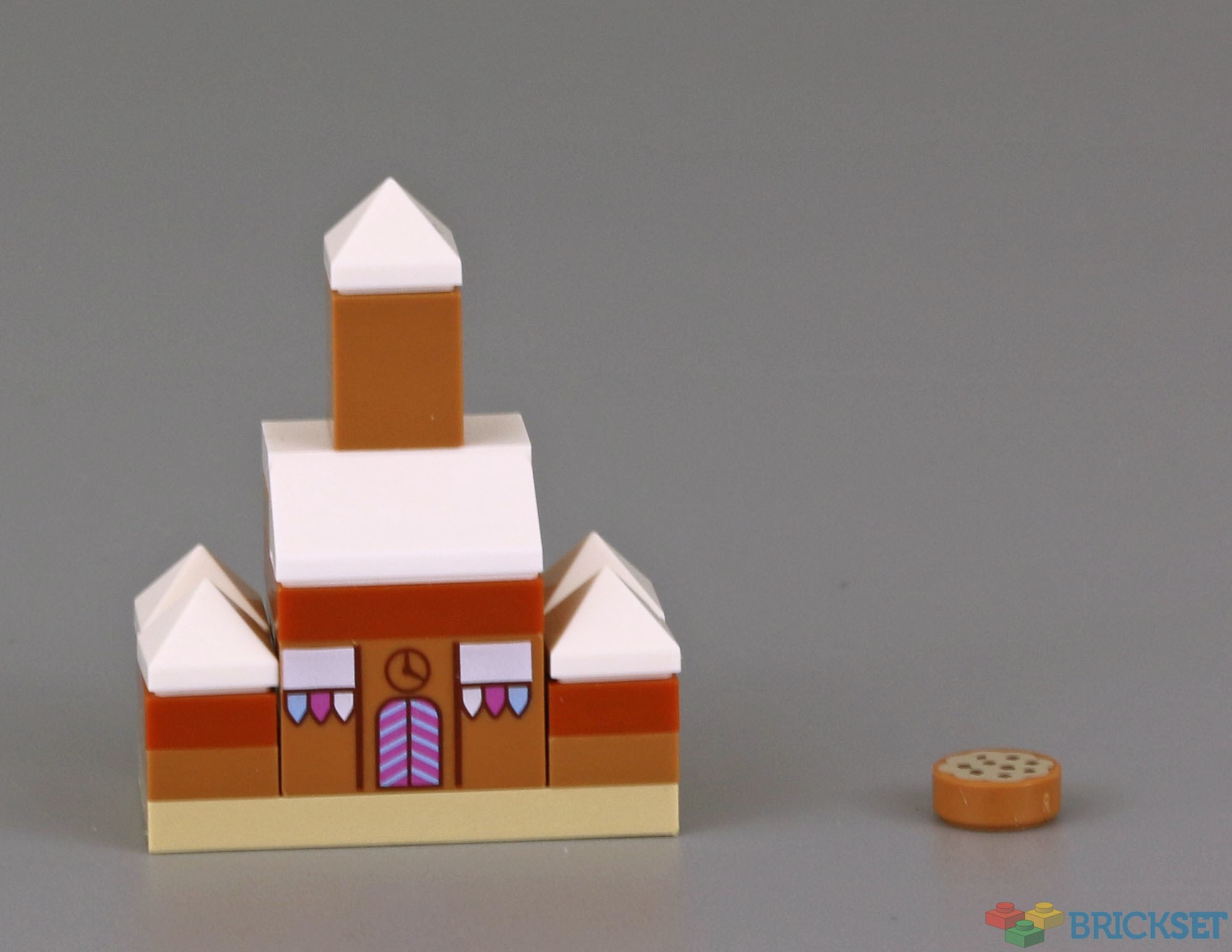 Today's build is a very pretty gingerbread house! It's a rather grandiose house with a tall spire in the centre and four icing-topped gables on the sides. The main entrance boasts a large door, a clock and two windows. I thought the windows may have decorations, but I think they're multi-coloured awnings. Regardless, this is a nice printed piece that may be unique to this set (I didn't see it in the database). To make the build even sweeter, there's a chocolate chip cookie included.
