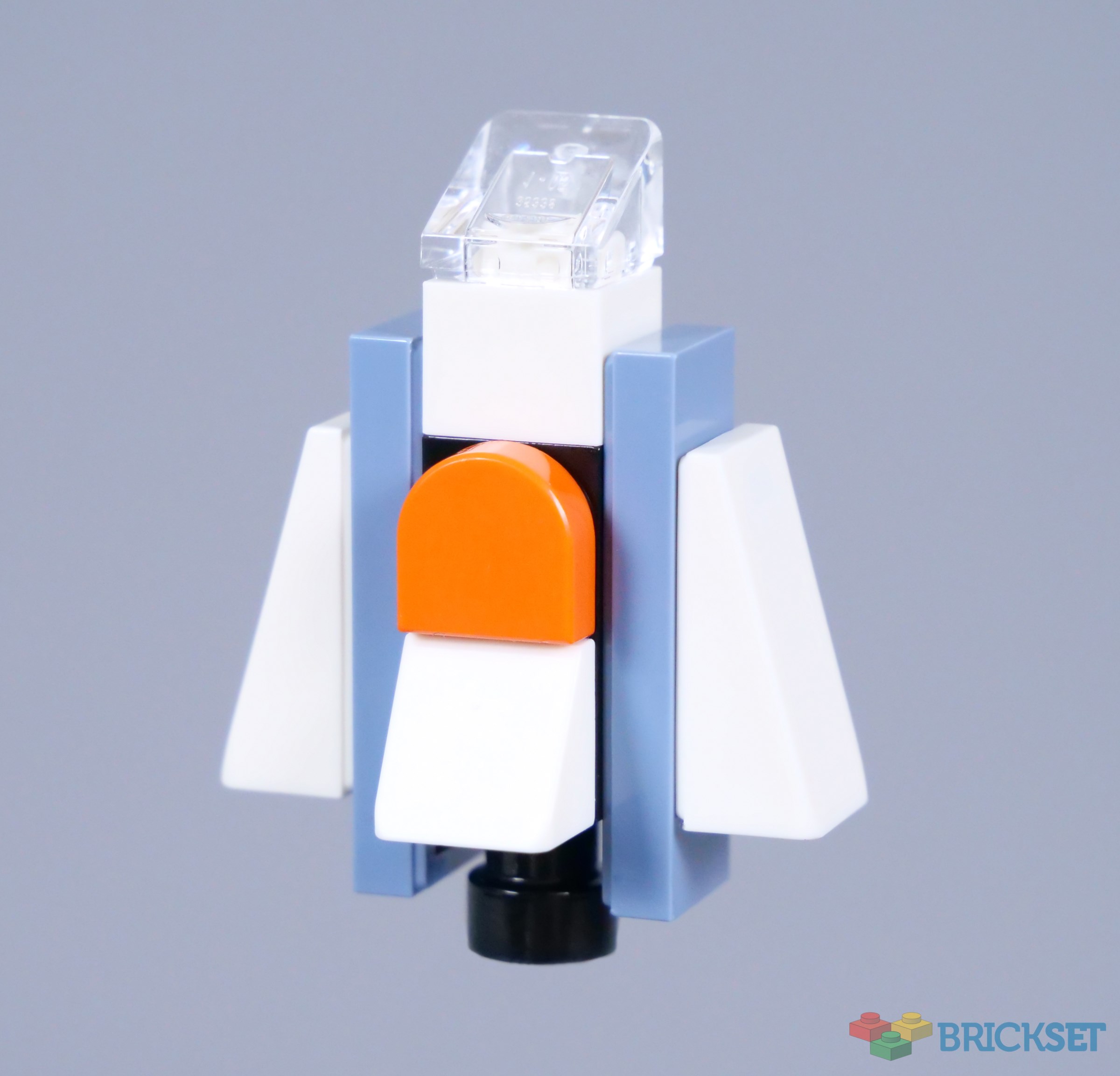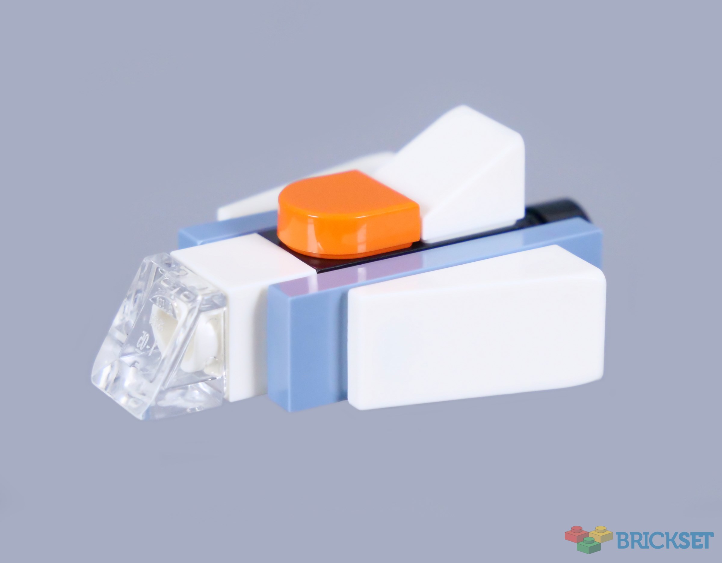 This mini spacecraft is quite appealing, featuring the familiar white, sand blue and reddish orange colour scheme seen throughout the recent City Space range. Its shape does not seem to be based on any specific vehicle from those sets, but 1x2x2/3 slopes work nicely for the wings and I like the engine with an anti-stud on the back, so you can orient the spaceship for a vertical launch.