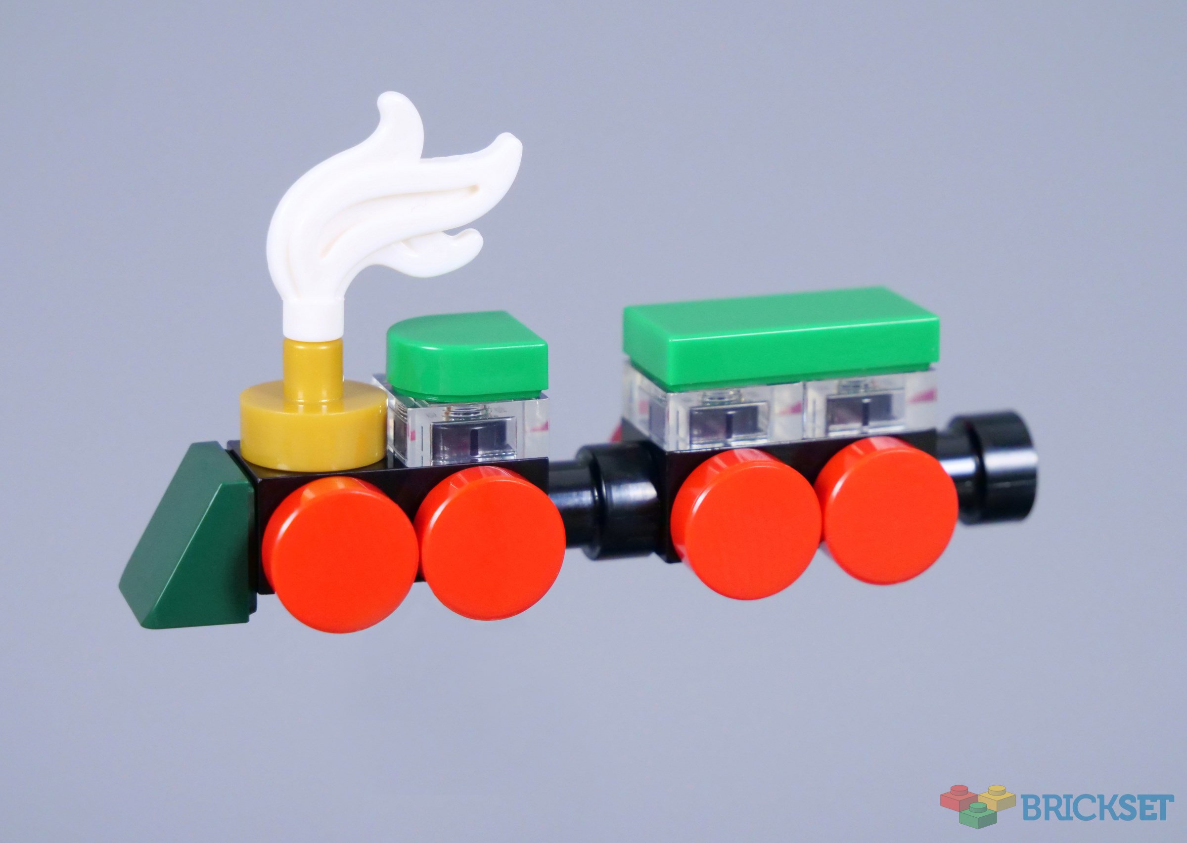 This toy train is pretty standard fare. The locomotive and carriage are designed around the old camera element, which is a common technique and one that continues to work, featuring connection points for 1x1 round tiles as the wheels on either side and a linkage between the two sections of the train. The design may be familiar, but this colour scheme is appealing and I like the plume of steam too.