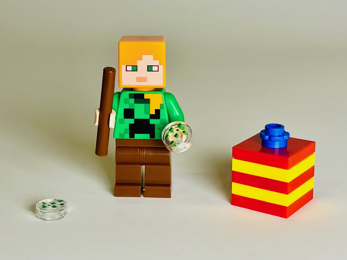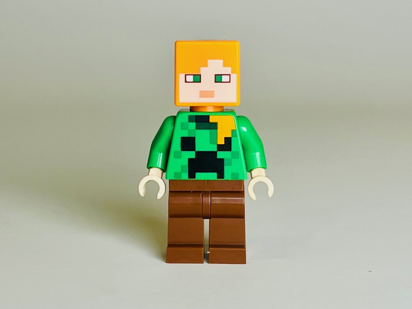 The Alex minifigure has the usual head and leg pieces, but the bright green printed torso is exclusive to this set. I love the pattern of the Creeper face, although the hair printing makes the torso less versatile than I would like.
