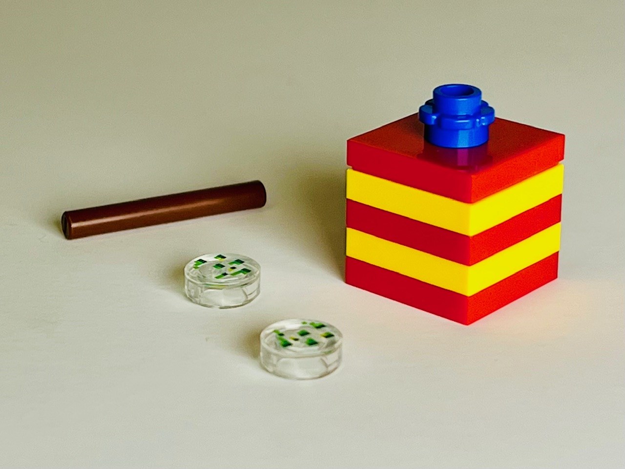 The block is a present. I sort of wish they'd used a https://brickset.com/parts/design-2821 with a double-jumper on top, even if that wouldn't have allowed for the stripes, you'd still have something to put the seeds in. Better yet, use that new chest piece, as seen in 21583, although that might not have been available when this calendar was being designed."