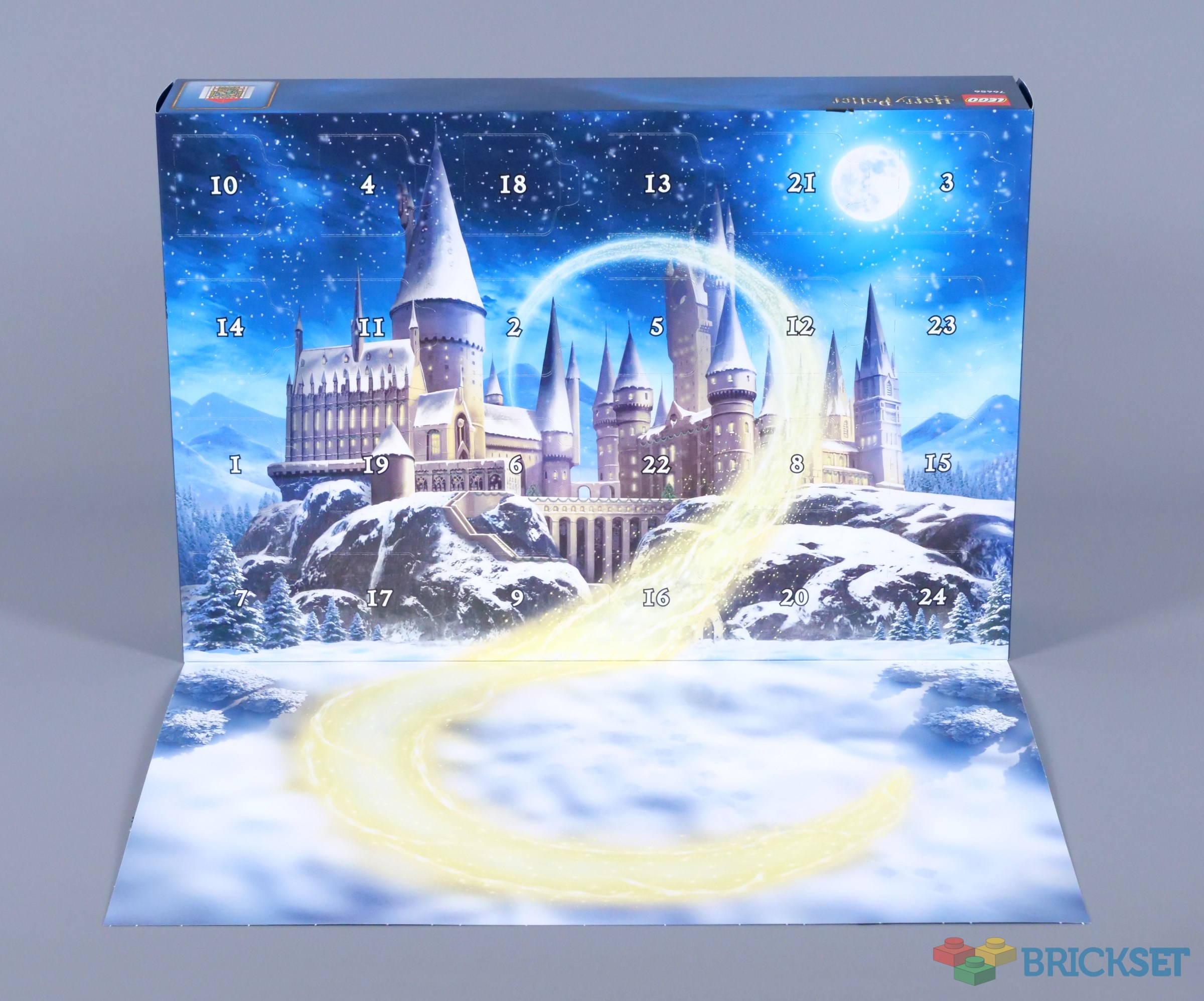 The packaging for this Harry Potter Advent Calendar is quite different to the previous few, with minifigures from each Hogwarts house taking pride of place and some small models displayed underneath. Hogwarts Castle and the frozen Black Lake form an attractive backdrop behind the box flap, with some kind of magical energy streaming from one to the other.