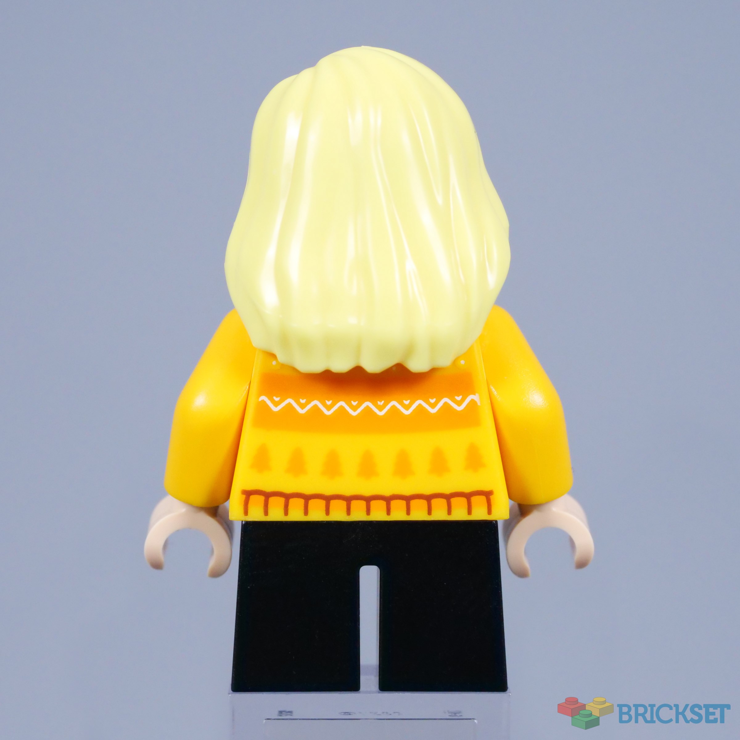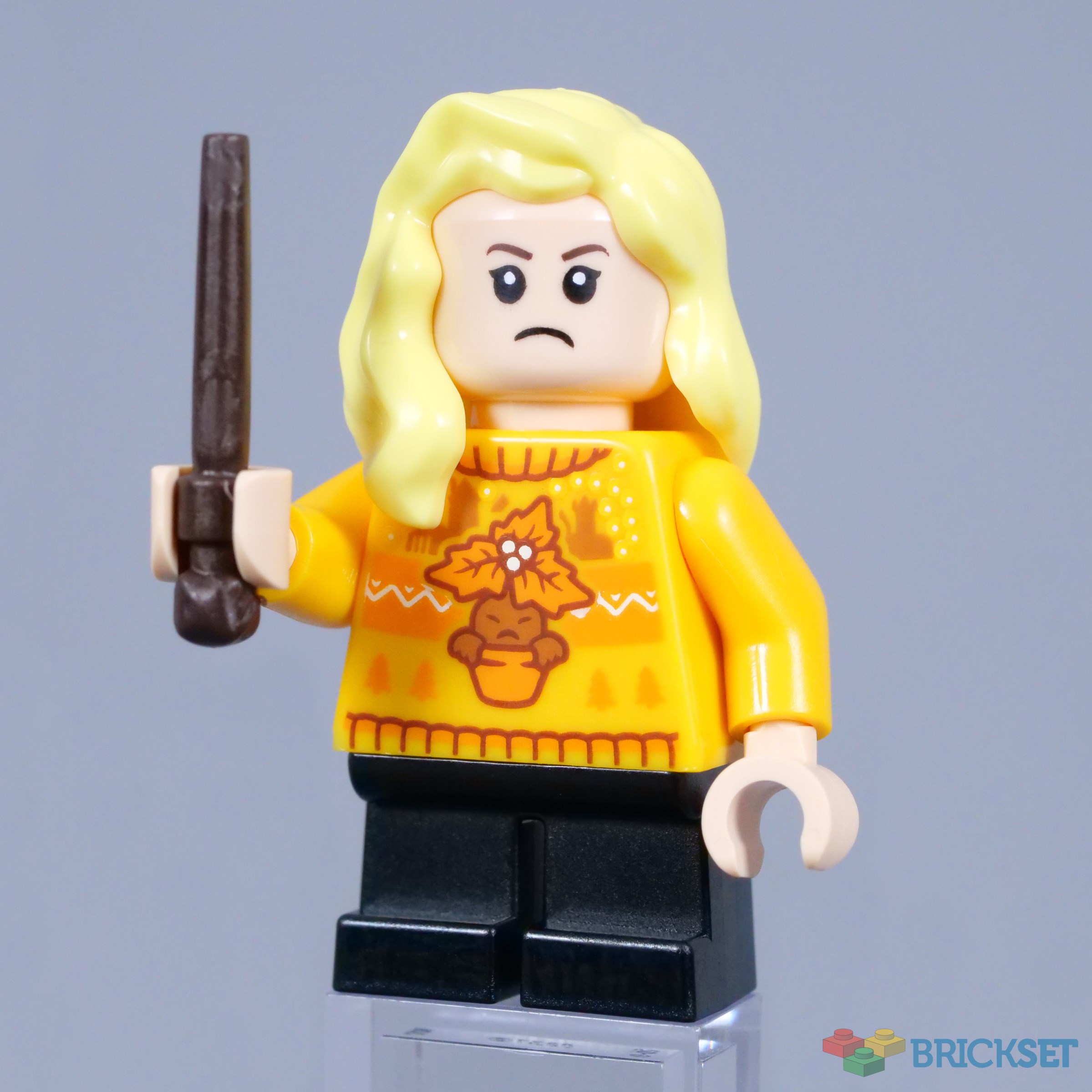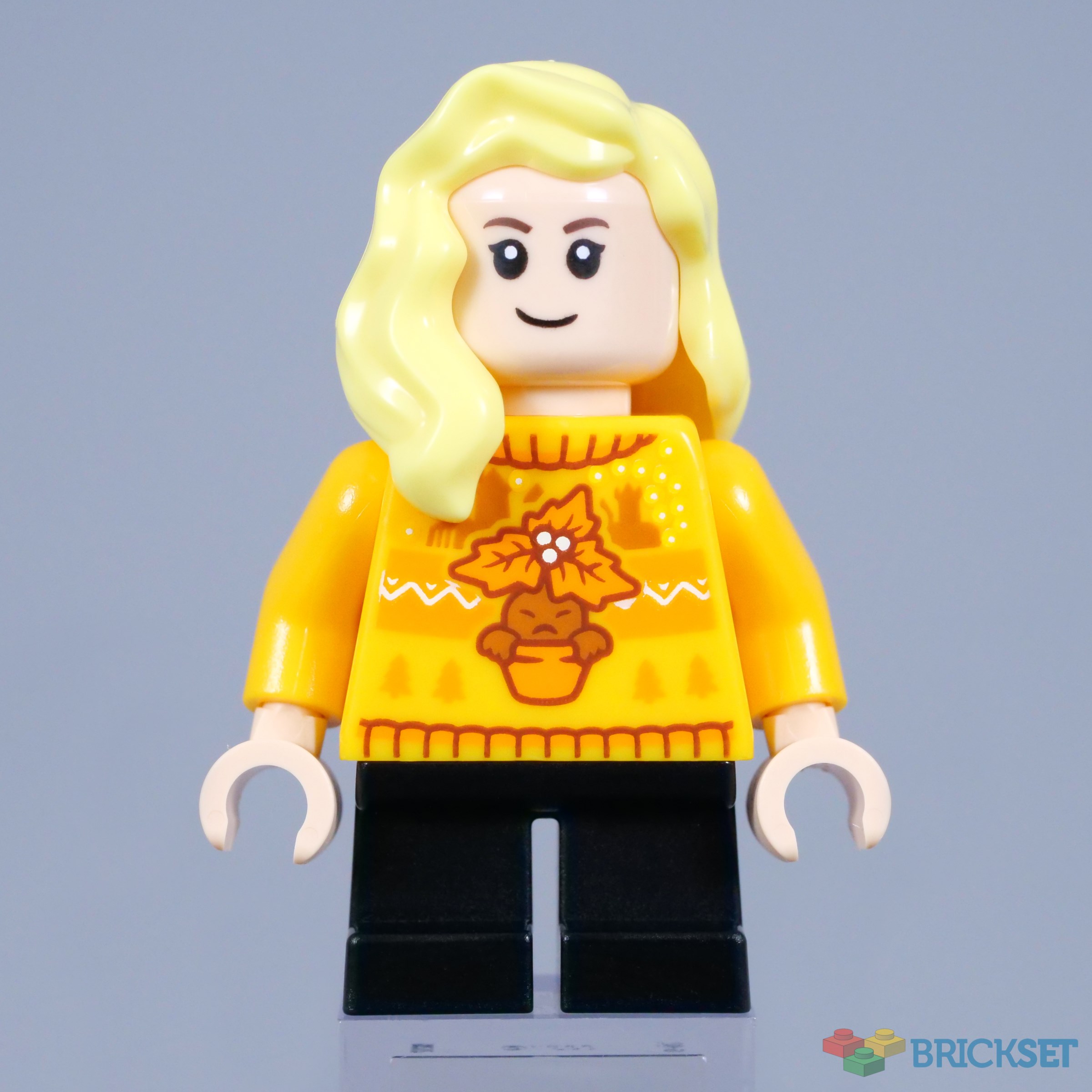 Hannah Abbott joins the group today, dressed in a lovely flame yellowish orange jumper. Like the previous few minifigures, this one includes a seasonal magical creature on her jumper and the mandrake looks adorable! I love its hands gripping the sides of the pot and the holly leaves on top are a nice touch, with some white berries.