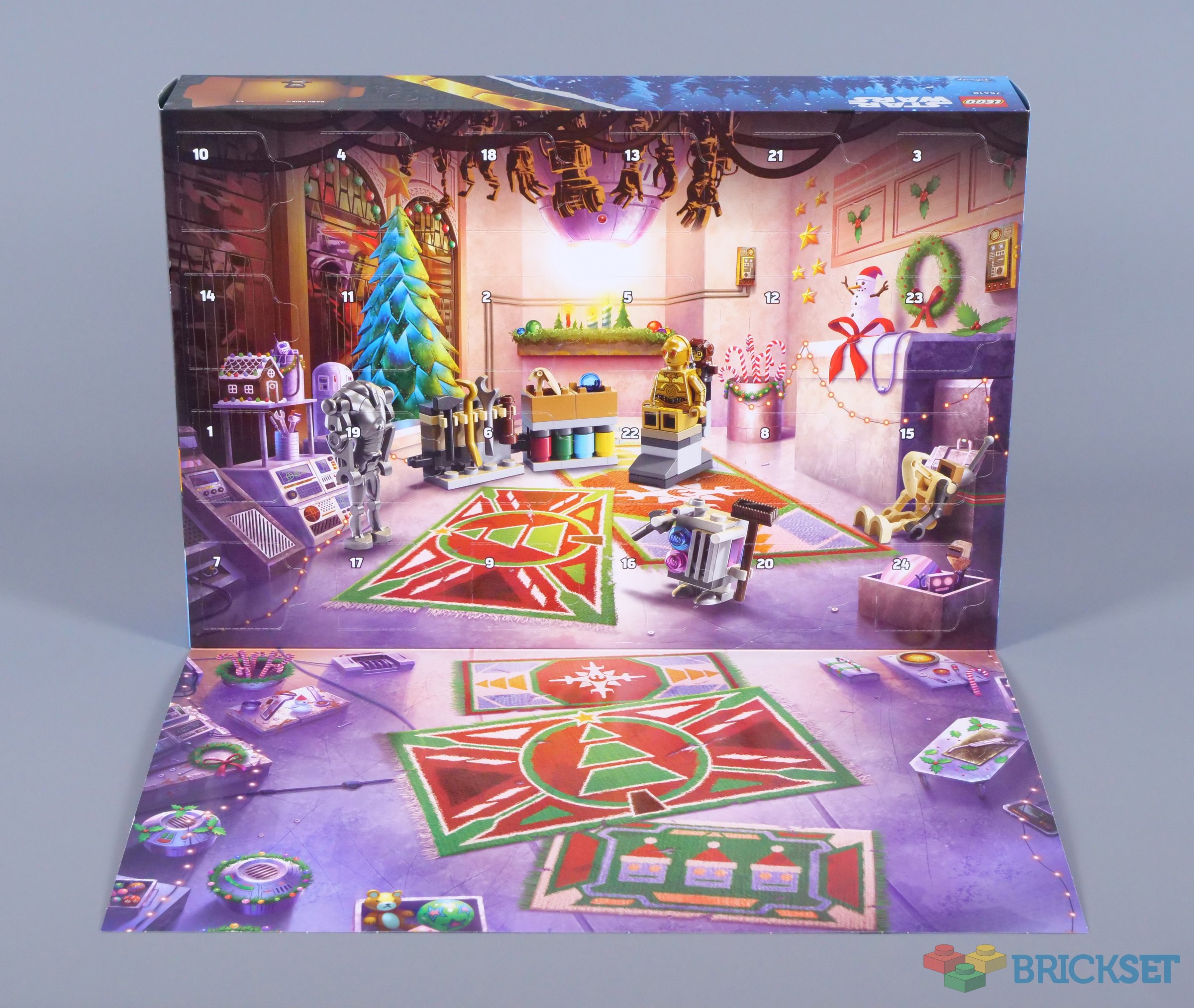The box leaves no doubt as to the theme of the Advent Calendar, as numerous droids and the equipment needed to assemble them appear on the cover. The environment is based on Babu Frik's workshop from The Rise of Skywalker, although brightly lit, which actually makes it rather tricky to recognise.