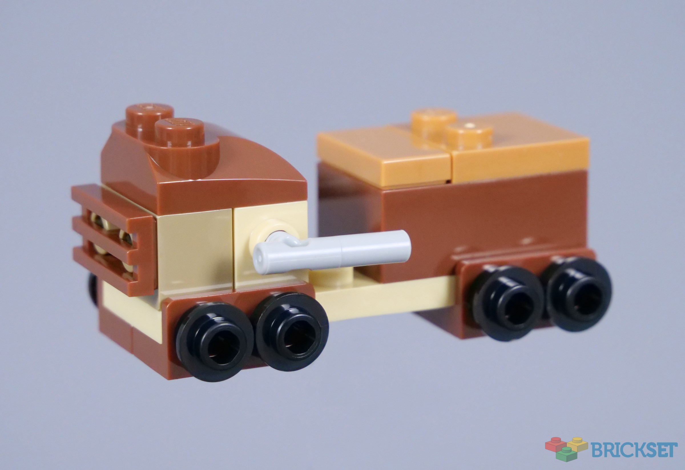 This vehicle is unlike anything we have seen in the Advent Calendar so far. Although the lack of functional wheels is not ideal for play, this design resembles the treads on a Sandcrawler, which seems appropriate for a droid-themed calendar. However, the model is otherwise very bland and the 2x3 brick on the back seems particularly strange.