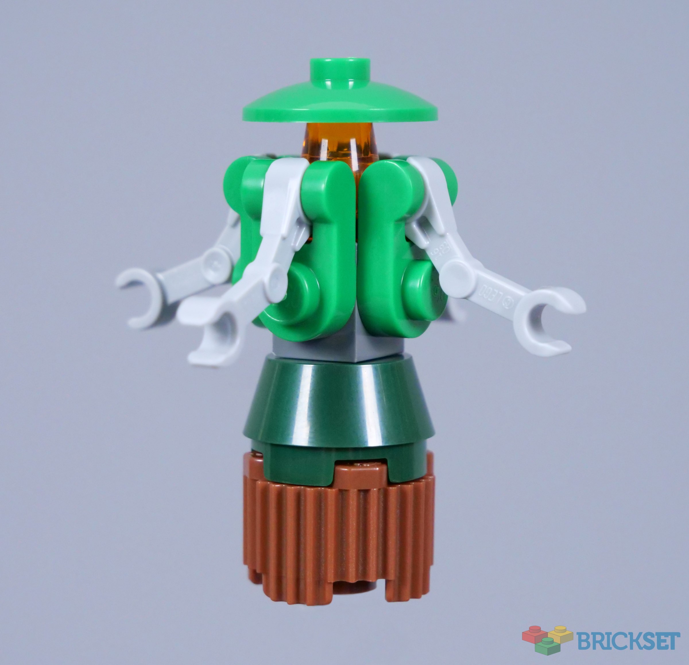 I love the idea of a Christmas tree-inspired FX-6 medical droid, which participates in Darth Vader's installation in his suit. The combination of green, dark green and reddish brown is effective and I think the general shape translates very roughly to a Christmas tree, depending on how you position the arms. In addition, the trans-orange 1x1 cone placed roughly where the droid's sensor cluster should be looks nice, giving the droid a bit more life.