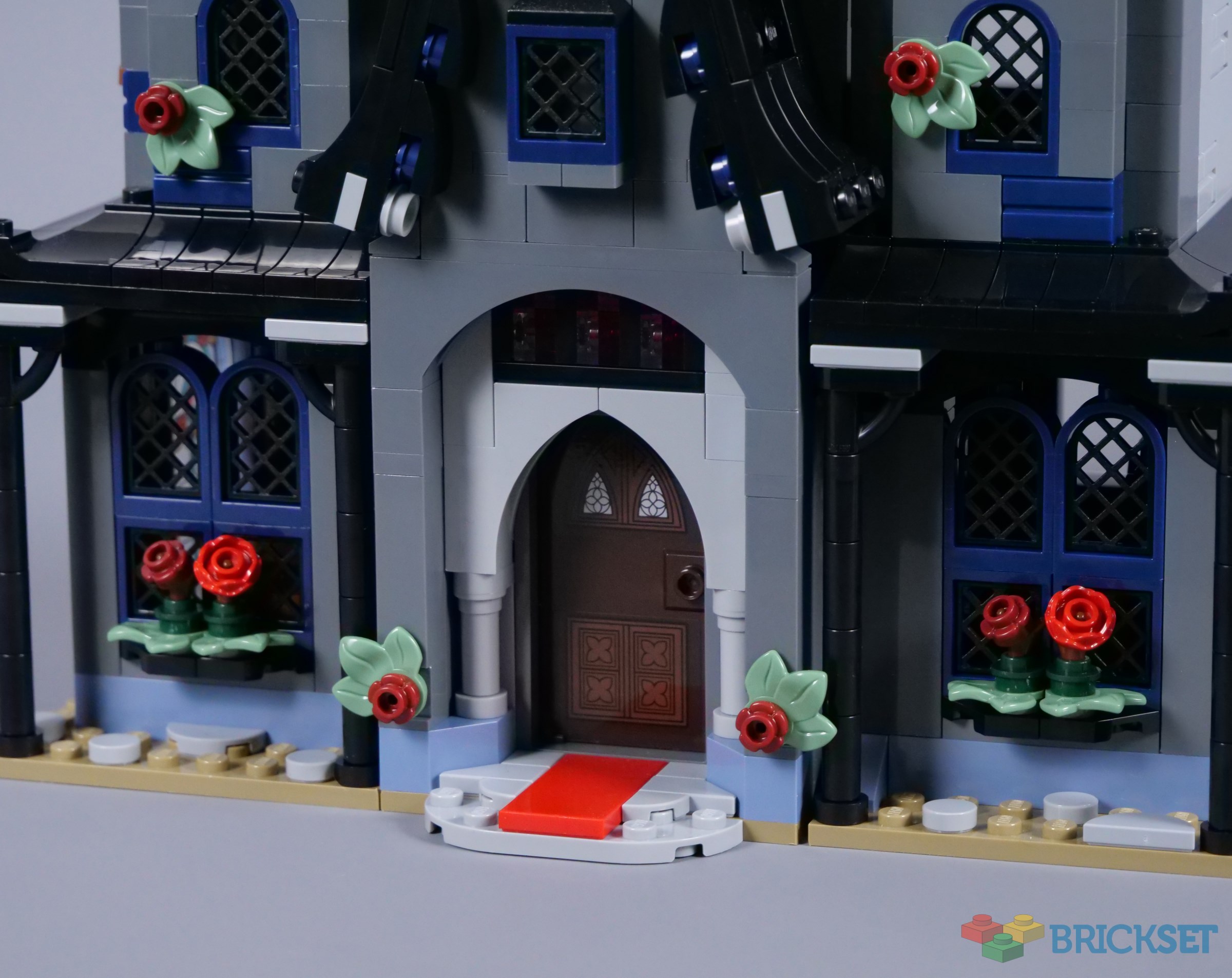 Large stickers are applied on the curved windows on the back and side, featuring an attractive rose bush design. The back is otherwise relatively plain, but the reddish brown and dark bluish grey areas look reasonable and the only details notably out of place are the 1x2 rounded bricks with bars flanking the windows, which serve as hinges to open the building.