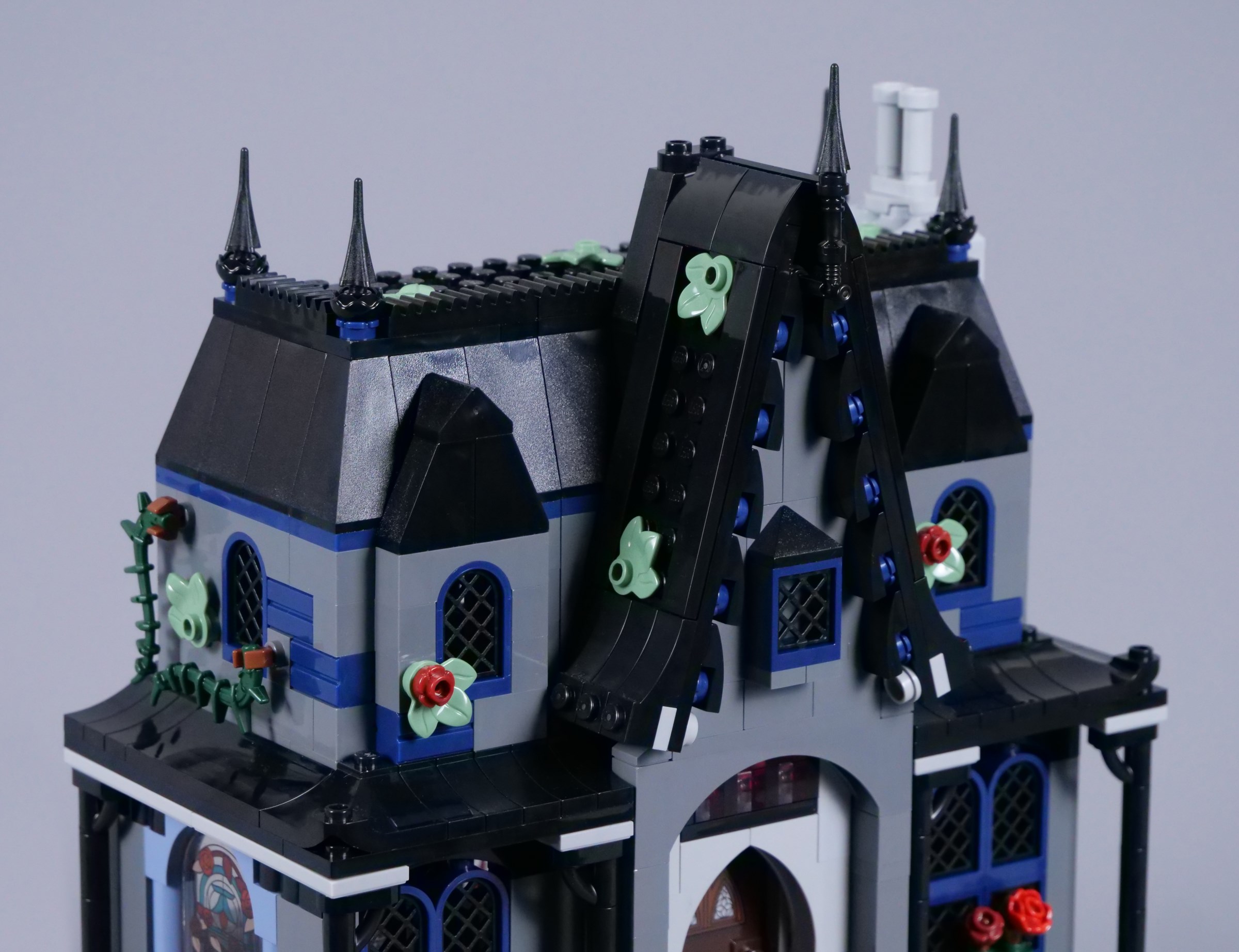 Additionally, the dark blue accents across the exterior complement the predominant dark bluish grey and black colours, particularly on the roof, where rows of 1x1 flowers create a pattern. The 1x2 masonry bricks are new in dark blue, as are the curved window frames, so there are several interesting recolours.