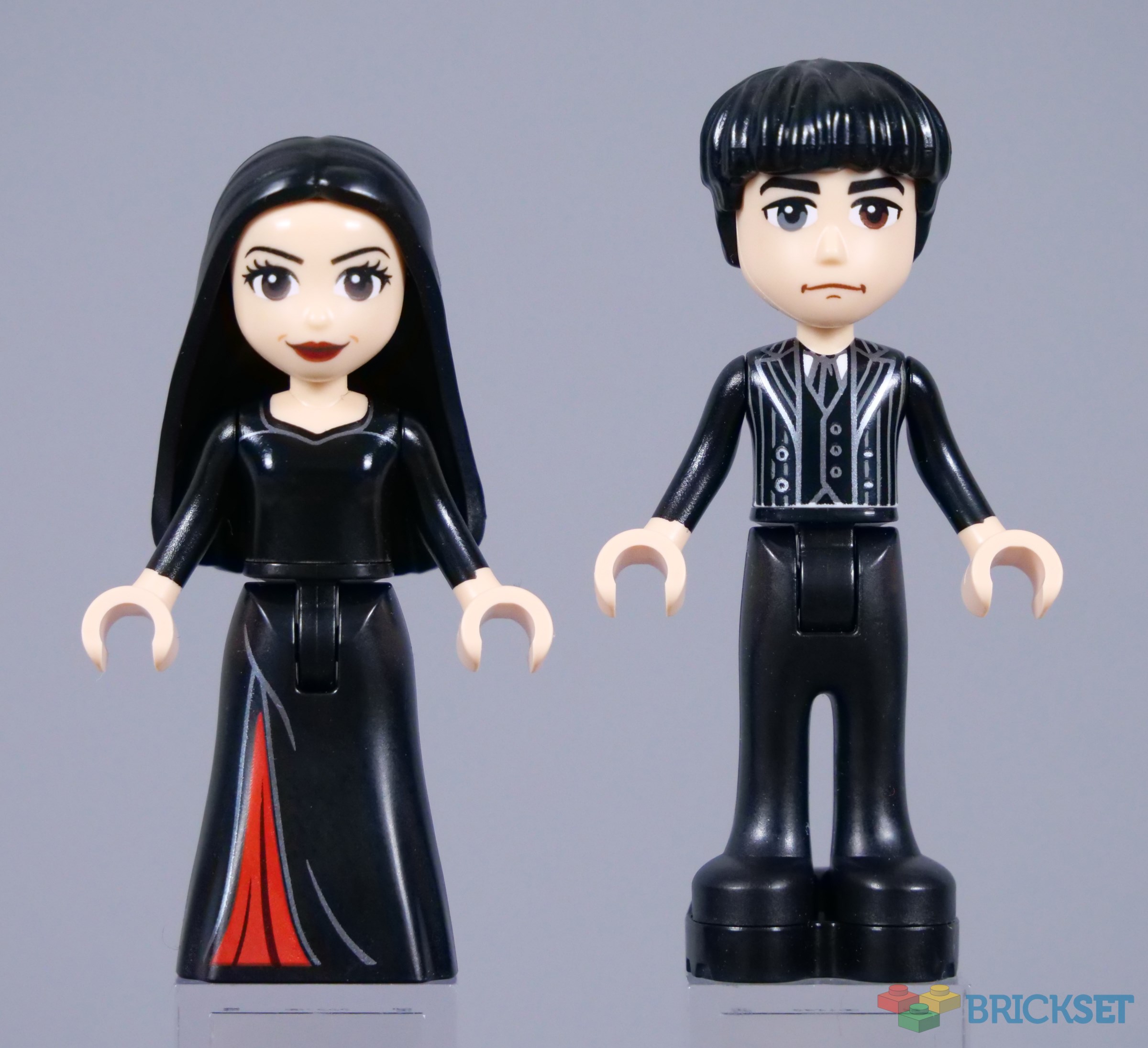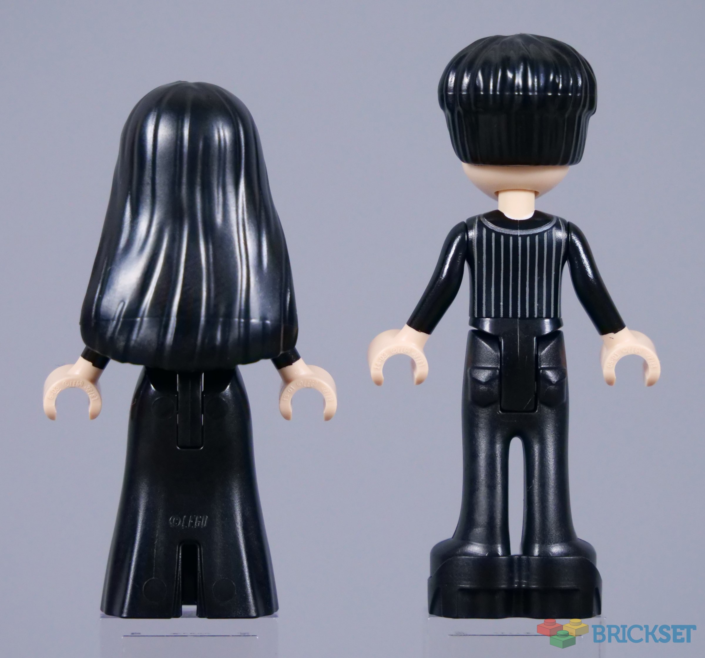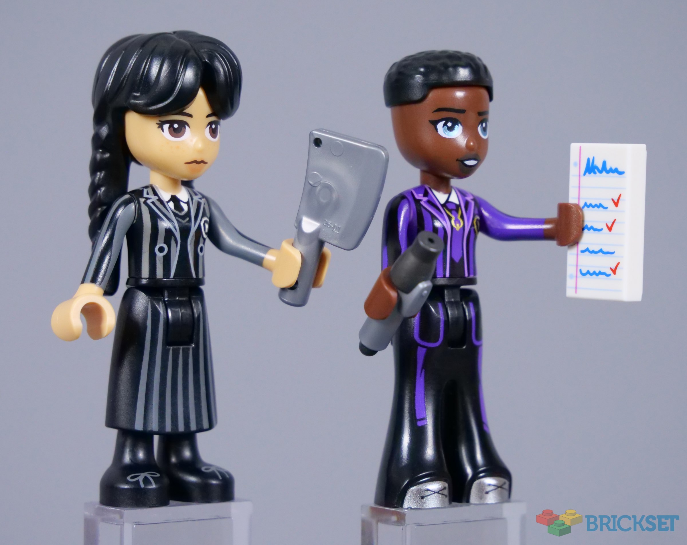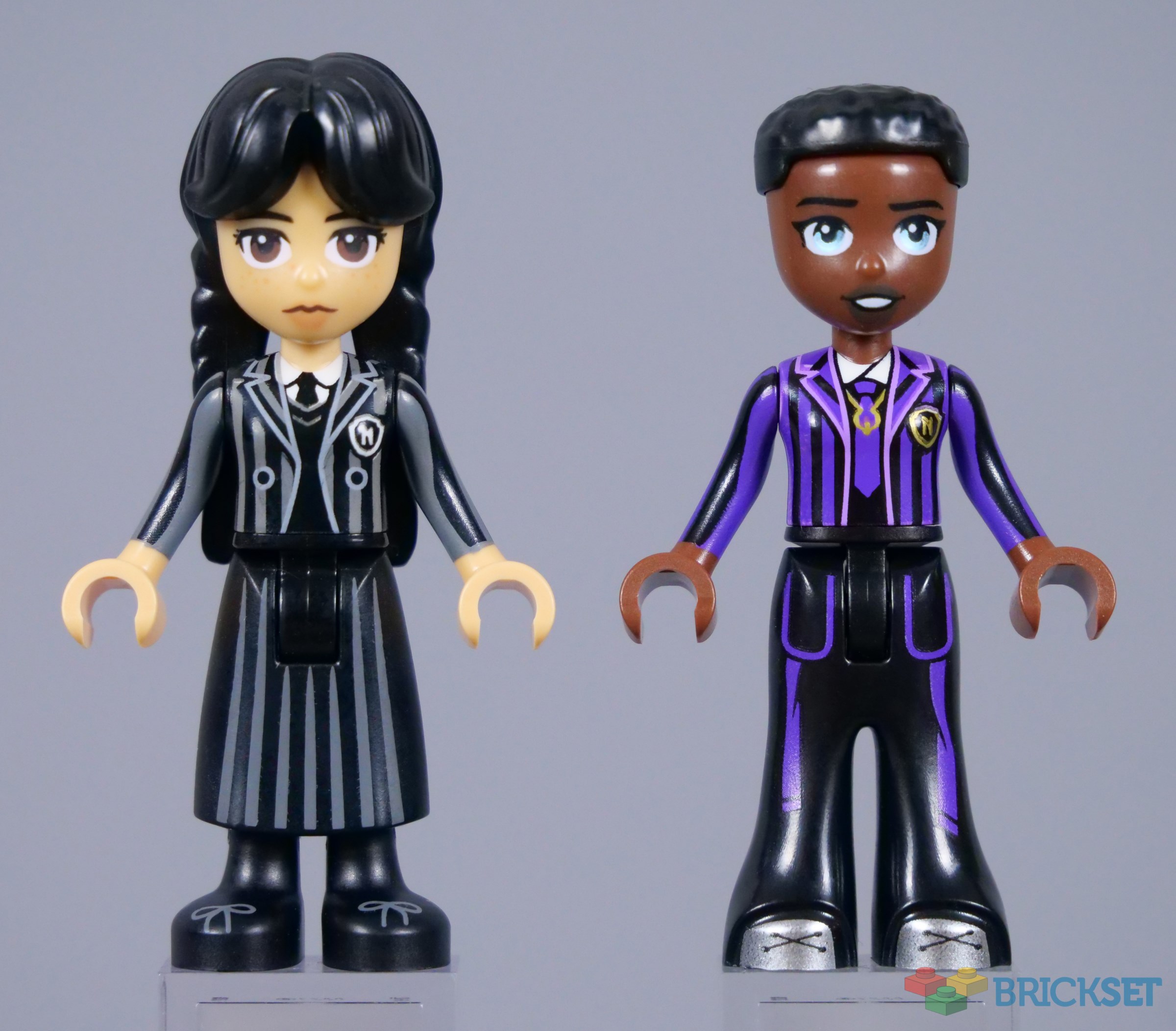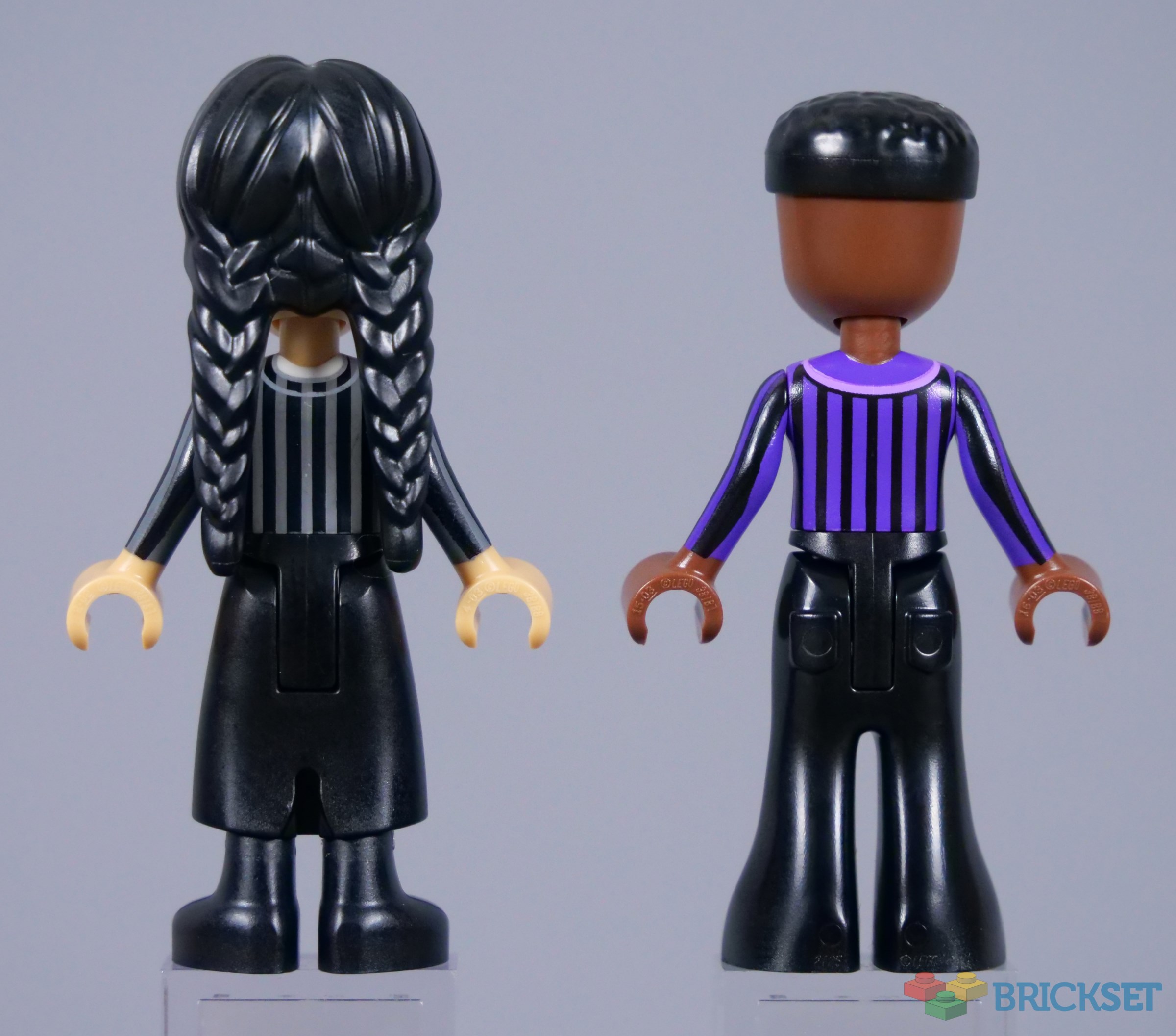 Wednesday Addams would never be seen in anything as colourful as purple, so she wears a unique black and grey Nevermore Academy attire, earlier found in 76781 Wednesday & Enid's Dorm Room. The details on her jacket and skirt look superb and I like the hairstyle designed for Wednesday, which is made from hard plastic rather than rubber.