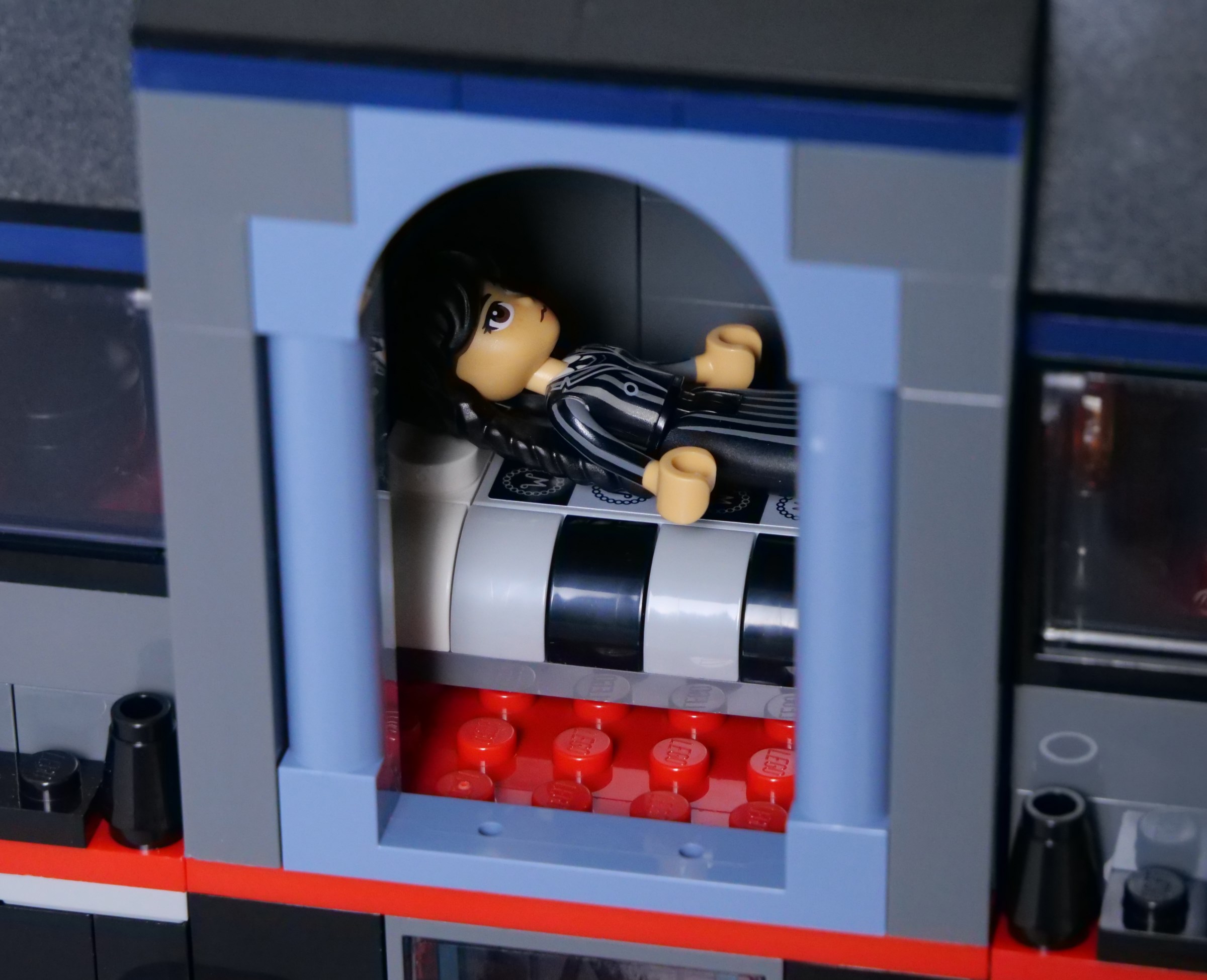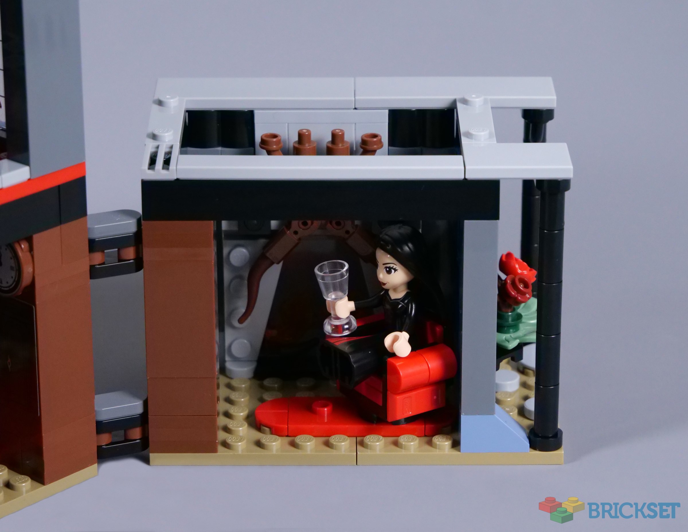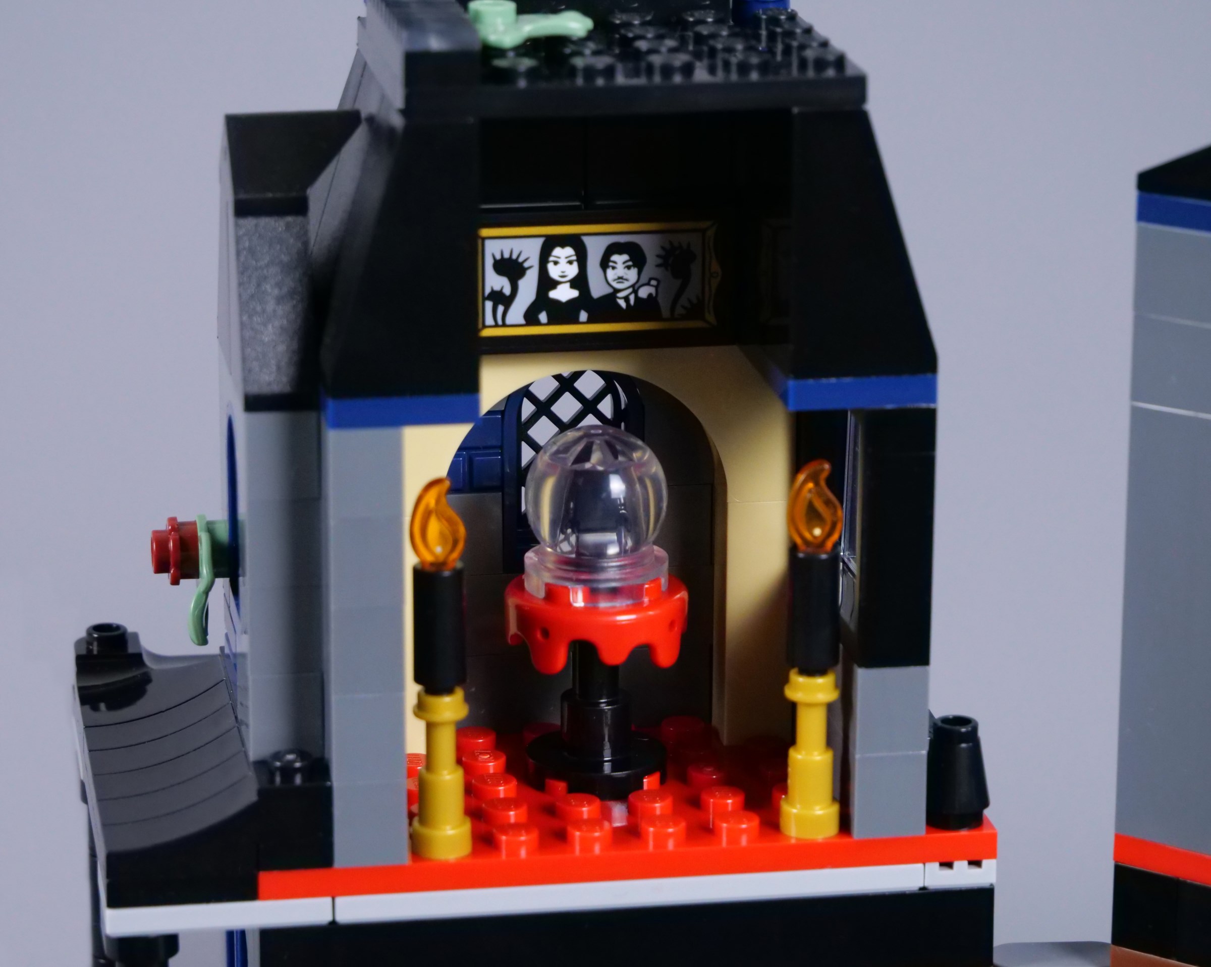 Some of us make space for a dedicated LEGO room, but Morticia's cottage contains a seance chamber! I like the red icing element forming a tablecloth, with a crystal ball on top. The sticker featuring Morticia, Gomez and Thing looks great too, although even this image shows how hard Gomez's translation to a mini-doll may be.