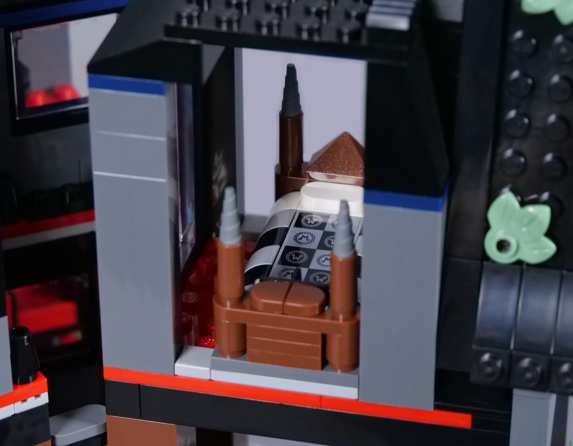 The bedroom is especially compact, but still accommodates an elegant wooden bed. I love the black and grey bedding with its chequered design and alternating 'M' and 'W' icons, so this bed could belong to Morticia or Wednesday. Either mini-doll can lie down on the bed, even with their substantial hair elements.