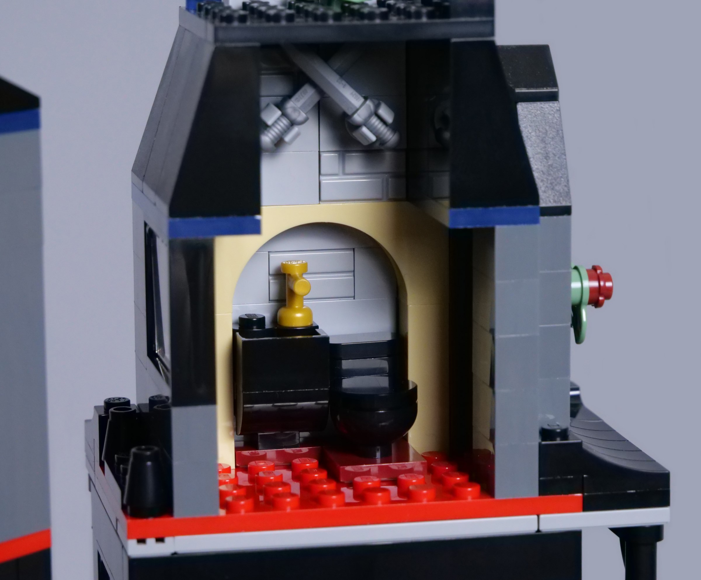 Morticia places an elaborate settee in the living room during the show, so it is a shame there is only room for an armchair here. Its colour is accurate though and a sticker adds some detail on the seat. Similarly, the fireplace looks splendid and you can throw the Codex Umbrarüm into the fire, hence the removable panel on the chimney to retrieve the book from behind the flames.