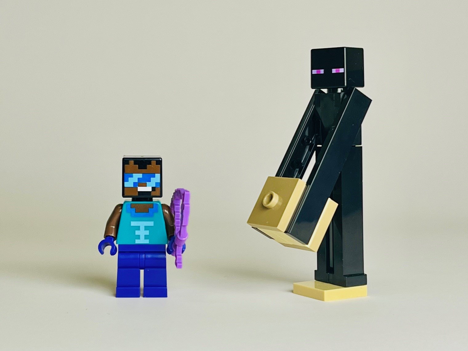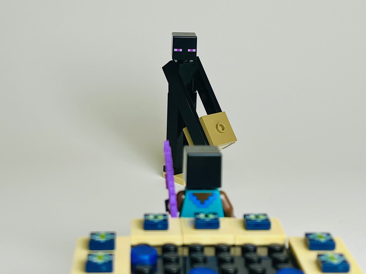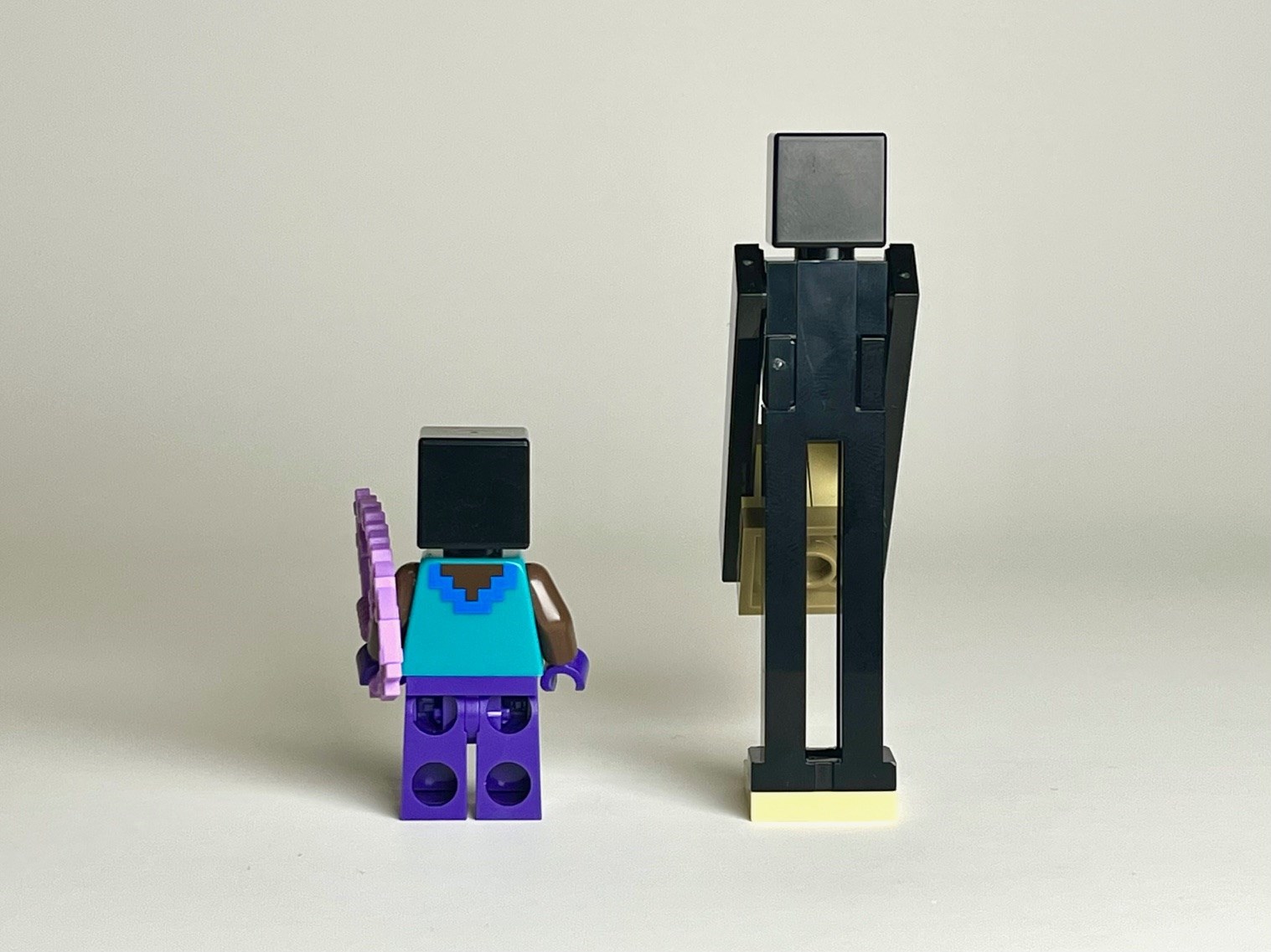 An Enderman is also included. This mob has only appeared in the range nine times over the course of eleven years, and this is the cheapest set to contain one thus far. This set might be many LEGO Minecraft fans' first time encountering the Enderman figure, as it was for me. These neutral mobs spawn in all three dimensions, but are most commonly found in the End, and will attack those who harm them or stare at them directly in the eyes.