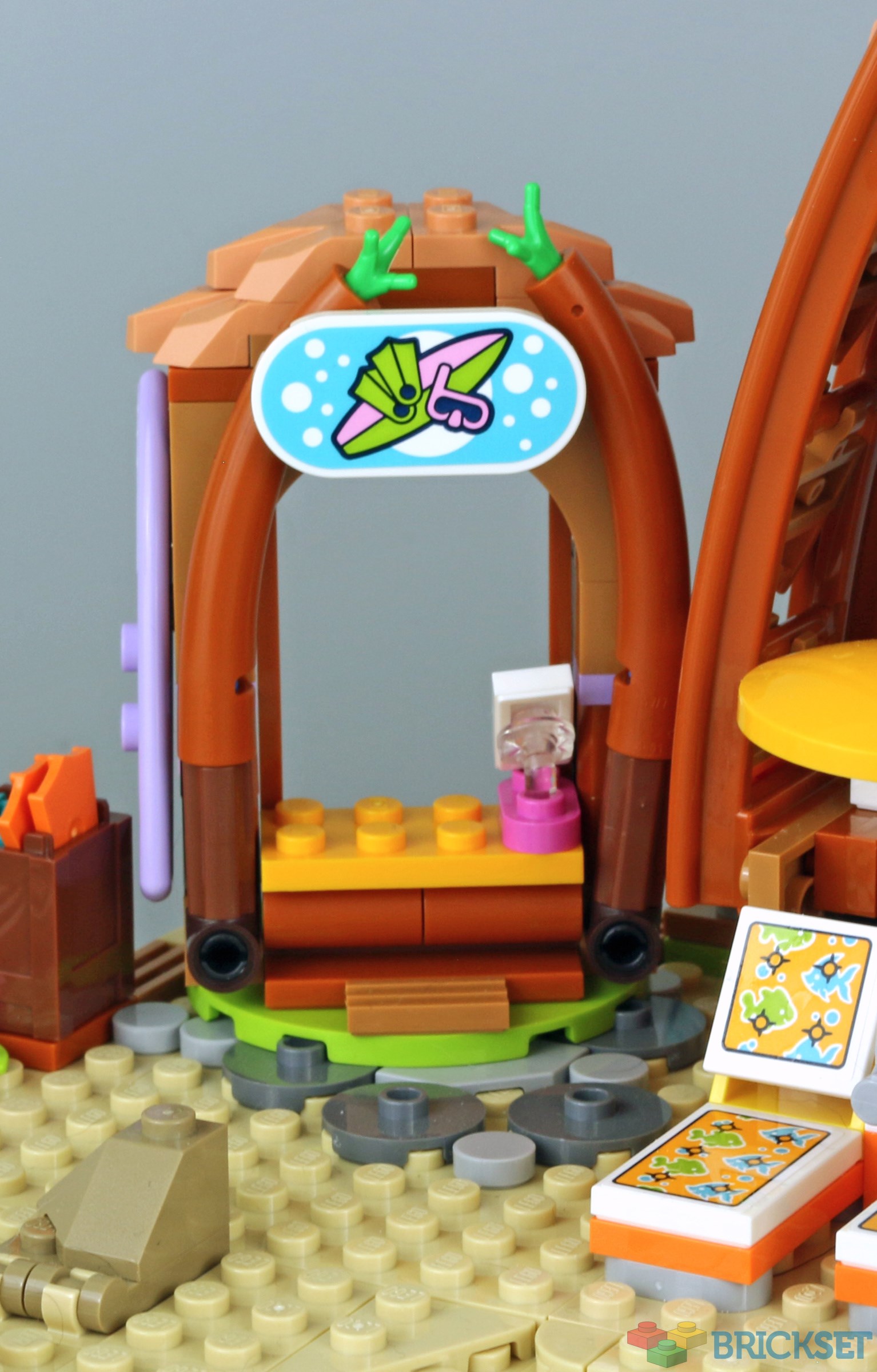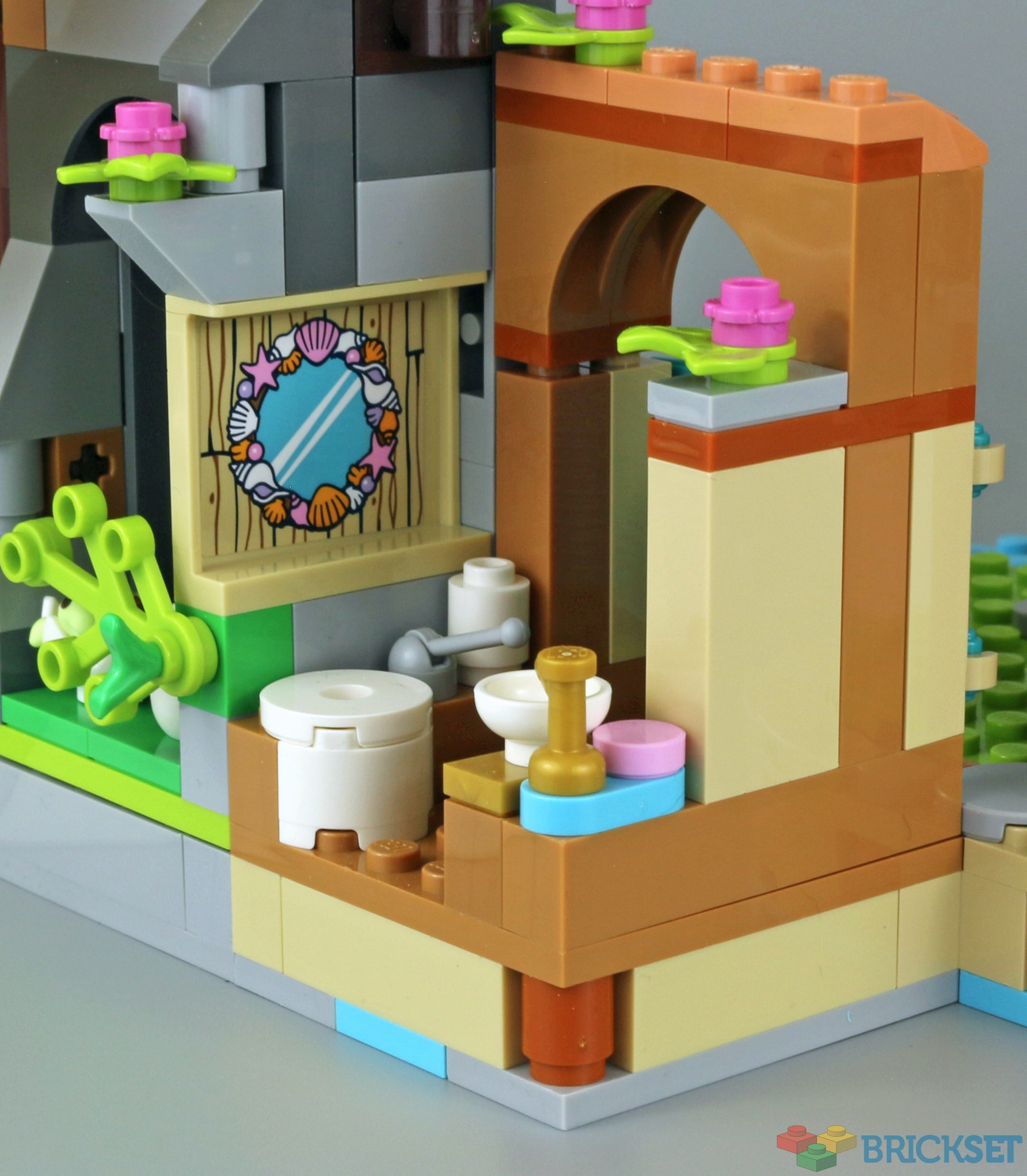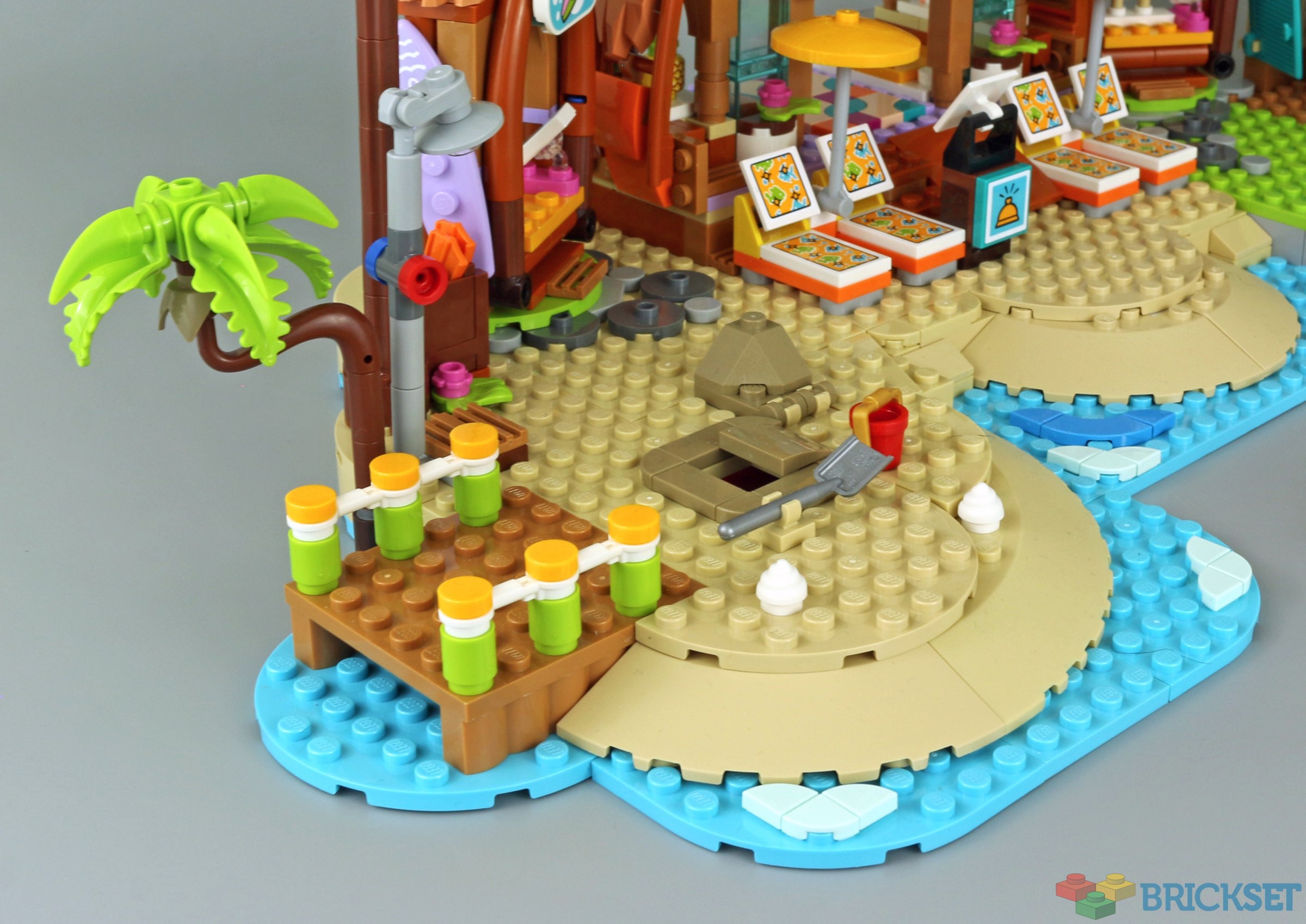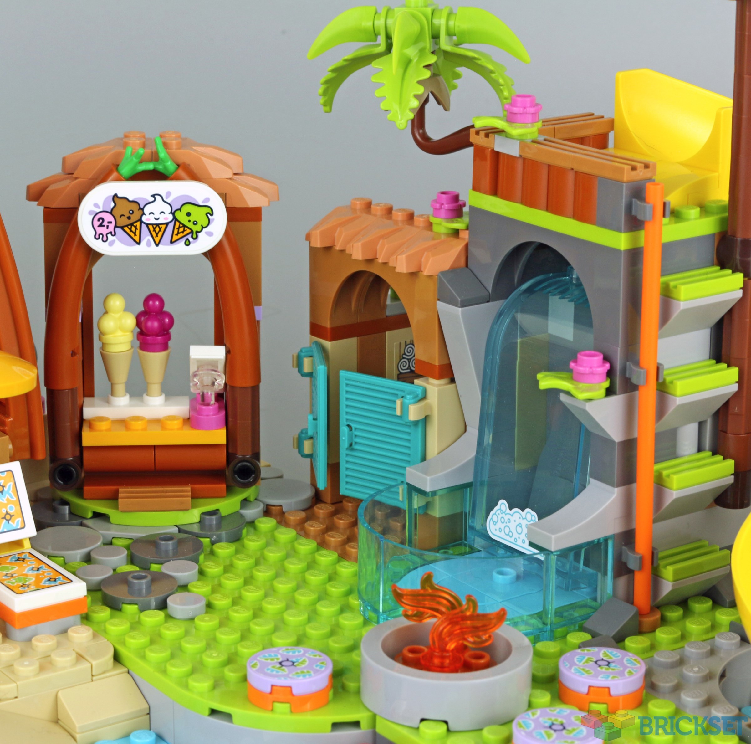 This set checks all the boxes of what you'd expect to see in a large Friends set - cute animals, a slide, some food pieces, some small moving functions, and of course, a bathroom. The use of roller coaster rail pieces for the framing of the resort is novel and quite effective with the rock pieces as thatching.