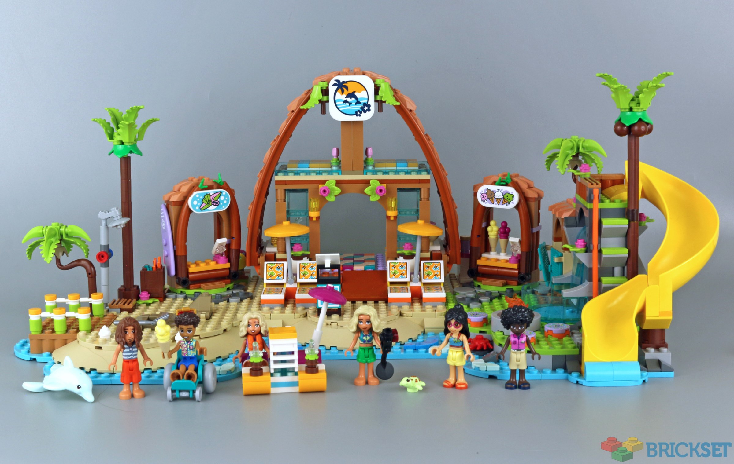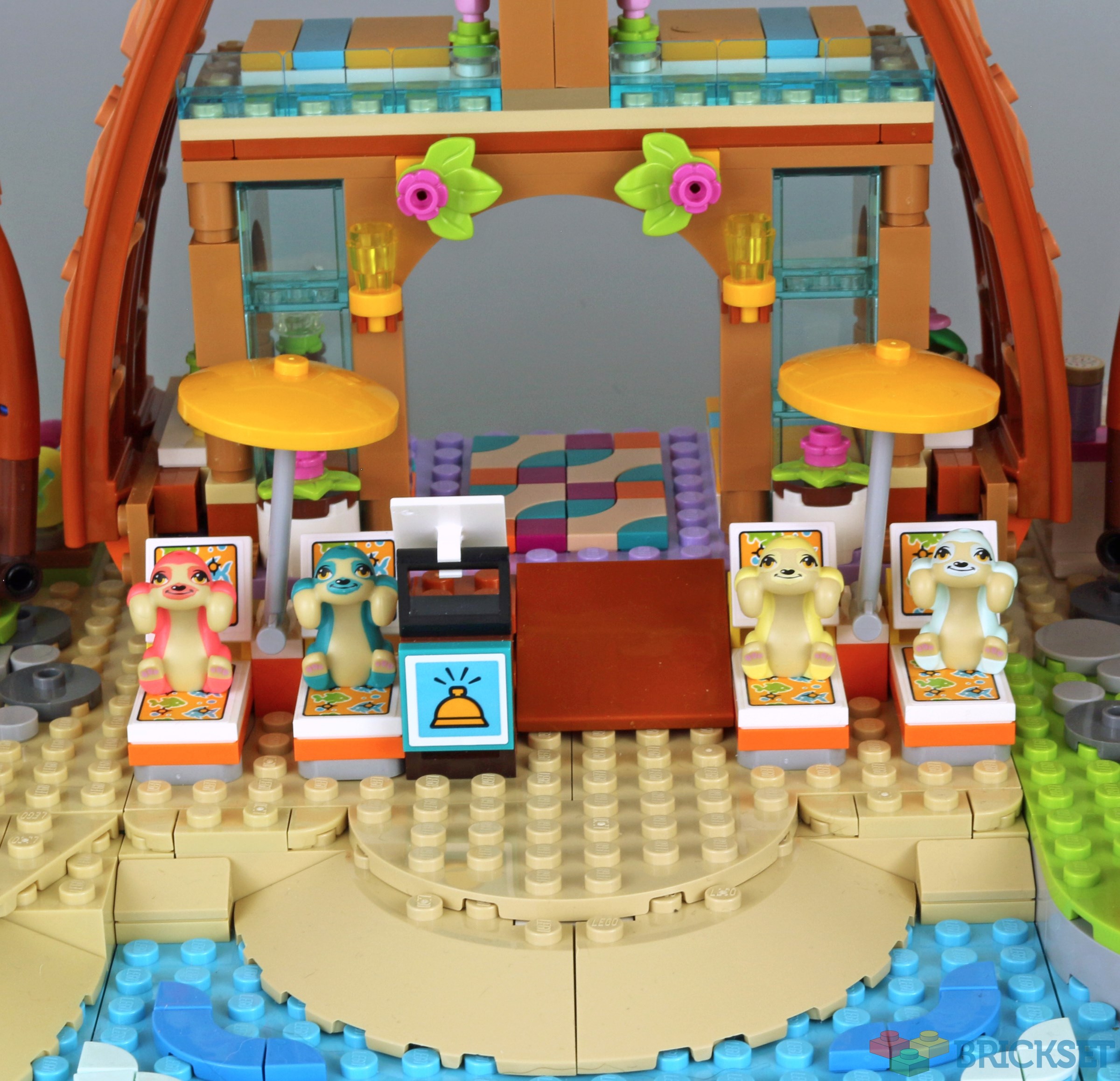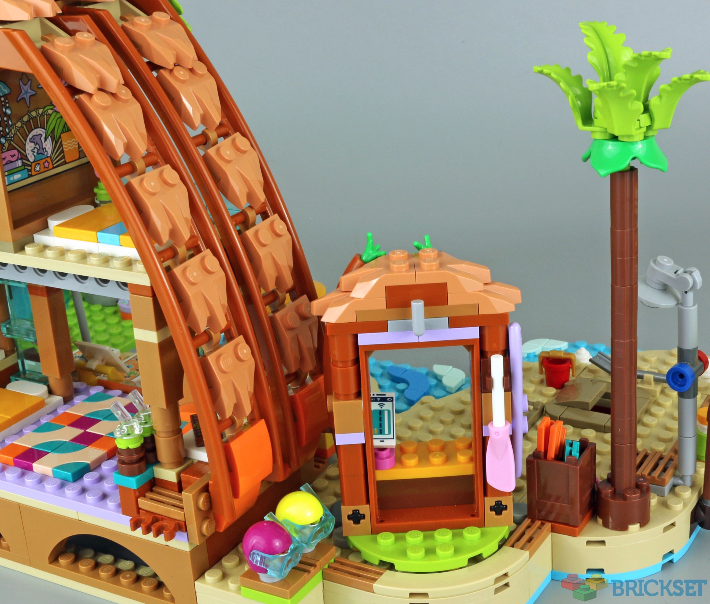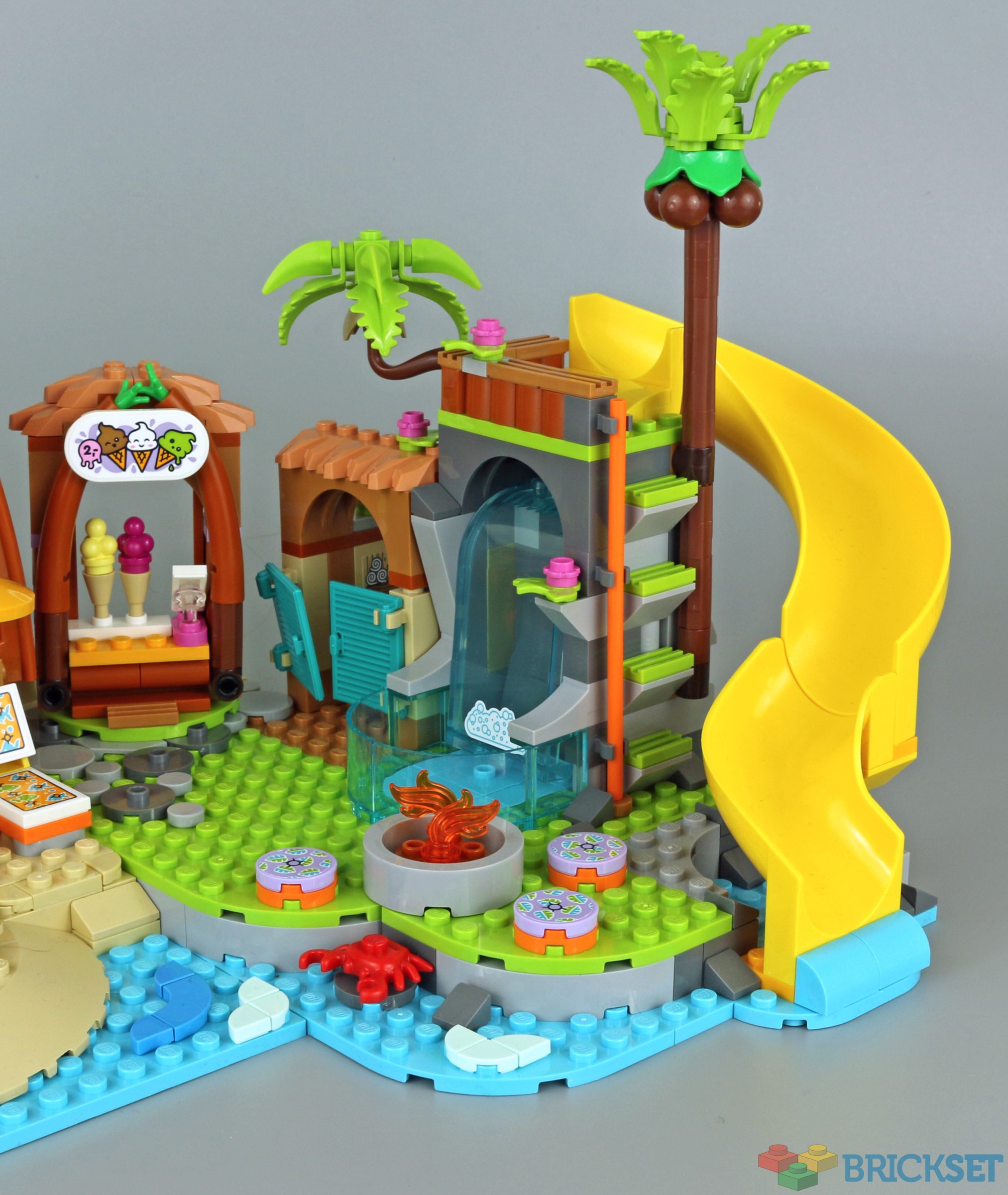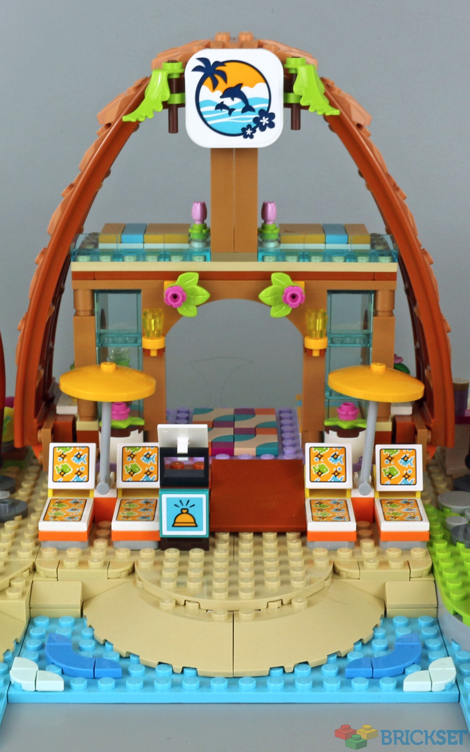 This set checks all the boxes of what you'd expect to see in a large Friends set - cute animals, a slide, some food pieces, some small moving functions, and of course, a bathroom. The use of roller coaster rail pieces for the framing of the resort is novel and quite effective with the rock pieces as thatching.