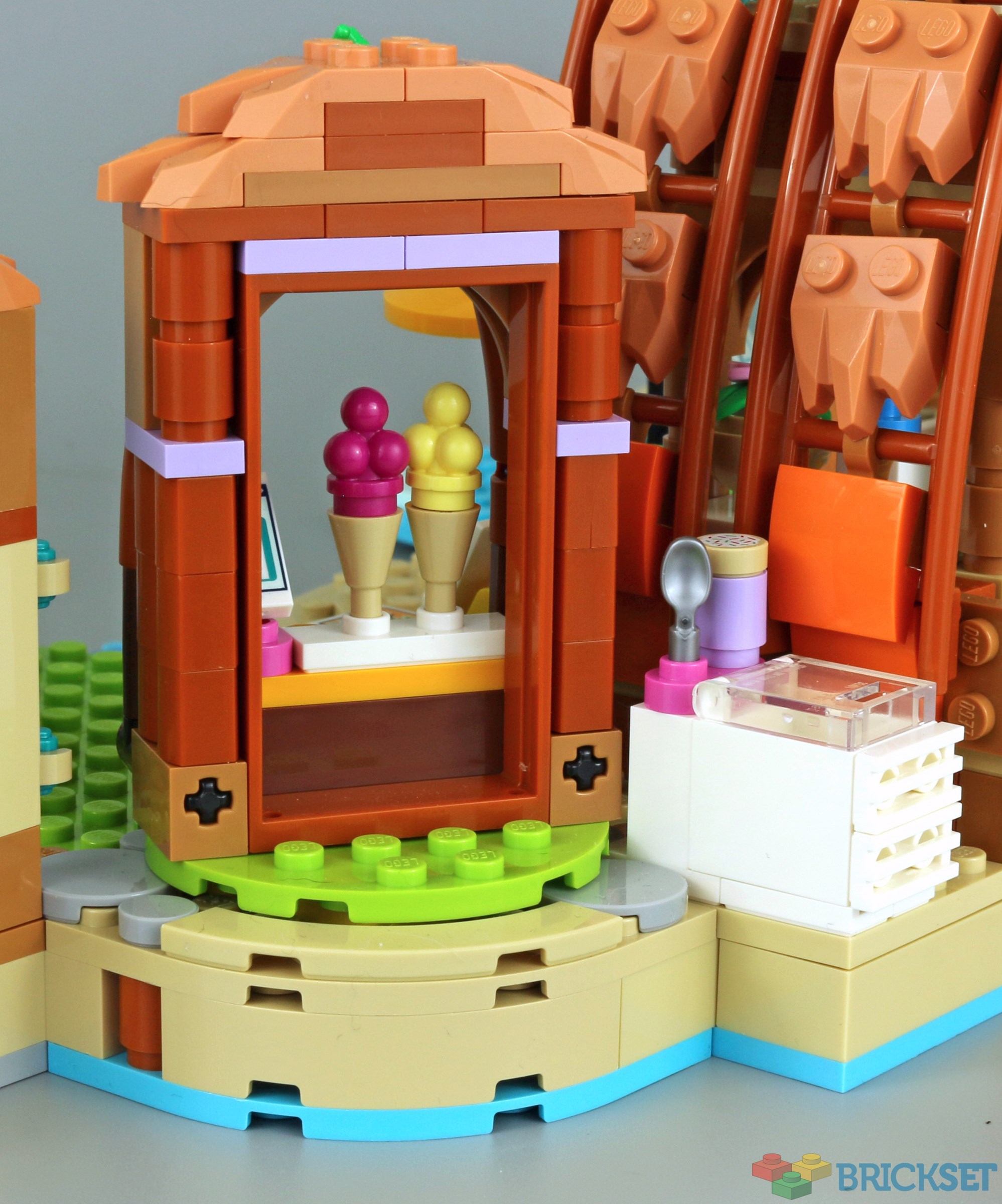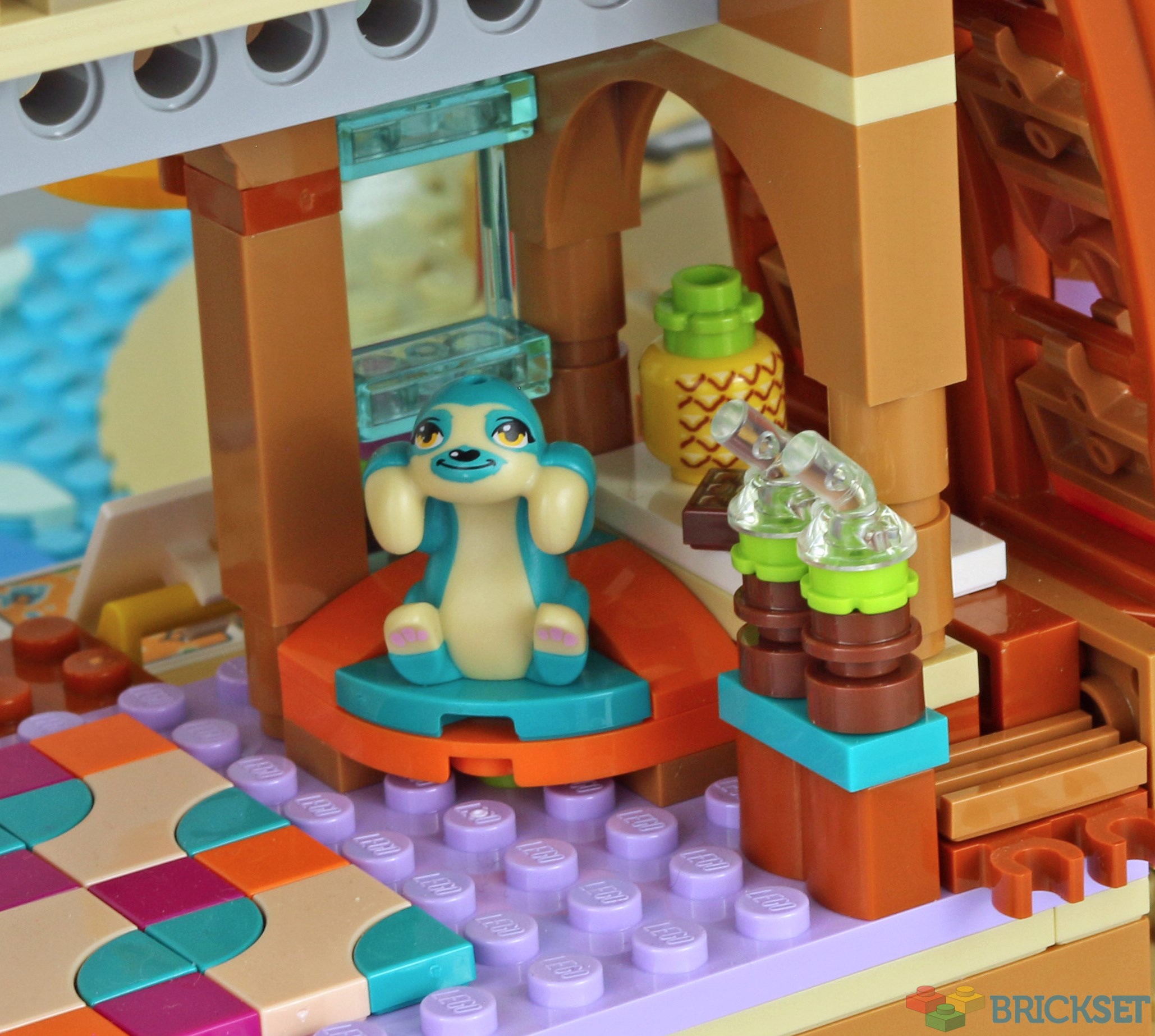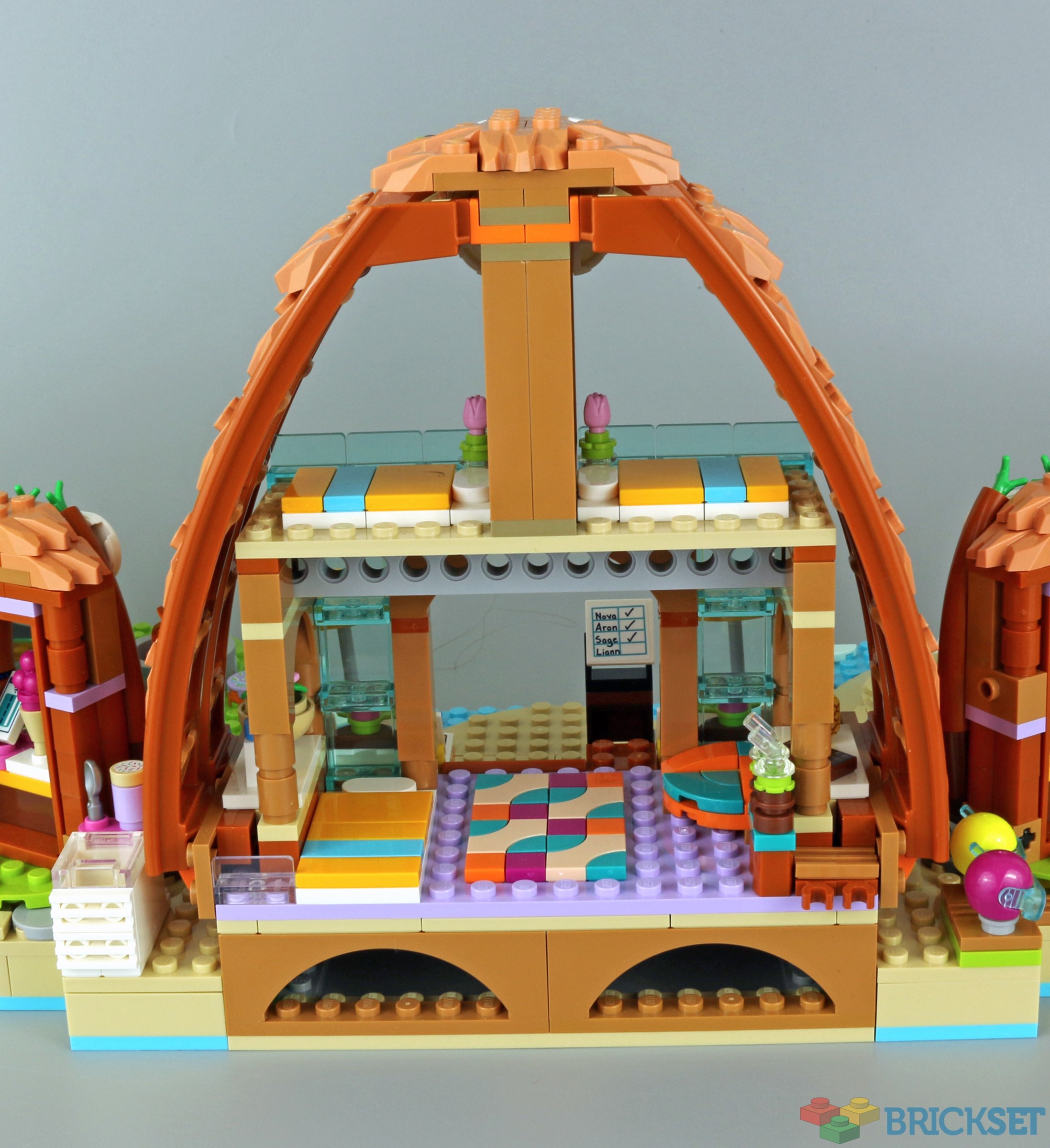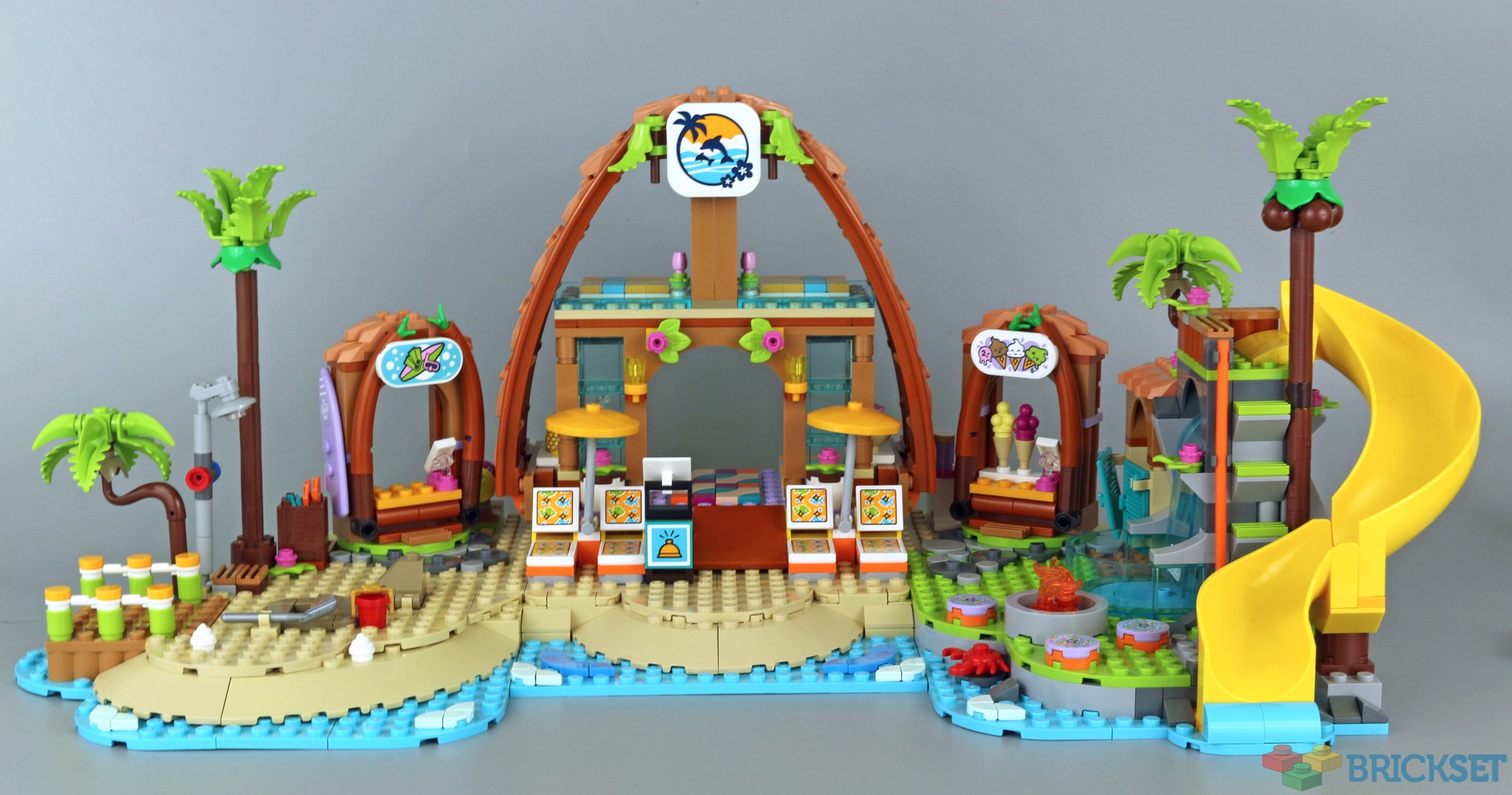 This set checks all the boxes of what you'd expect to see in a large Friends set - cute animals, a slide, some food pieces, some small moving functions, and of course, a bathroom. The use of roller coaster rail pieces for the framing of the resort is novel and quite effective with the rock pieces as thatching.