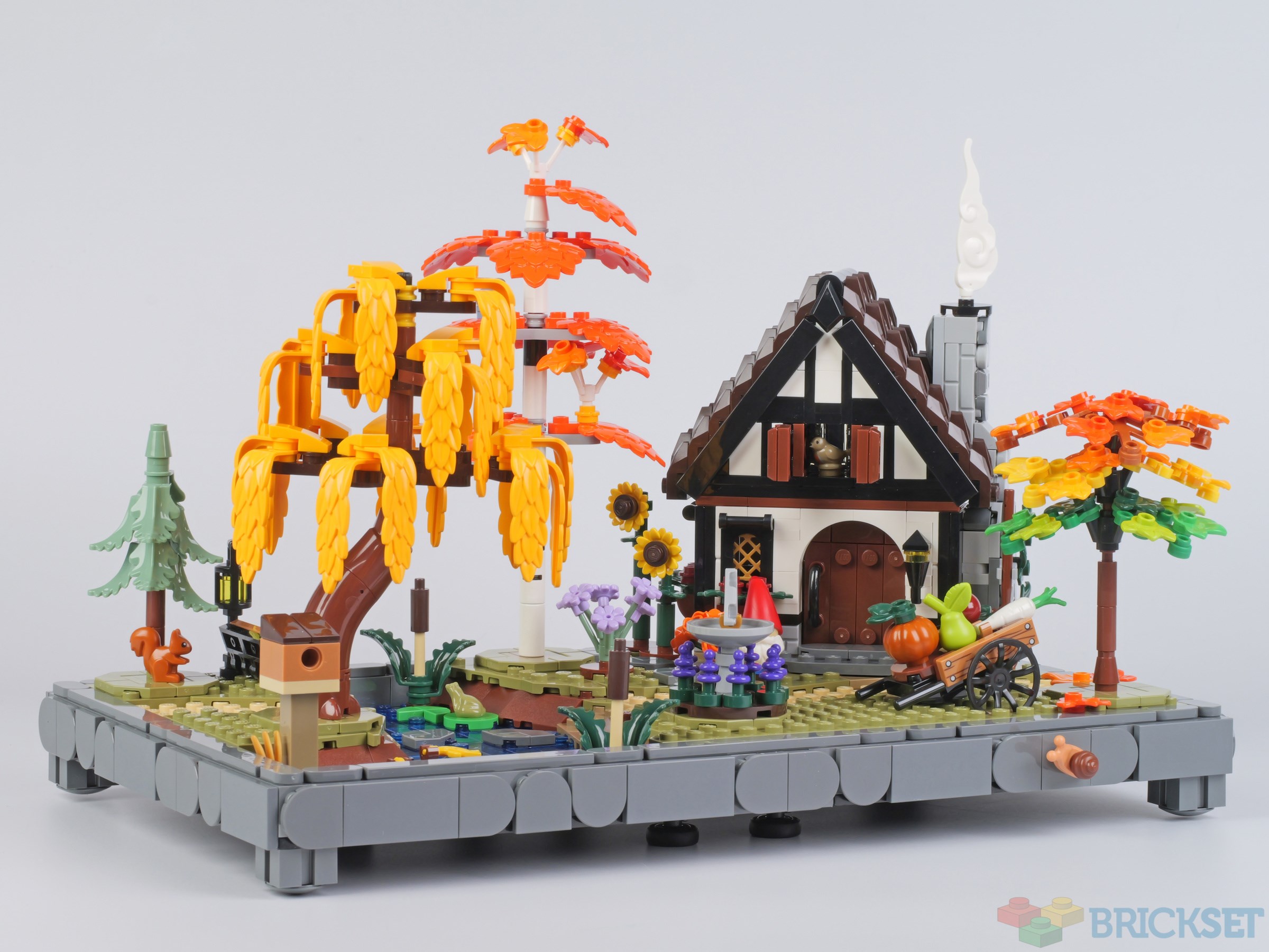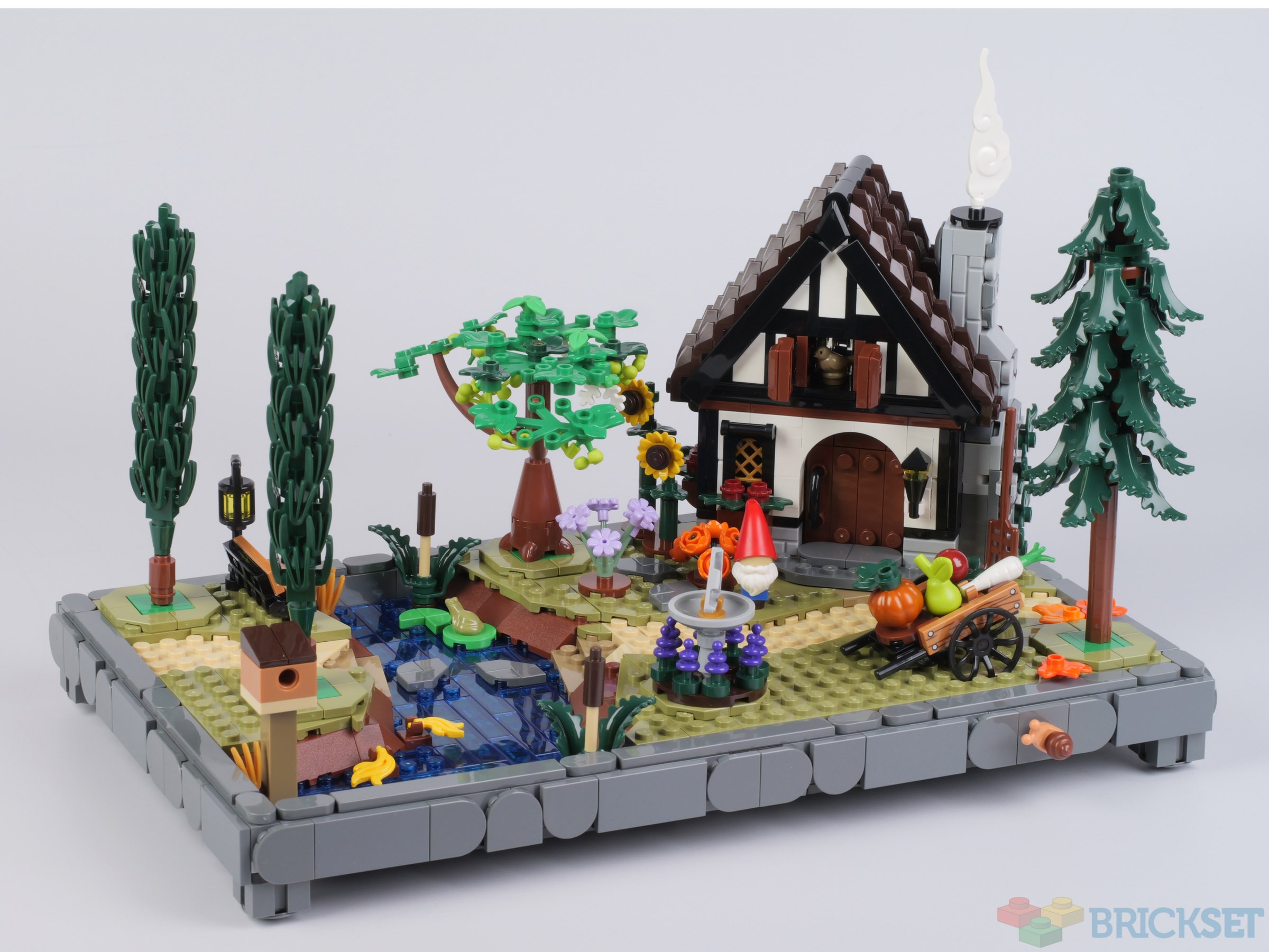 This is what it looks like before the trees are added. Note the gnome by the front door, sunflowers, produce-laden cart, stepping stones across the stream, reeds growing on the bank of it. It's certainly an idyllic scene.