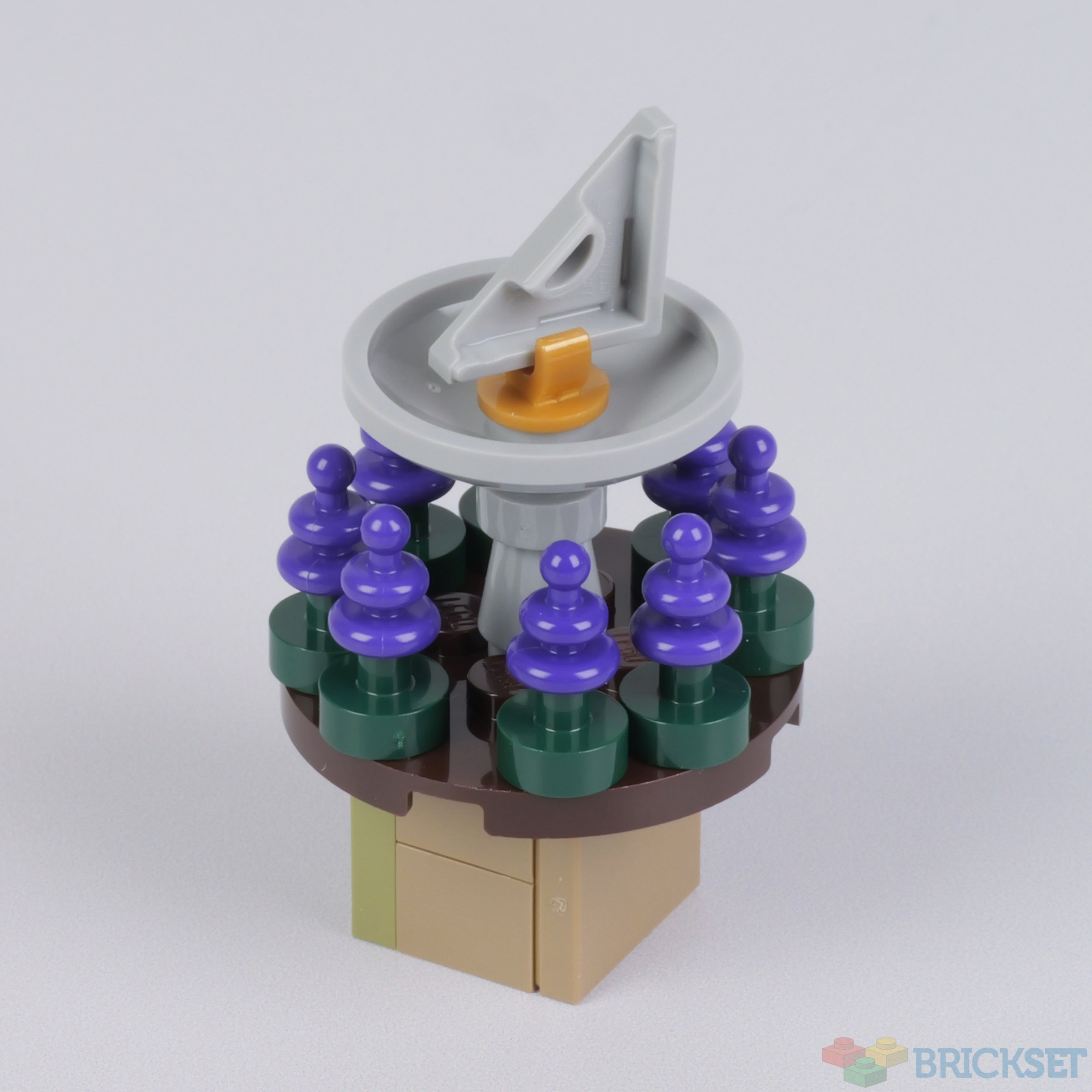 Additionally, there's a sundial surrounded by sage, made with 'Headwear Accessory Vintage Sci-Fi Antenna' which has been used on the heads of minions and collectable minifigures.