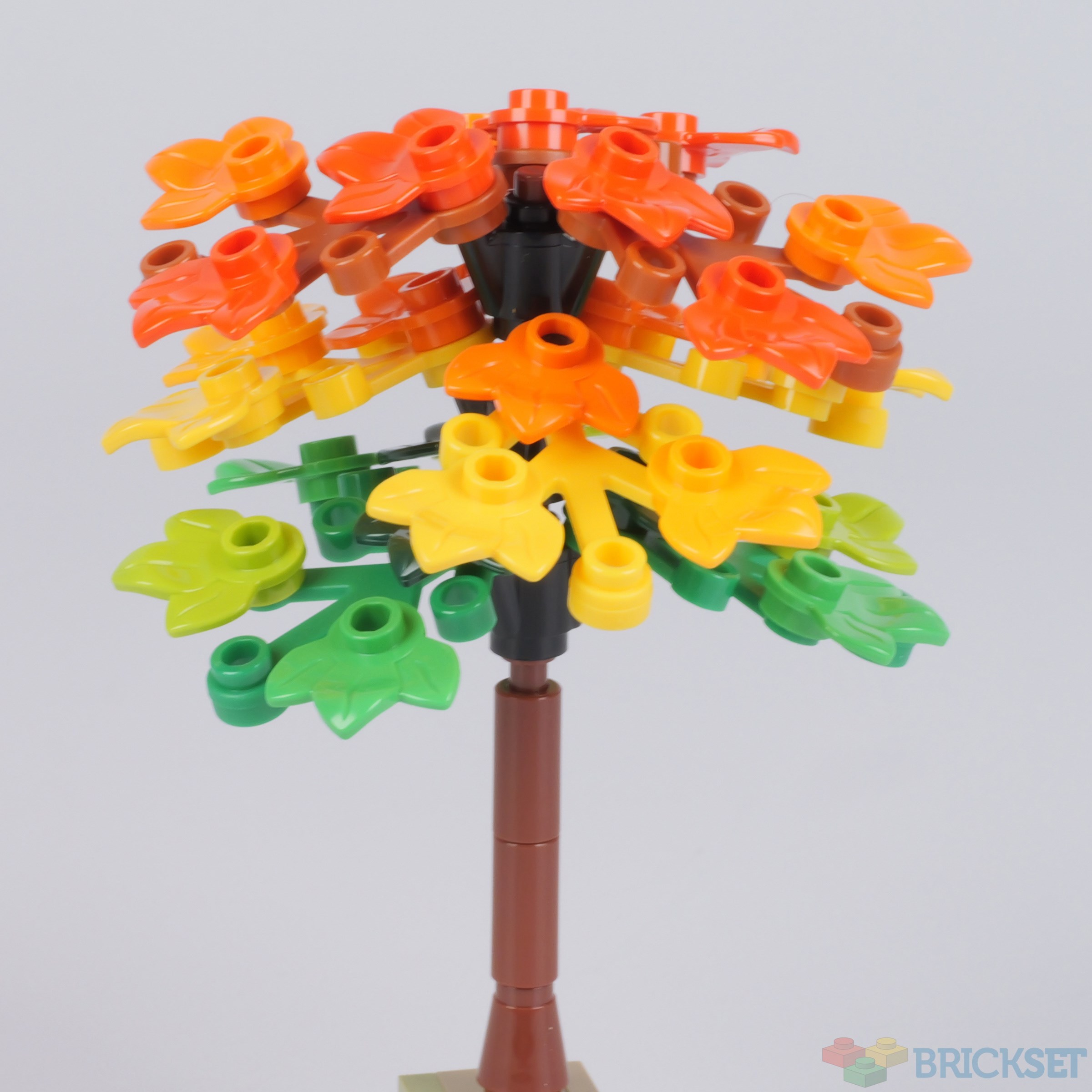 The tree could be a Liquidambar styraciflua, sometimes known as the traffic-light tree and has maple type leaves. In a good year all 3 colours can be seen simultaneously. Though the Lego version is rather garish.