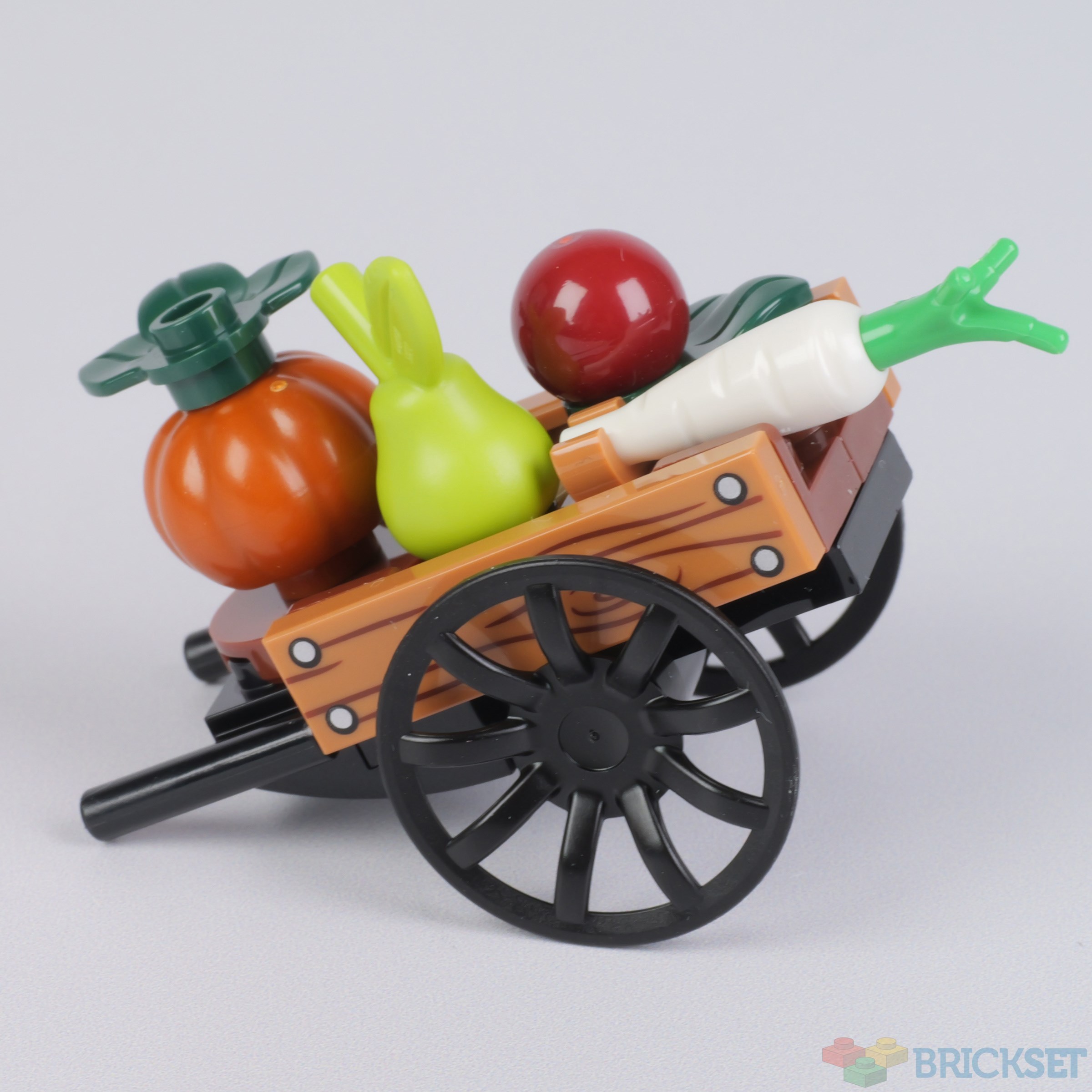 The cart's wheels slot into two grooves in the base and among the produce upon it is a pear, which is new this year, a dark orange gourd, and a parsnip.