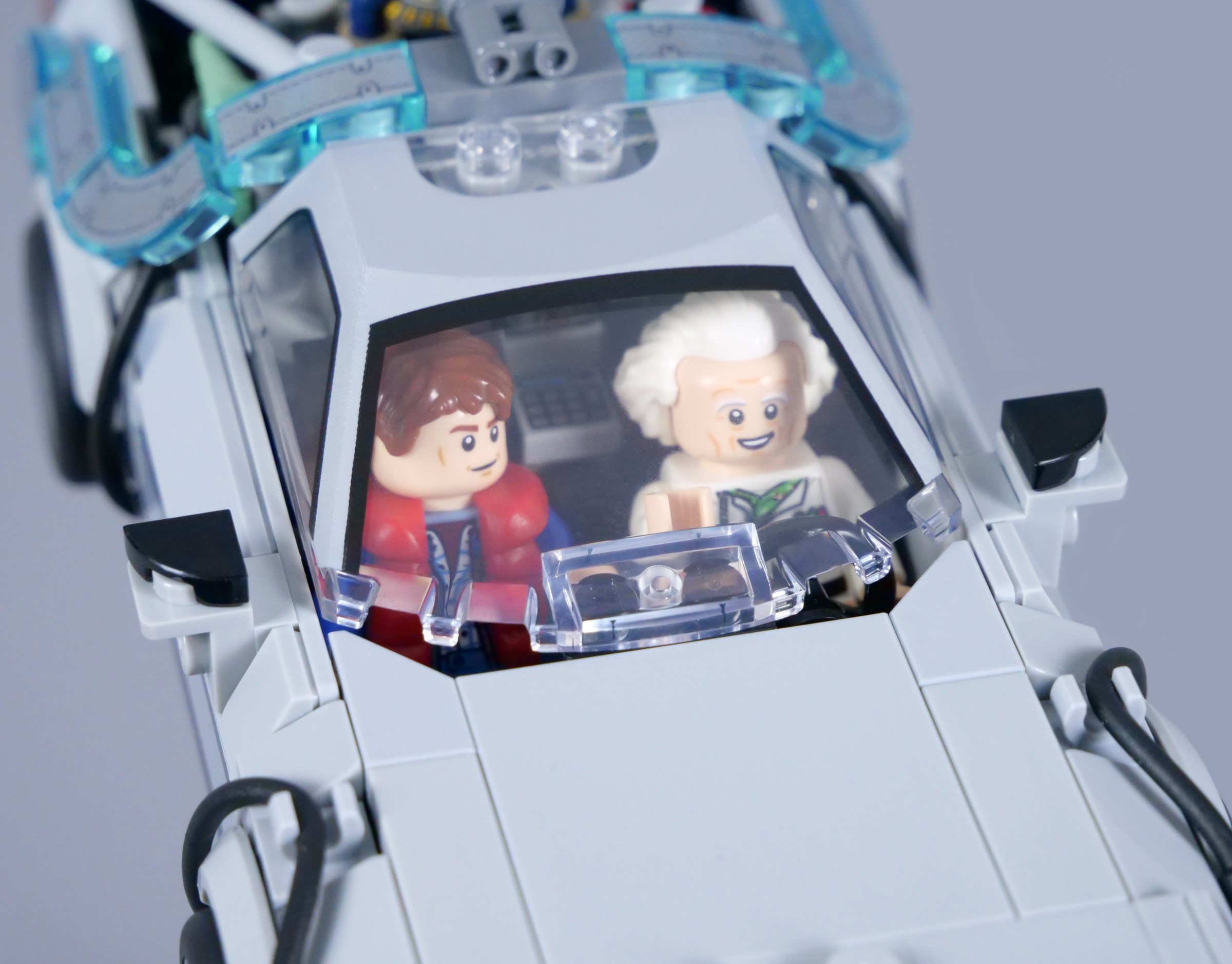 There is enough space for Doc and Marty inside, even though the side windows are angled in quite severely. Maybe a new windscreen piece could have been created, with a five-stud-wide roof and therefore steeper sides, but the existing component works well enough for me.