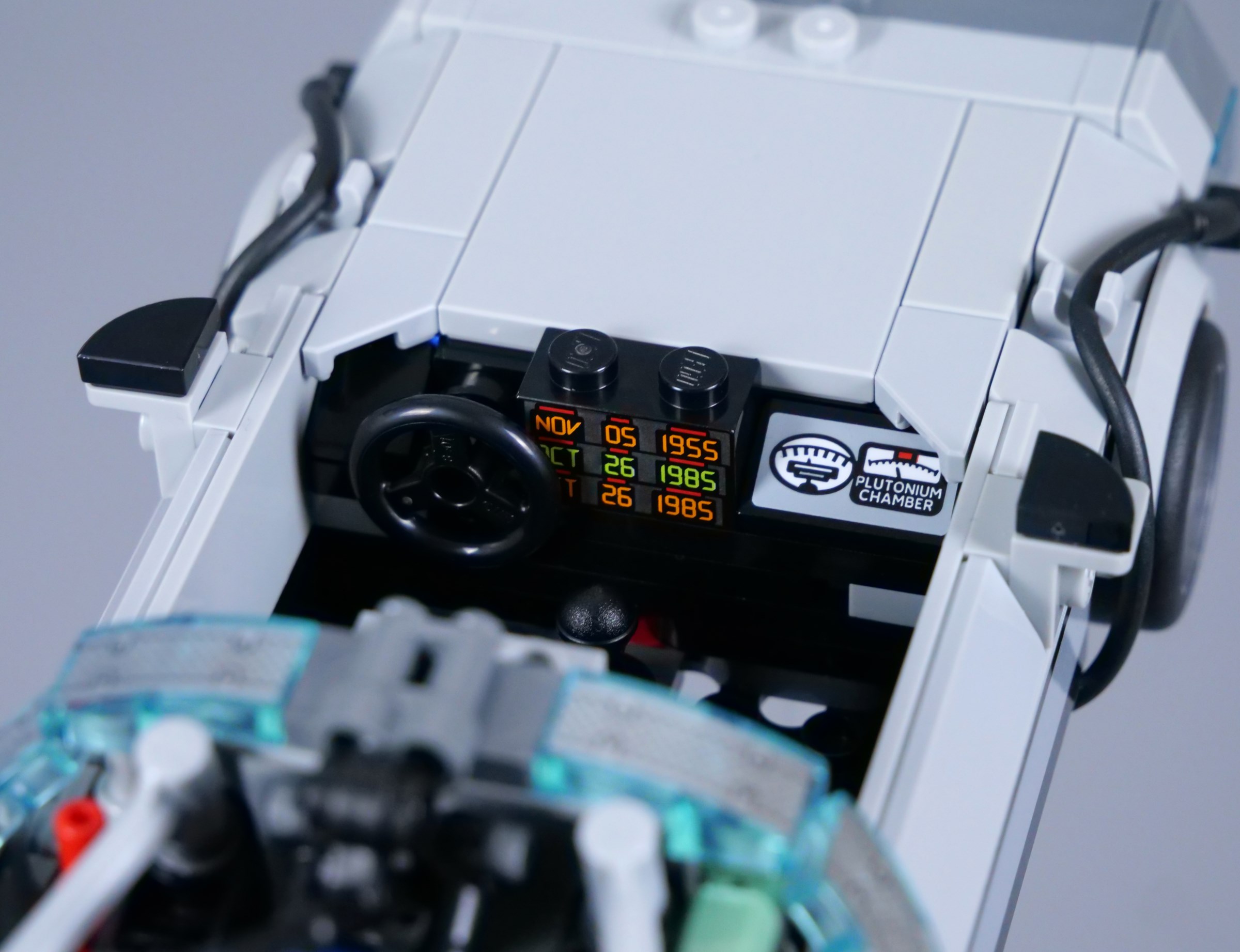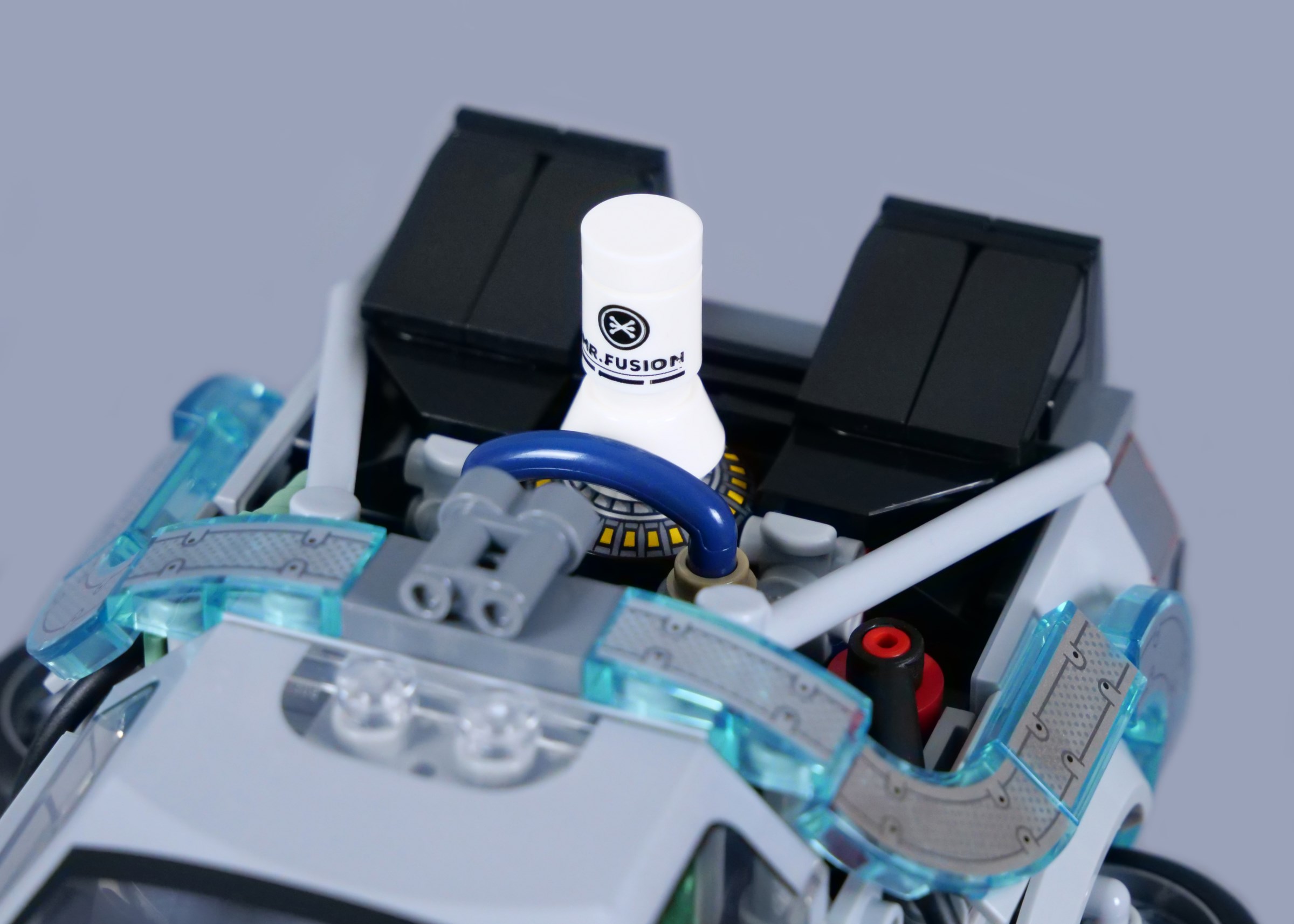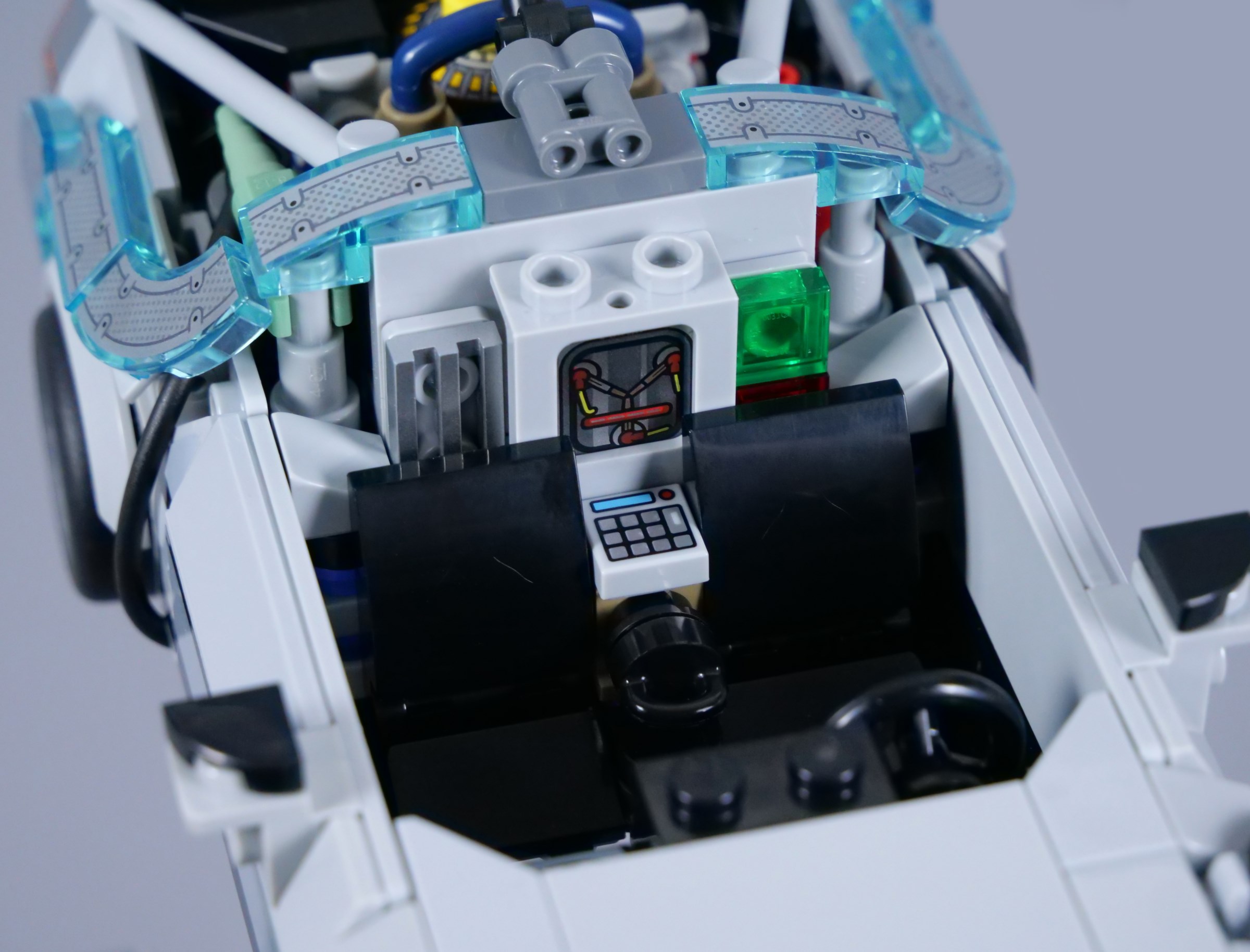 Like the time circuits display, the flux capacitor is printed and correctly positioned between the seats. This design is too small for text to be legible, which is one way of avoiding the infamous 'SHEILD' misspelling found on the flux capacitor in 21103 The DeLorean Time Machine!