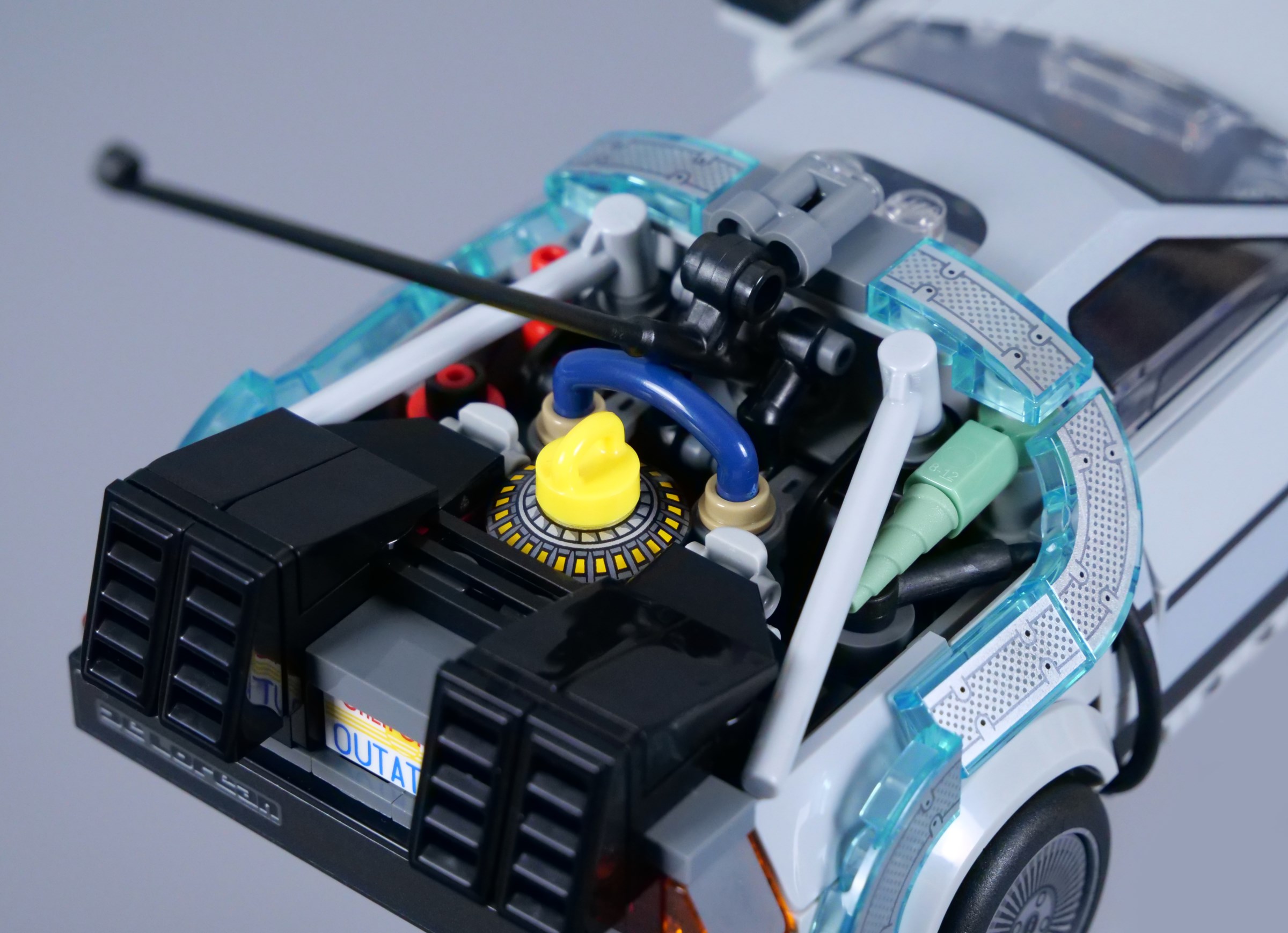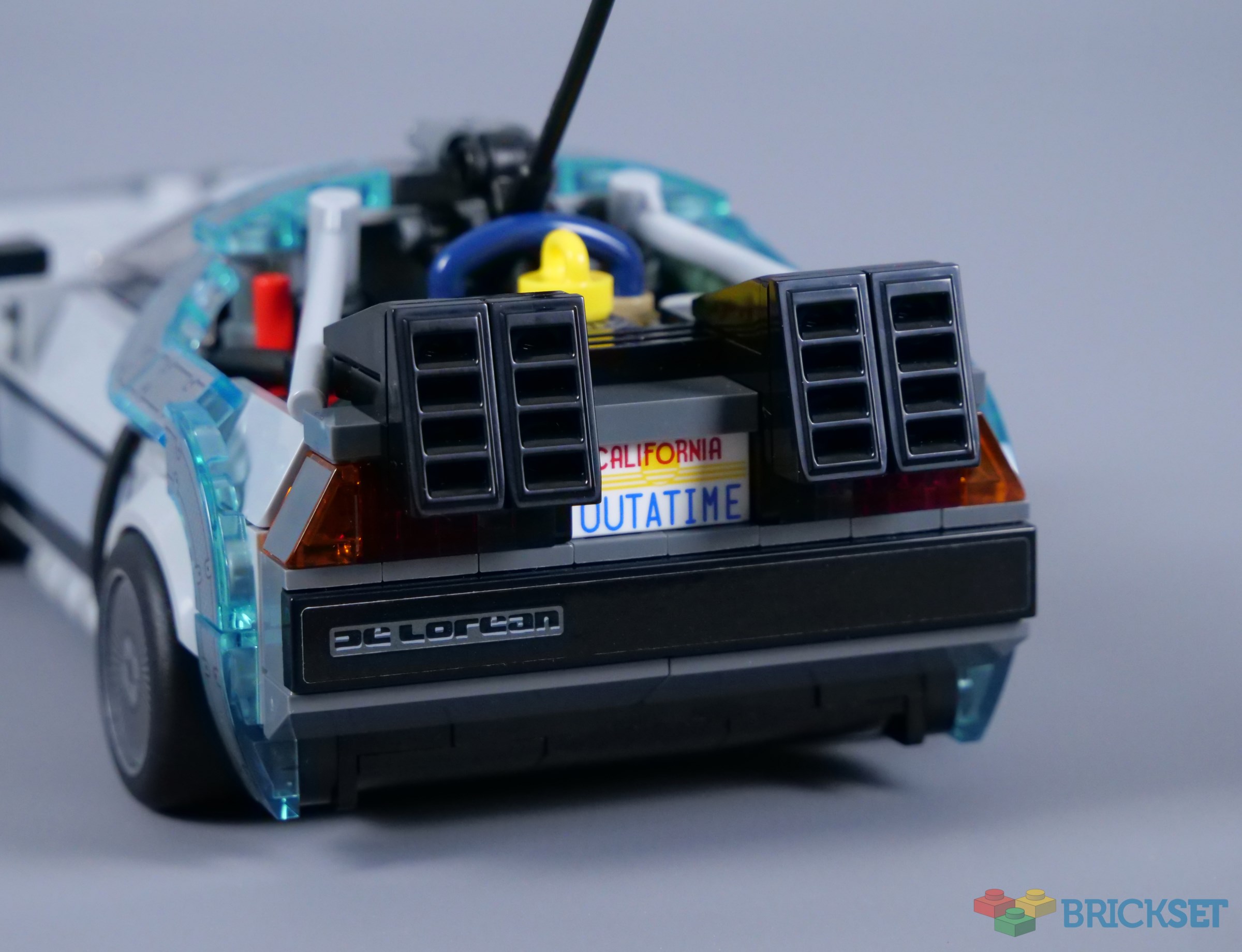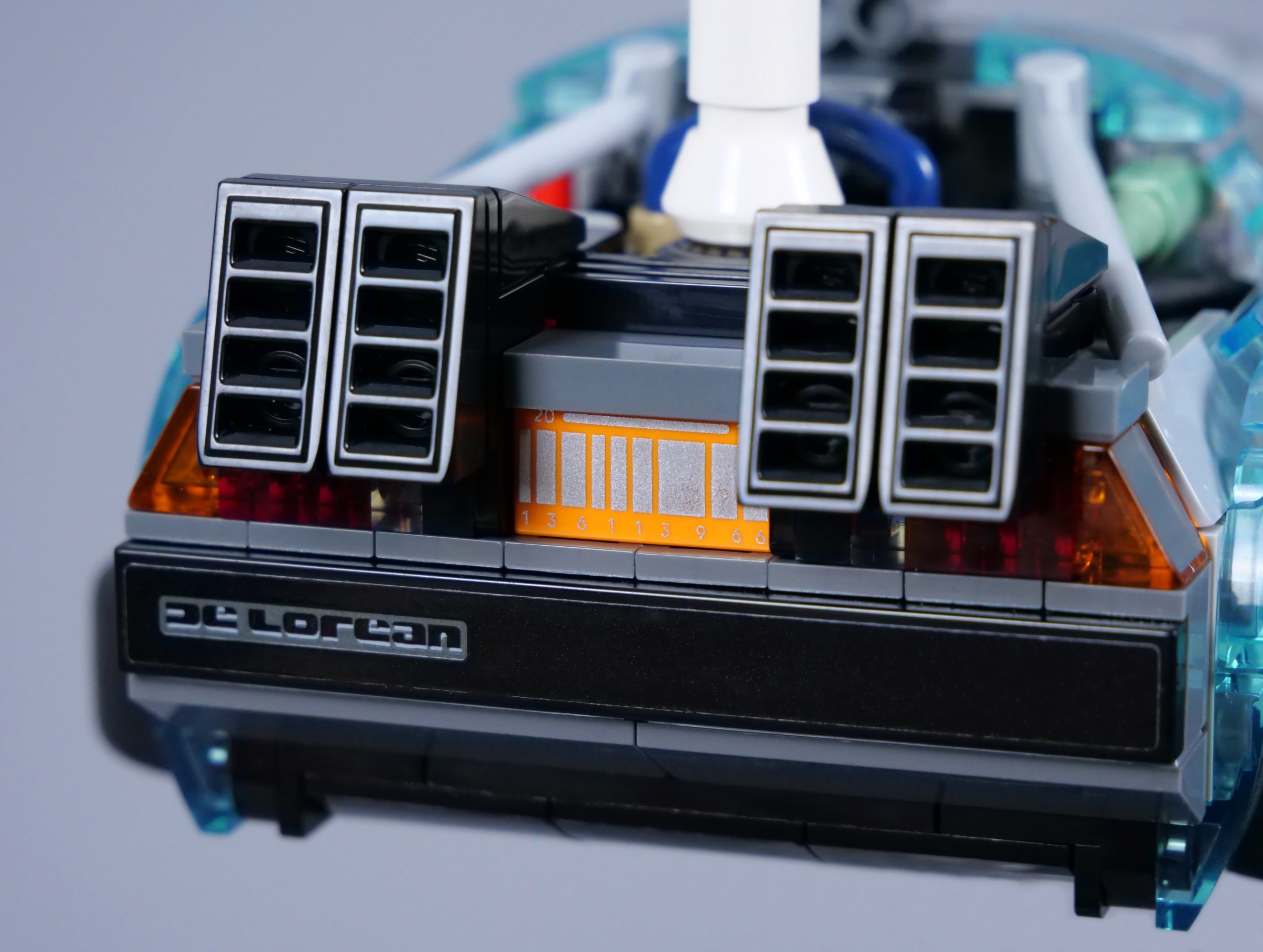The all-important 'OUTATIME' number plate is included, printed on a 1x2 tile and matching the film exactly. The 1x8 tile underneath uses a final sticker for the DeLorean branding, while trans-red, trans-orange and trans-clear plates and slopes comprise the rear lights.
