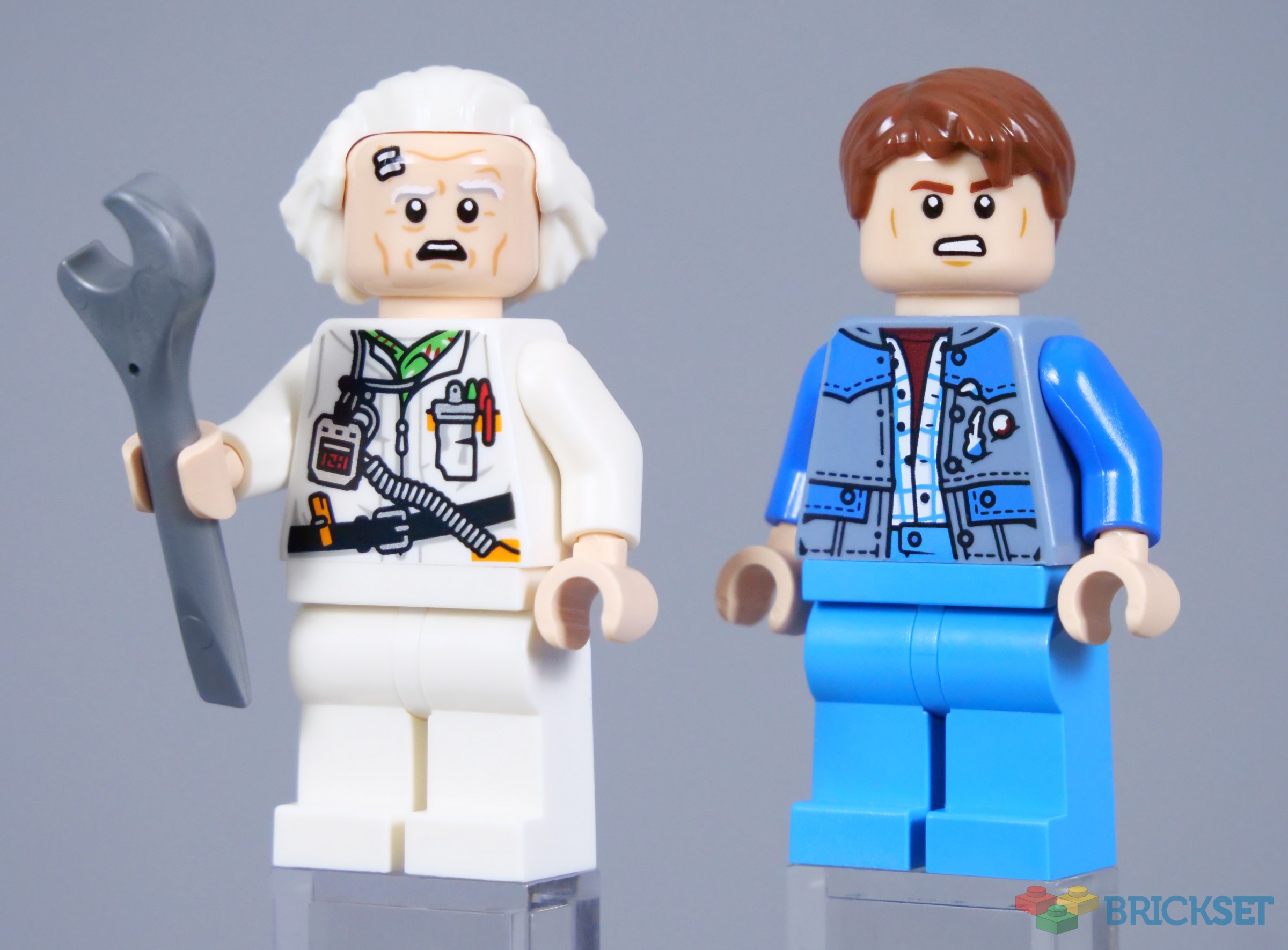 Marty features a common double-sided head initially designed for Han Solo, though also used for Marty in 10300 Back to the Future Time Machine. Doc Brown's head is unique though, with cheerful and concerned expressions, plus the plasters seen after he bumped his head and had the idea for the flux capacitor in 1955.