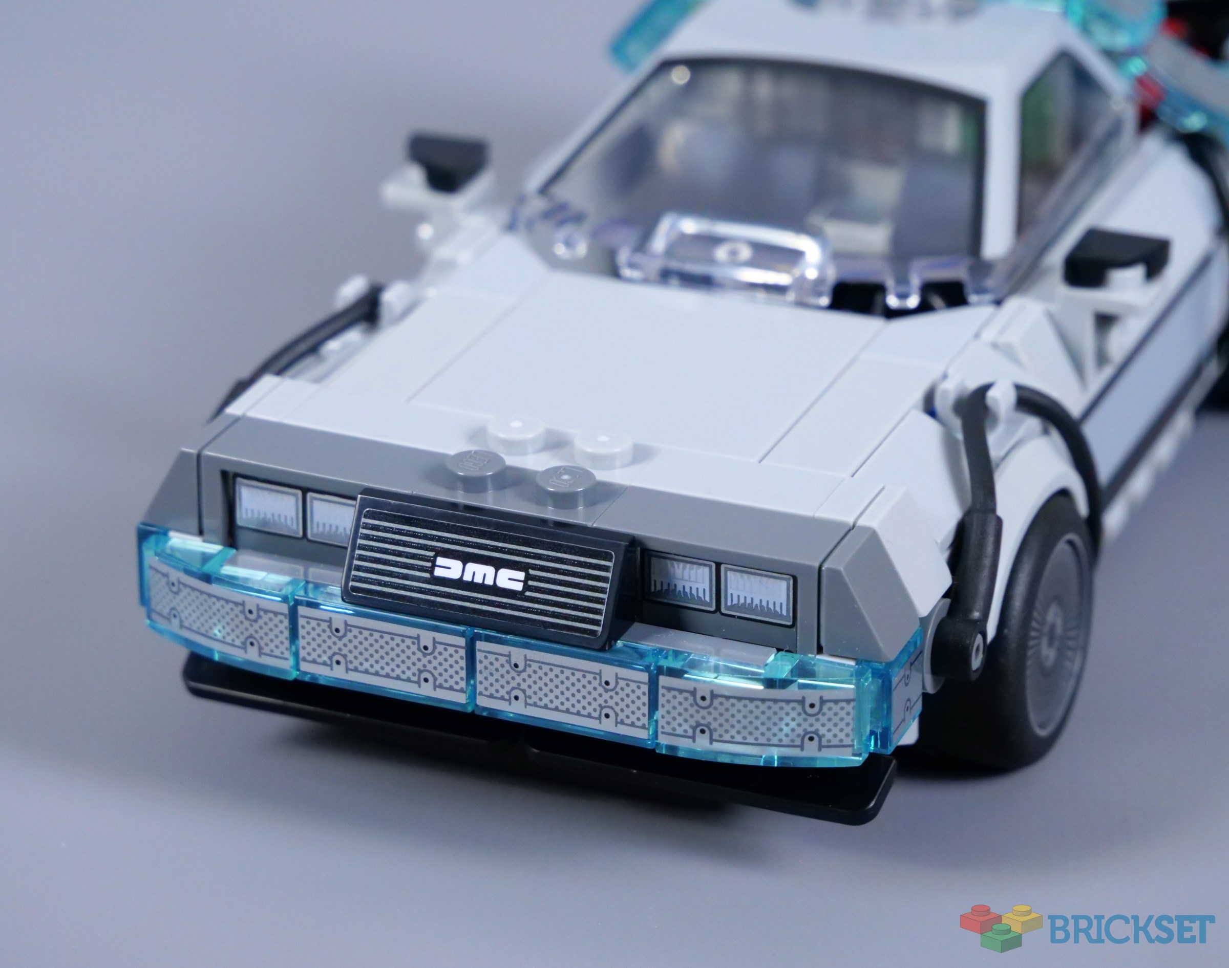 The angle of the bonnet completely derailed 21103 The DeLorean Time Machine and remains hard to recreate at this scale. However, rather than angling the bonnet, the designer has given this whole model a slight forward rake. I think this is a reasonable solution, as the car does lean forward a little in the movies, albeit not quite so much.