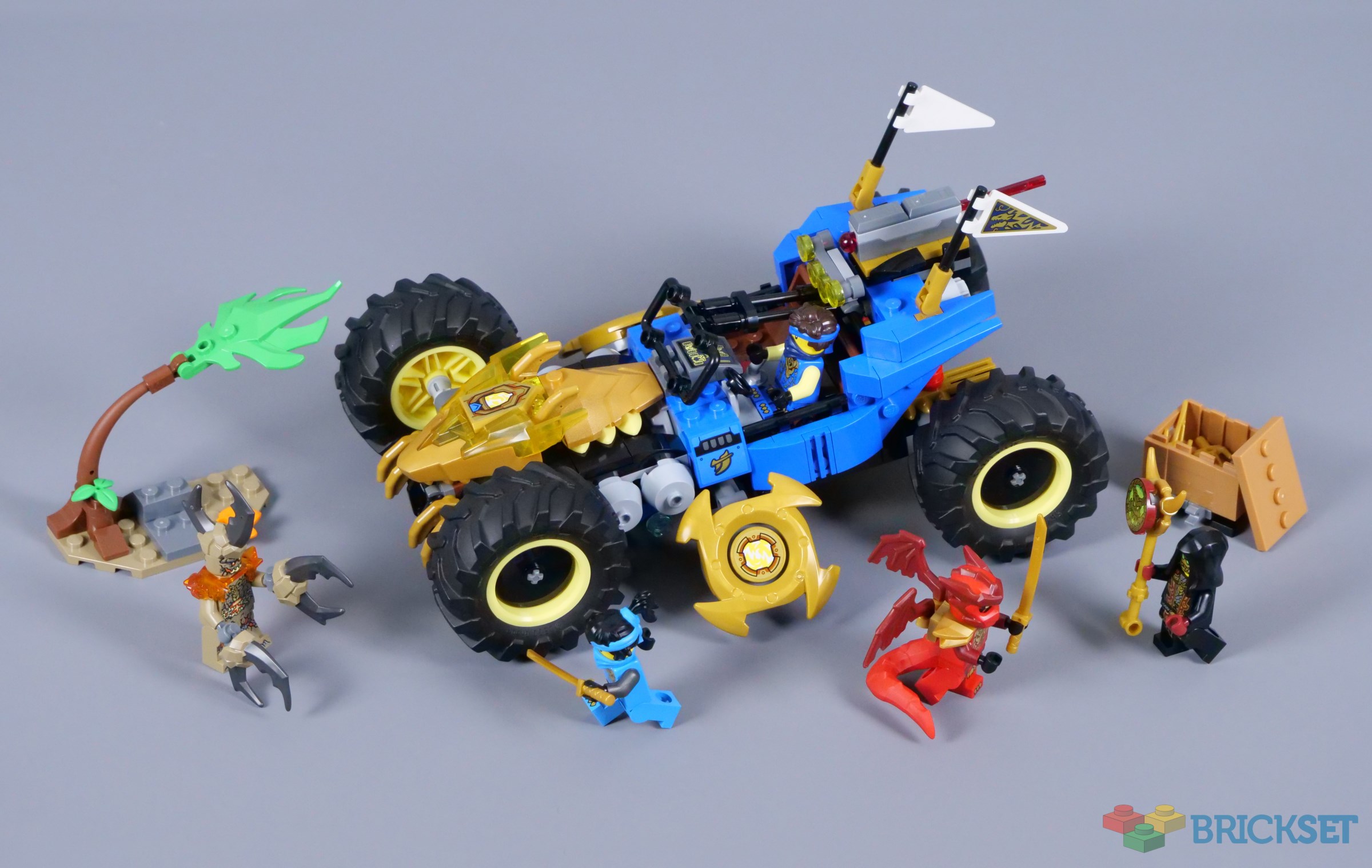 71856 Jay's Transforming Car does some things extremely well, but others are utterly bizarre. The transformation function is simple and clever, particularly given how it activates the blades attached to both sides. Also, I think the vehicle looks pretty good, other than the spring-loaded shooter on the back. That and the included tree are just strange, in my opinion.