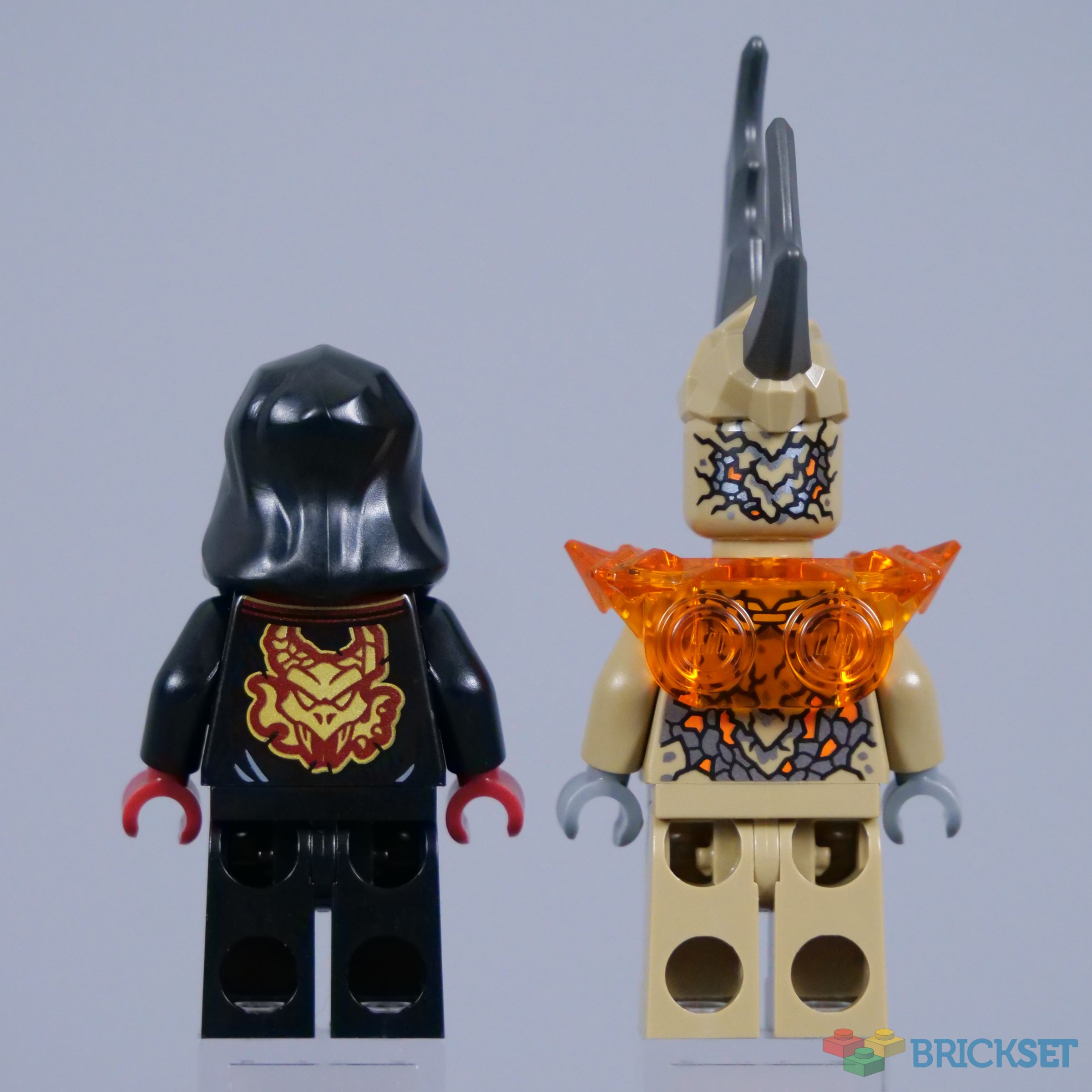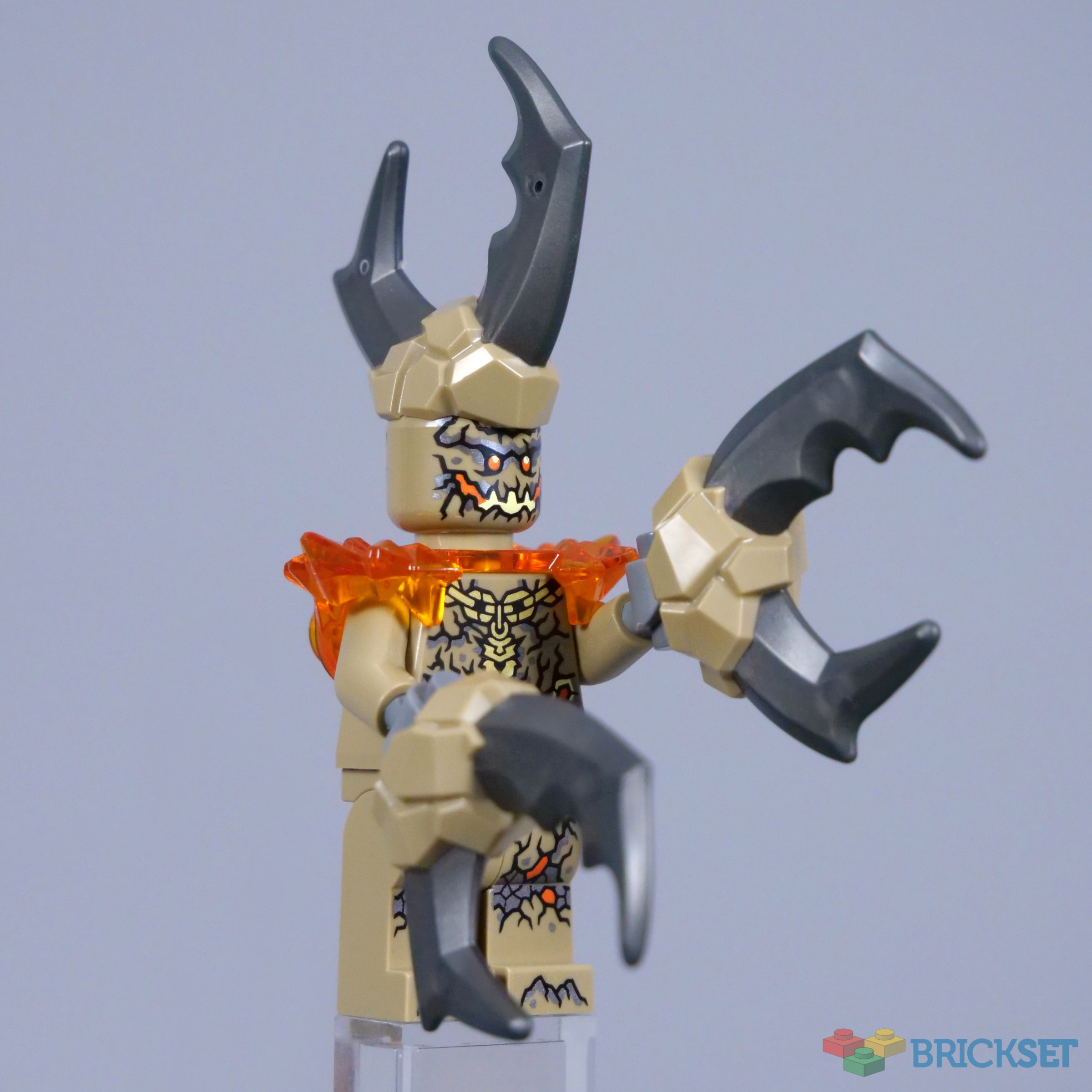 It appears the Loyalists are responsible for unleashing a group of Elemental Monsters, like the Earth Monster. This is a striking minifigure, with imposing dual-moulded horns mounted on its head and an interesting cracked texture over its entire body. The orange details and especially the shoulder armour look great, but I am unsure about dark tan as a base colour. Earth is often more associated with black or brown in NINJAGO.