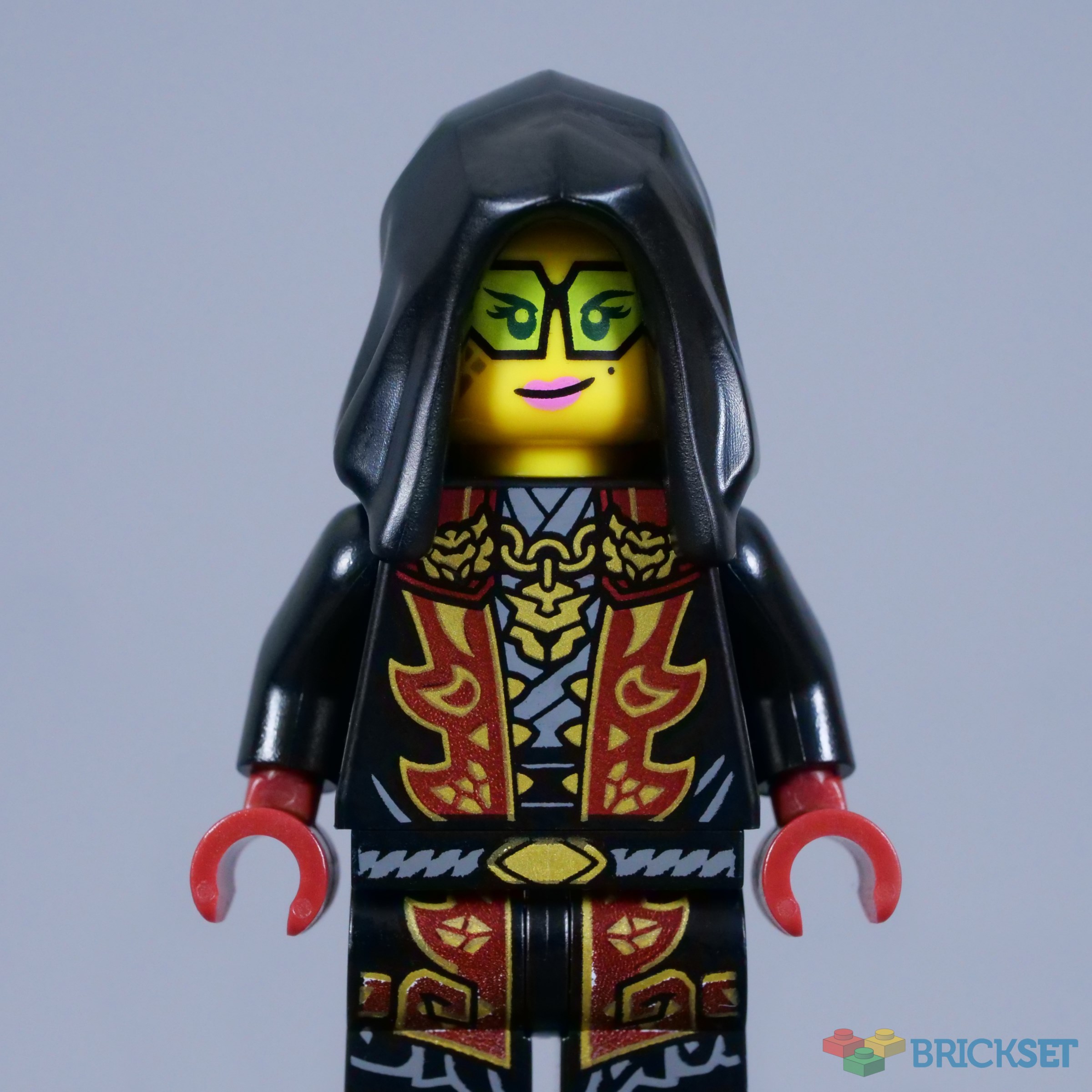 The new season introduces fresh opponents for the ninja, seemingly controlled by the Loyalist Leader. This minifigure is lavishly dressed in a black robe with dark red and gold highlights and the colour combination looks superb, particularly with the metallic gold mask and its bright green eyes! The scaly details and teeth on the mask are striking beneath the black hood.