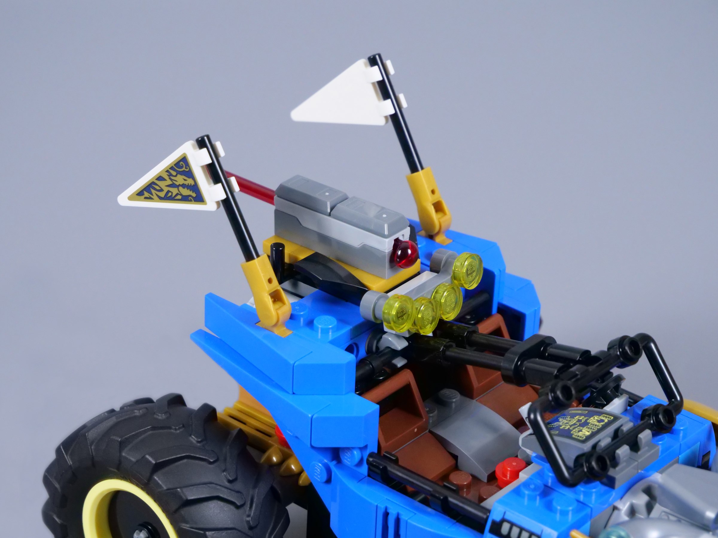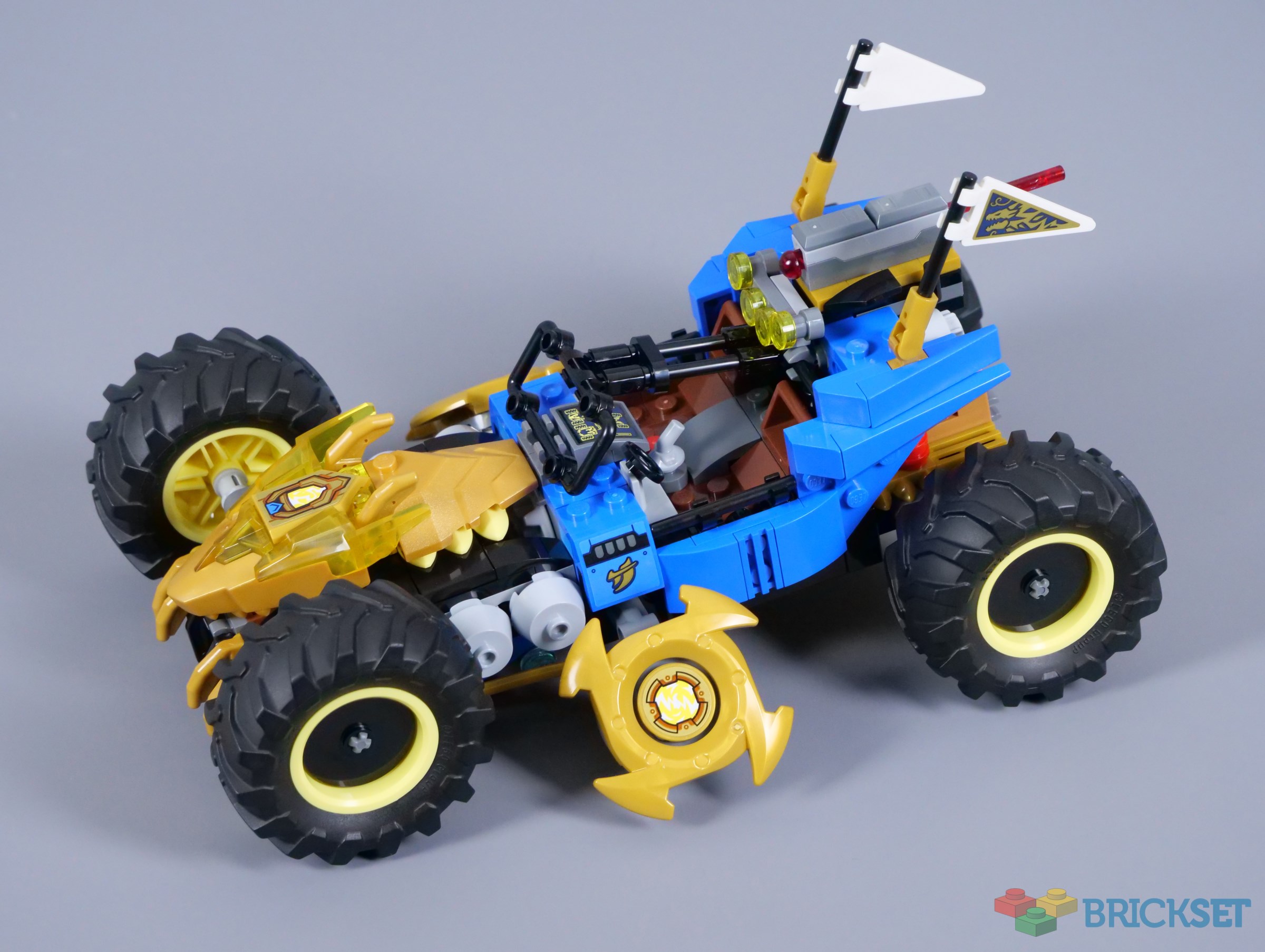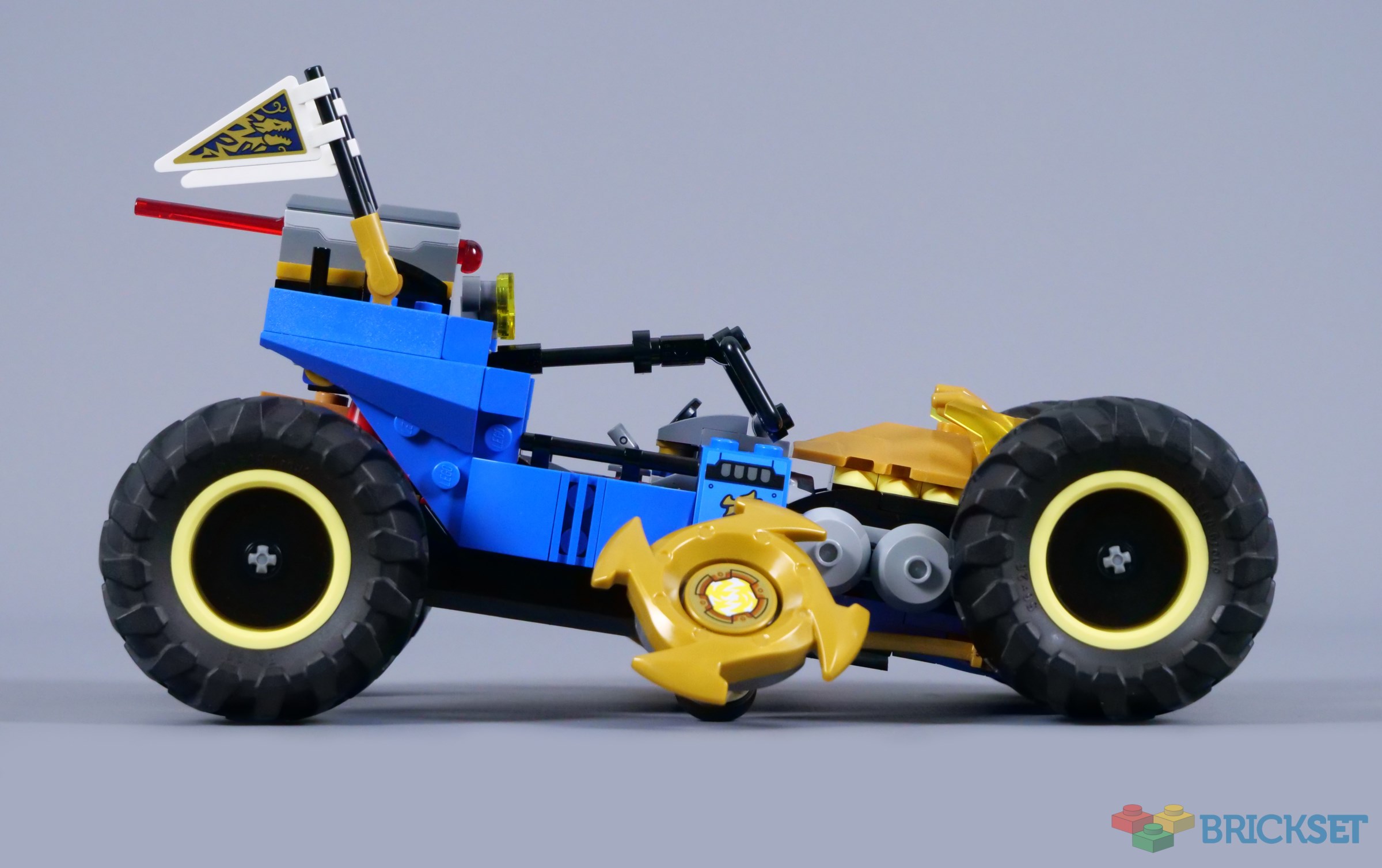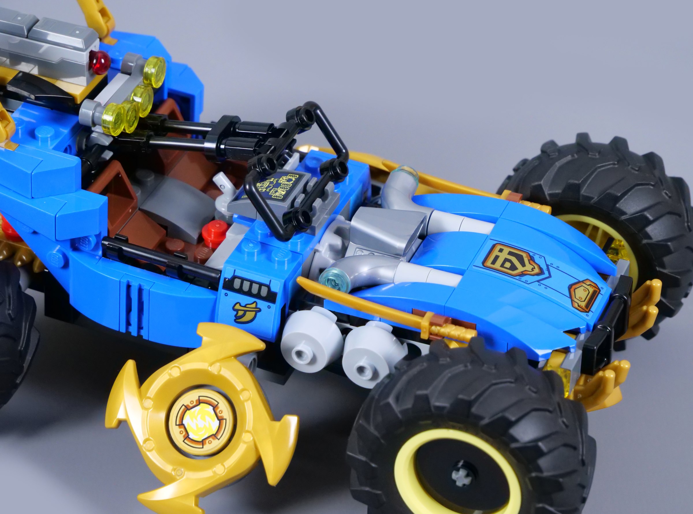 The model's forward rake also becomes steeper with the dragon head revealed, bringing the wheels behind the side blades into contact with the ground. The rotating blades are relatively common in NINJAGO, but only having them activated when the car 'transforms' is an unusual feature and one that works perfectly, as the blades spin as the vehicle moves.