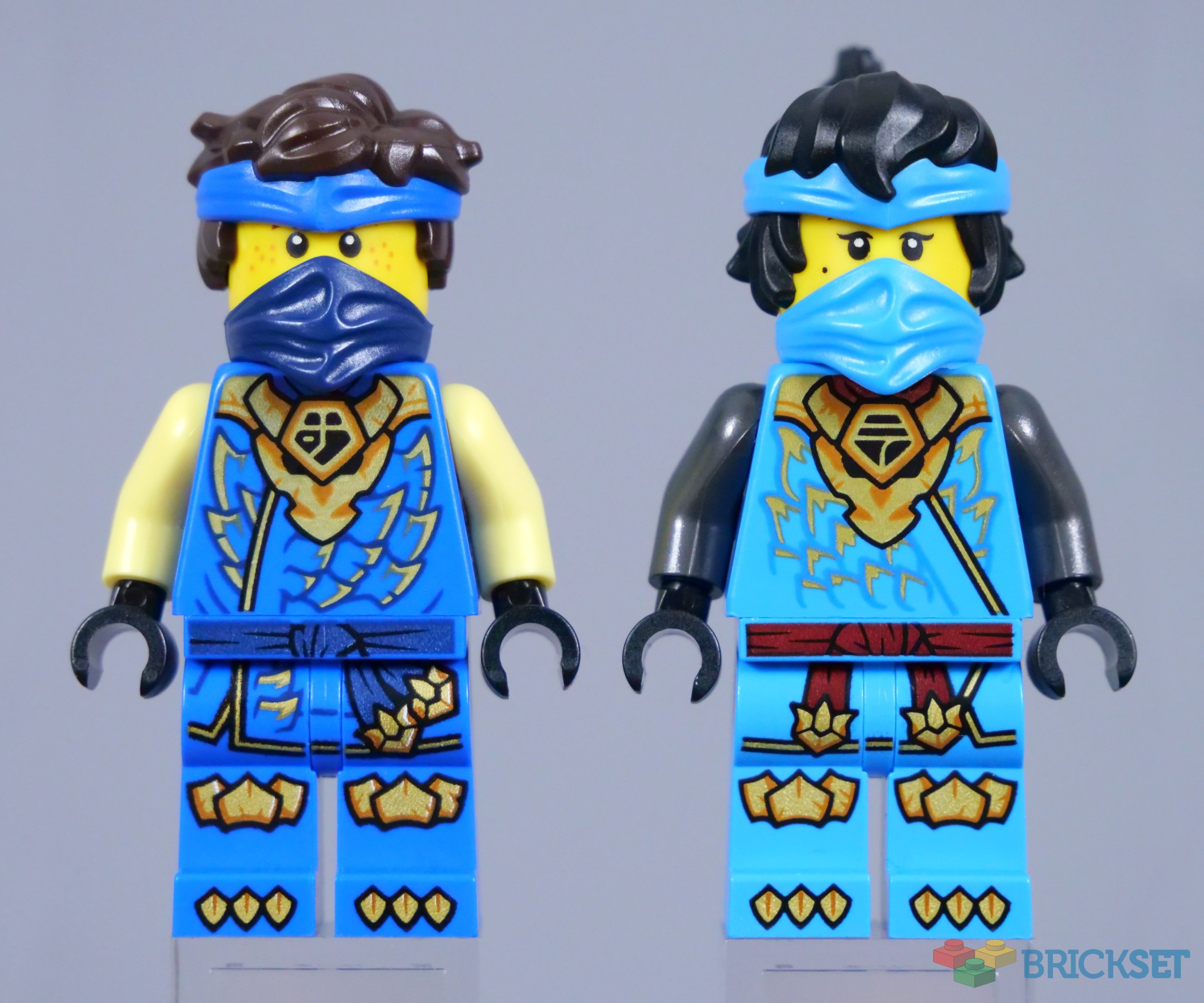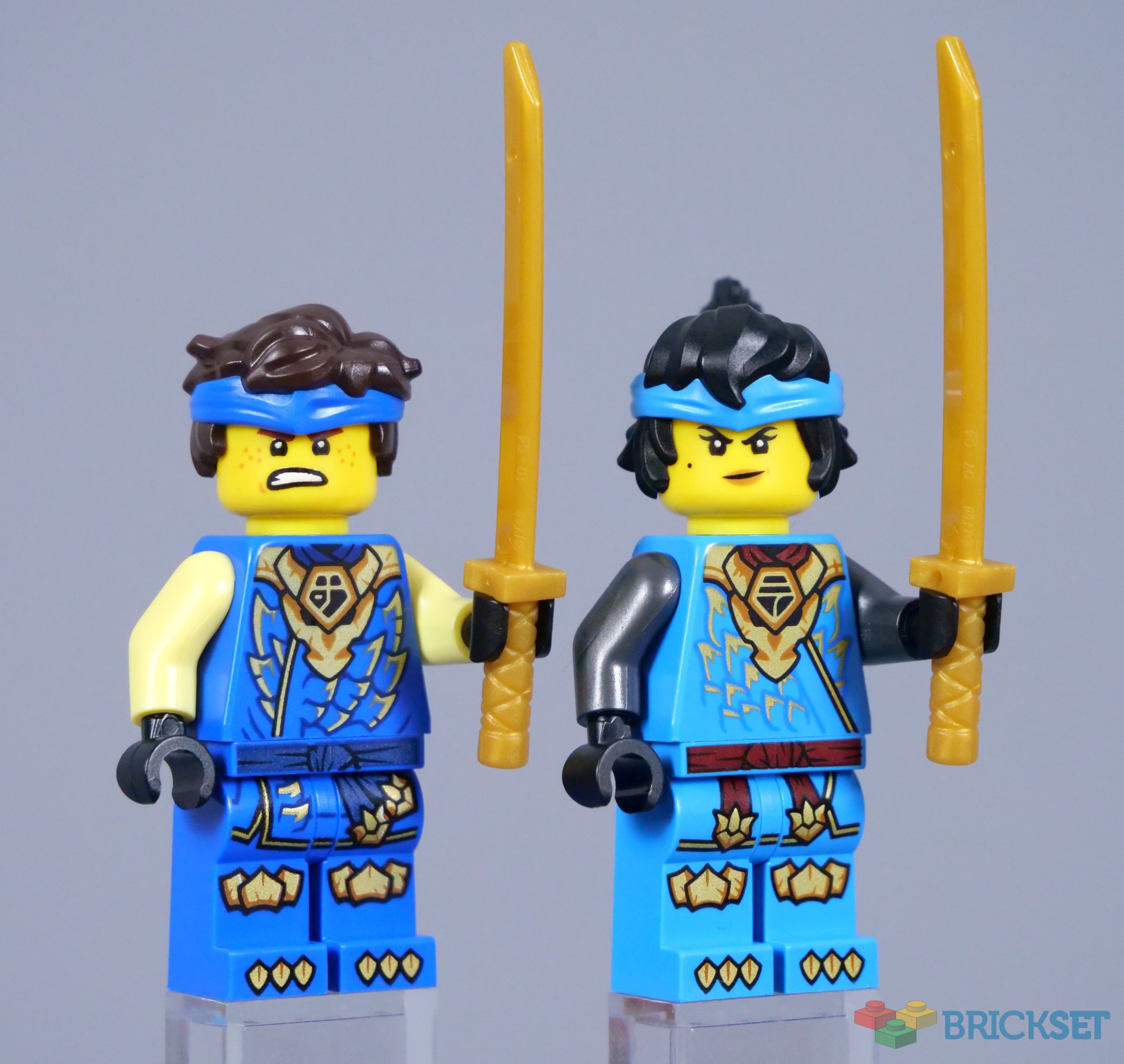Jay features a new double-sided head, which is a rarity for the ninja. His smile and determined expression work well, while Nya's double-sided head has appeared plenty of times before. The minifigures are each equipped with a golden katana.