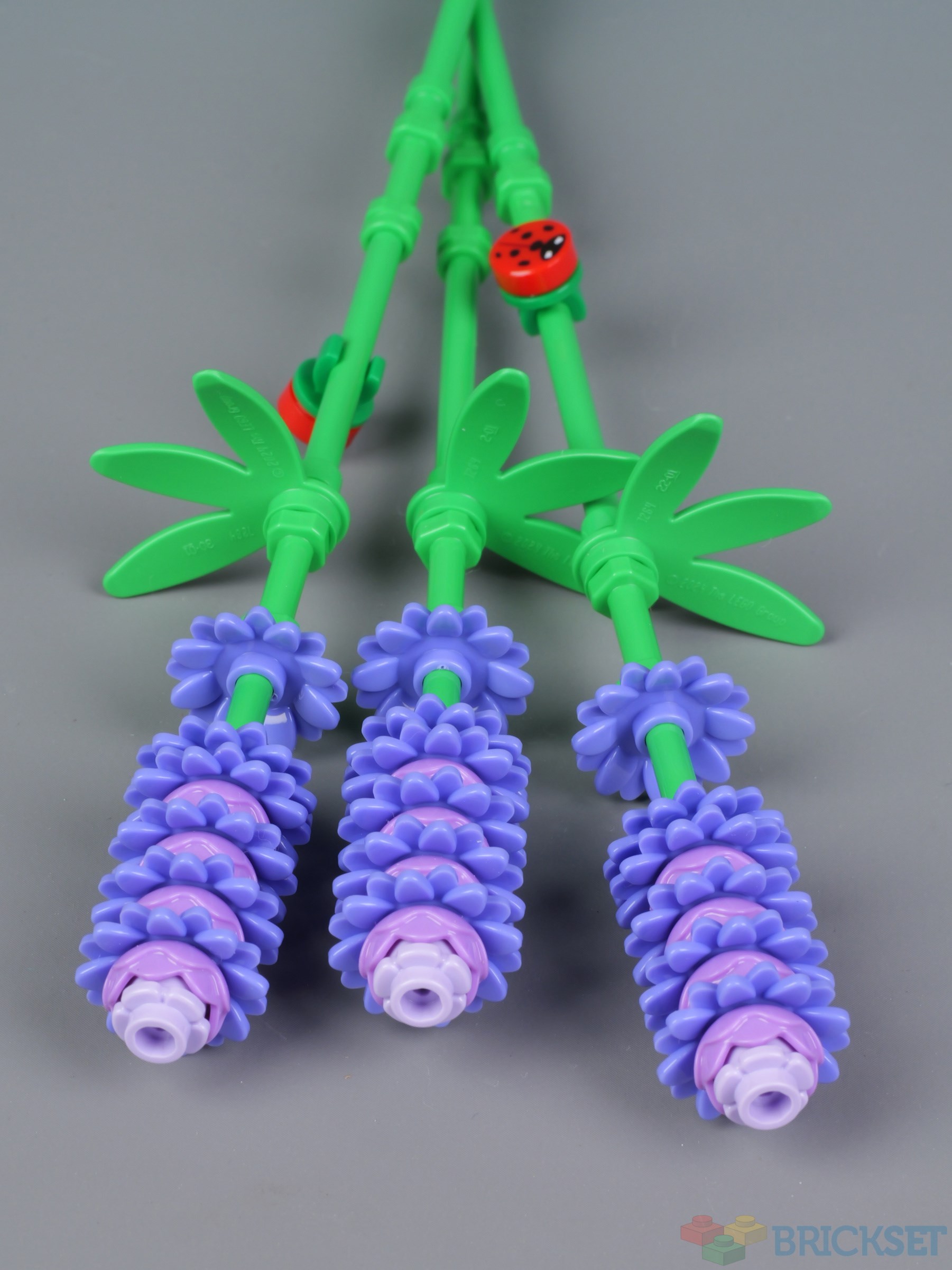Lavender was one of the flower varieties included in the very first botanical set, 10280 Flower Bouquet, but it looks very crude compared to this new version, which makes use of two recently introduced parts, Plant, W/ Plate 1X1 in the new blue violet colour, with medium lavender Plant, No. 2s sandwiched between them.