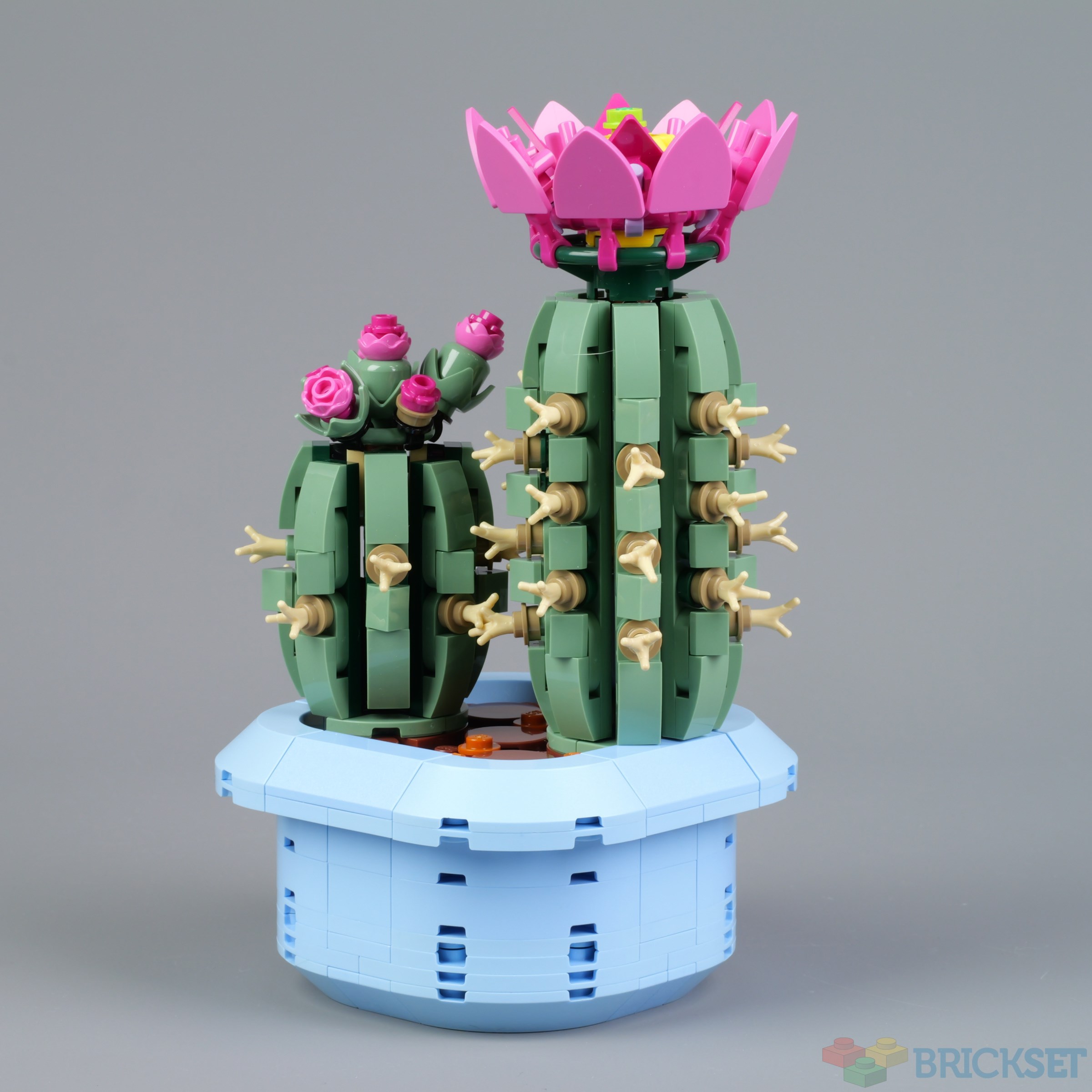 The 8-sided barrels of the plants are cleverly constructed in two halves, each with 4 sides, which are then slotted together and held in place with a 3.18 bar in the centre. The small cacti utilises a new dia-3 ring with five connection points to hold the flower heads in place.