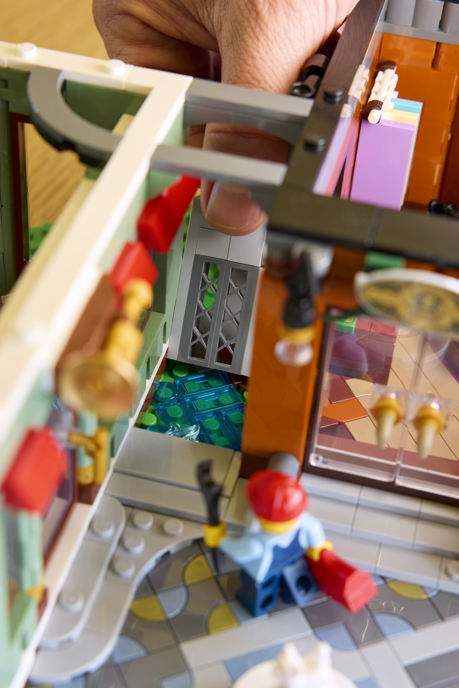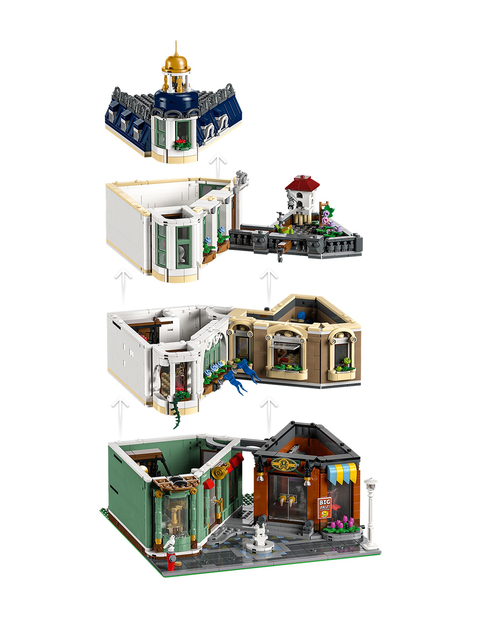 The 3-level building includes a 2-storey music shop with marching-band instruments, and an adjacent furniture shop complete with a counter, stools, table and workshop. The top floor is home to a furnished flat with a bathroom, while a roof garden provides space for potted plants and a pigeon coop. Perfect for home office decor, this model includes 7 minifigures and a modular design with easy access to the interior.