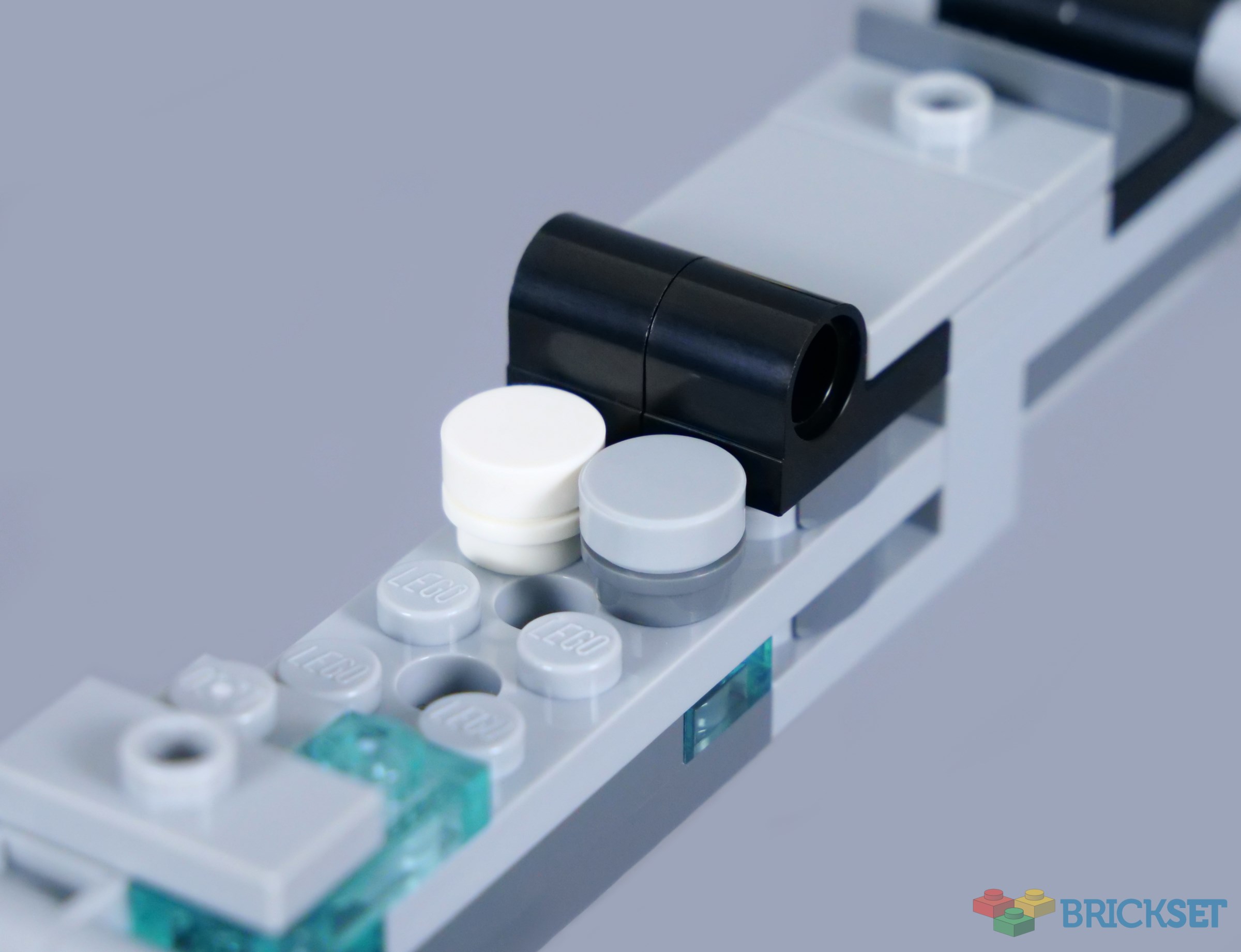 Among the pieces used for greebling are pearl dark grey blasters and Uruk-Hai swords. These provide good detail, but I also find them quite funny because you can unfold these elements as though deploying extra weapons for battle! Star Wars capital ships should clearly be armed with giant swords.