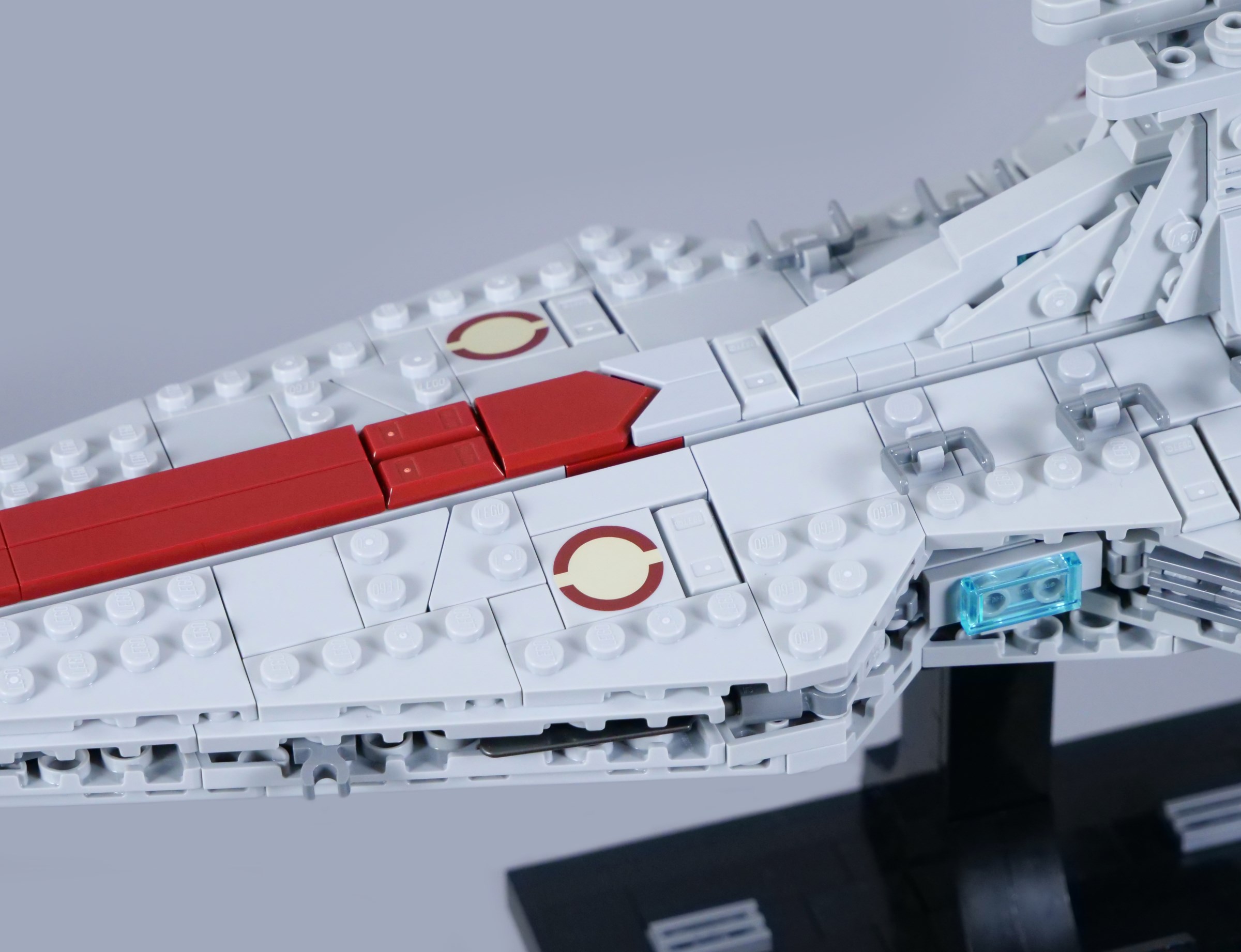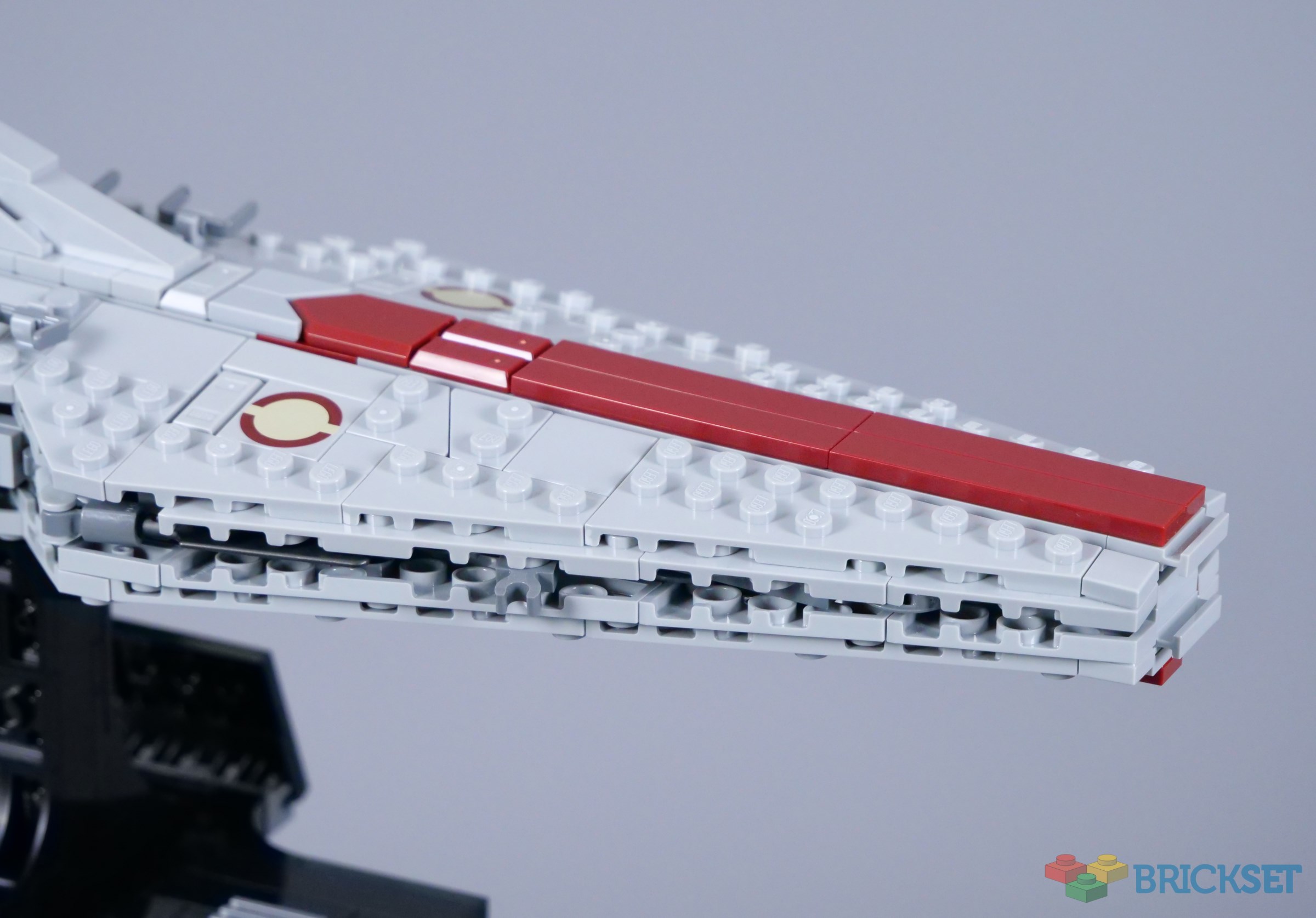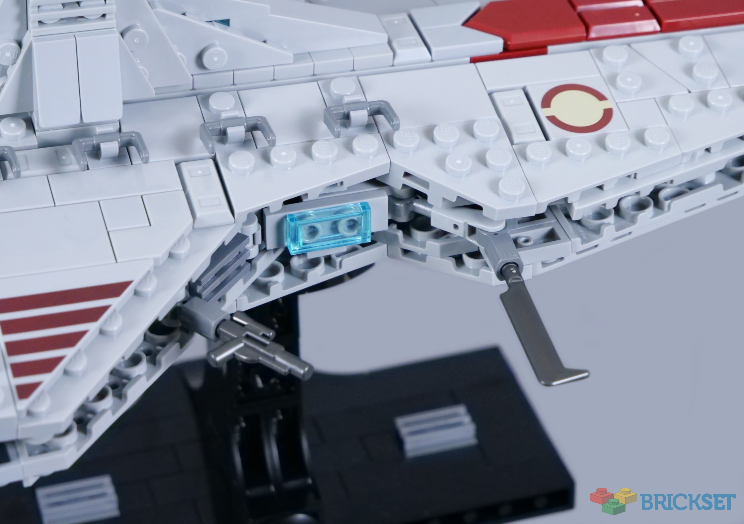 75367 Venator-class Republic Attack Cruiser was criticised for lacking the ship's characteristic dorsal hangar, but this model does have room for the hangar. The dark red panel is removable to reach the hangar deck, which contains trans-light blue magnetic shields with yellow and dark red 1x1 rounded tiles, representing Anakin and Obi-Wan's two Jedi Interceptors.