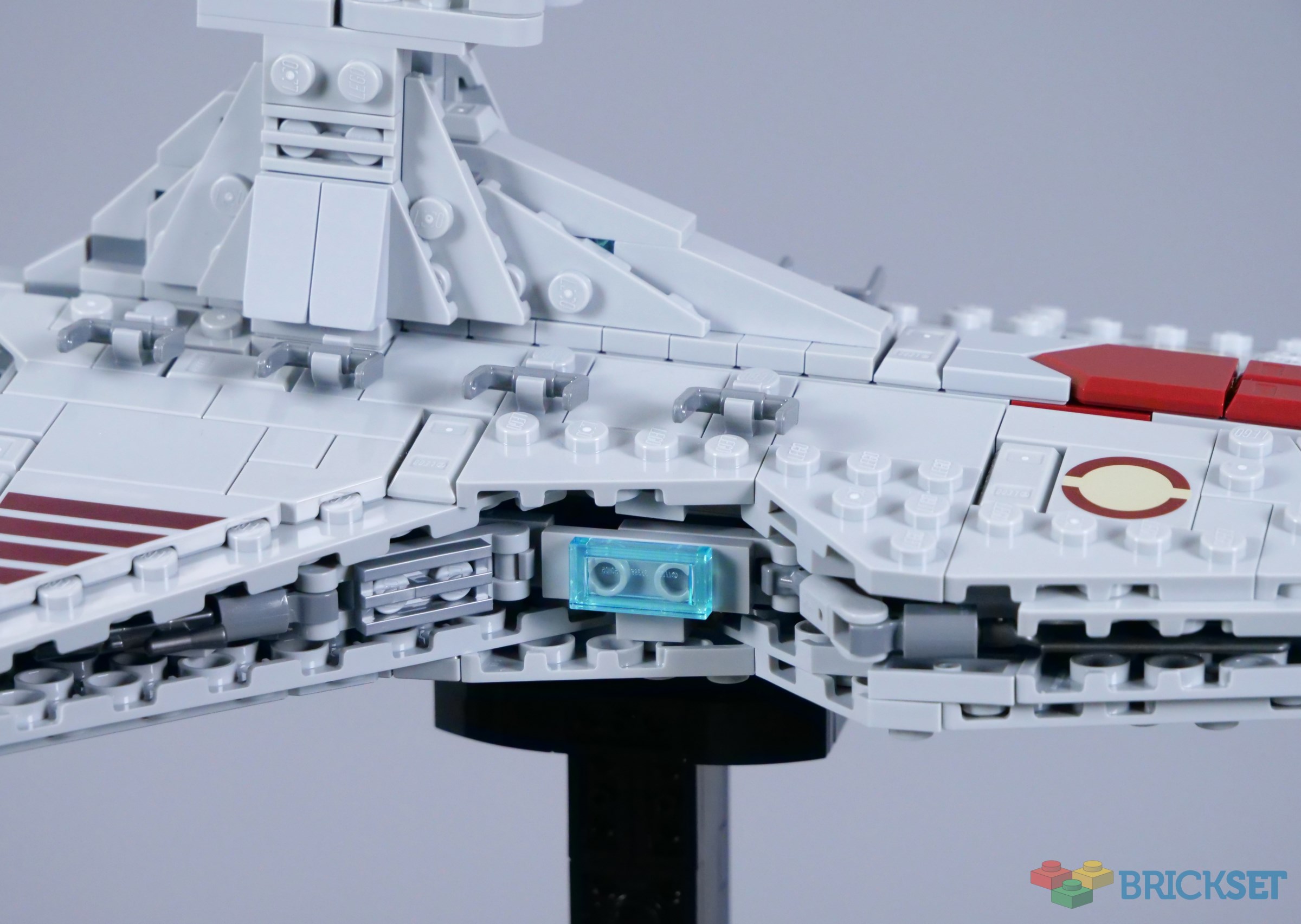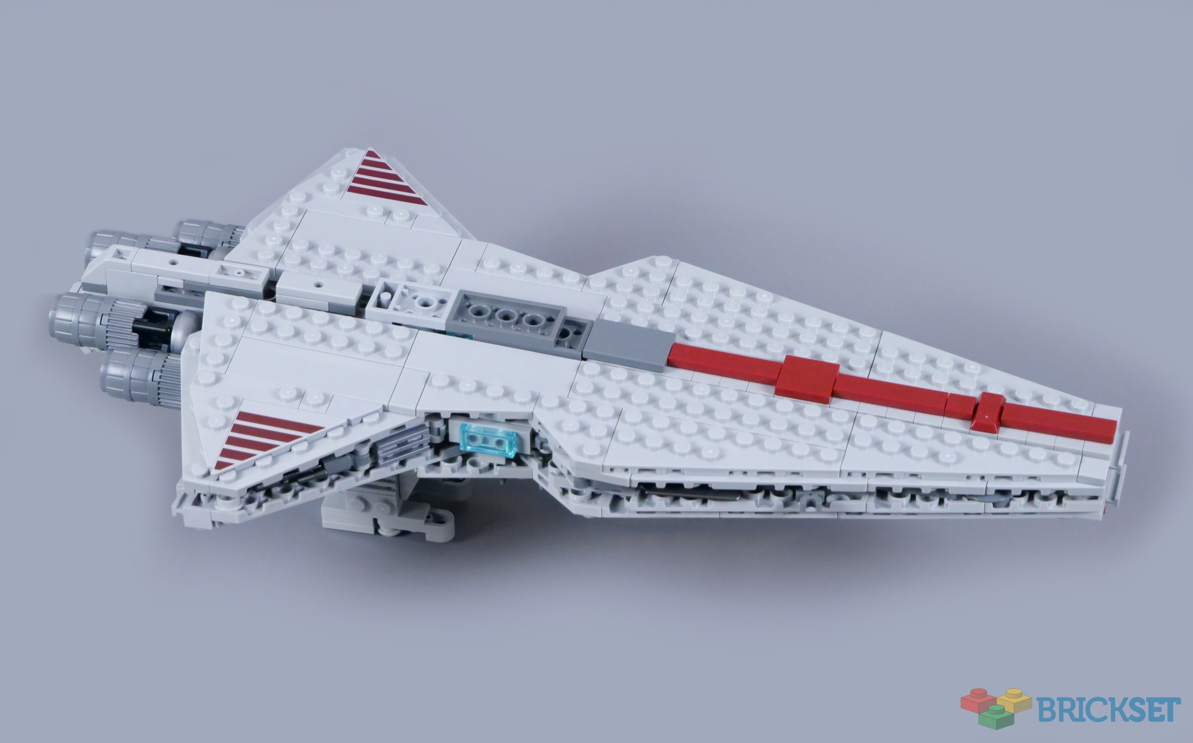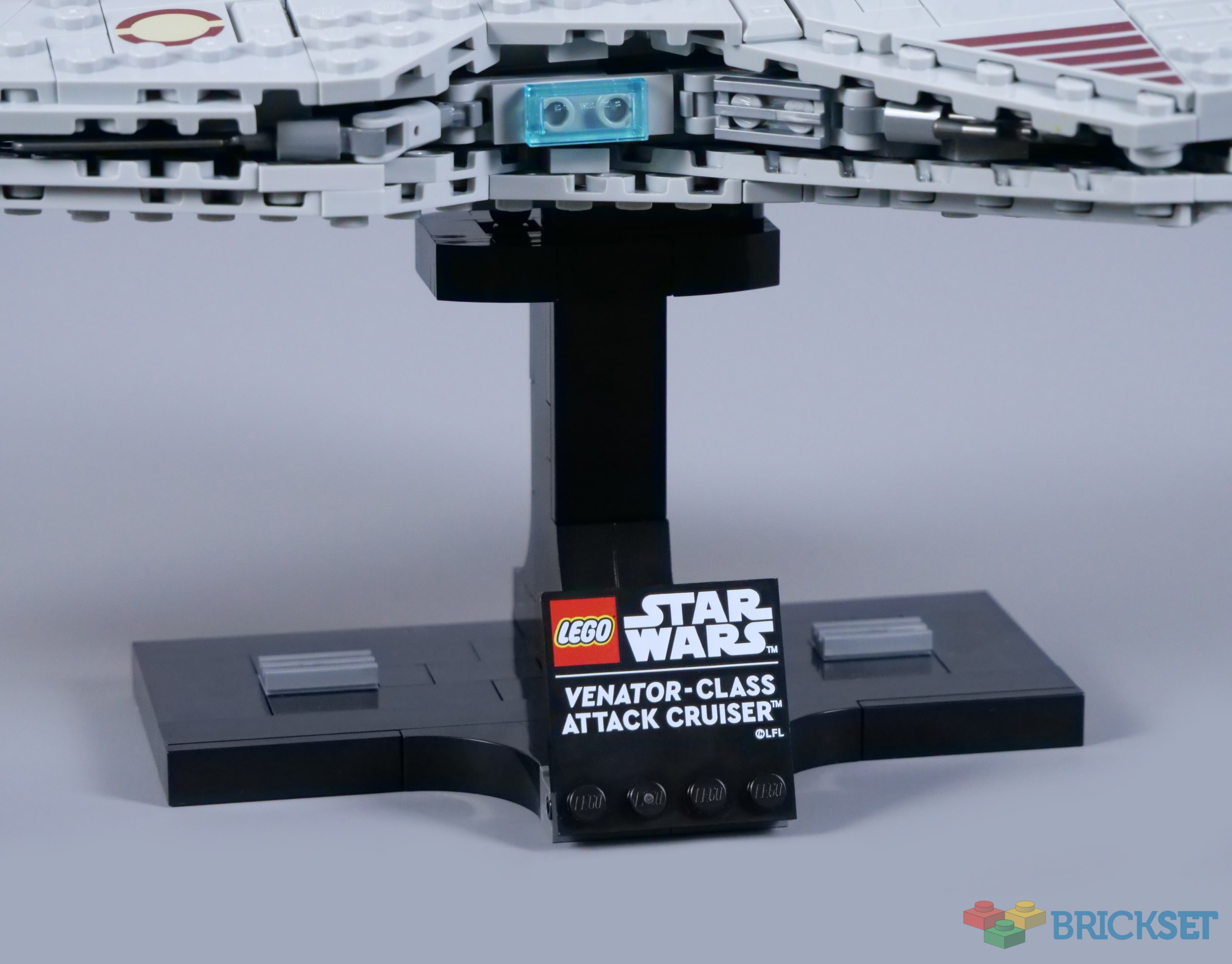 75367 Venator-class Republic Attack Cruiser was criticised for lacking the ship's characteristic dorsal hangar, but this model does have room for the hangar. The dark red panel is removable to reach the hangar deck, which contains trans-light blue magnetic shields with yellow and dark red 1x1 rounded tiles, representing Anakin and Obi-Wan's two Jedi Interceptors.