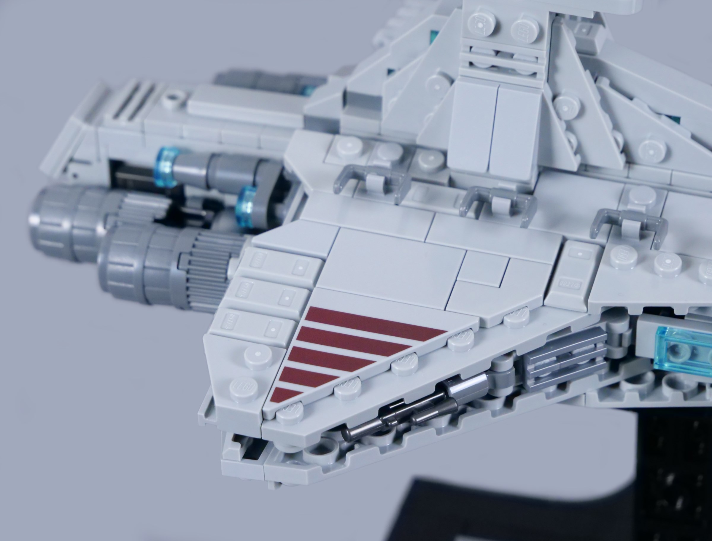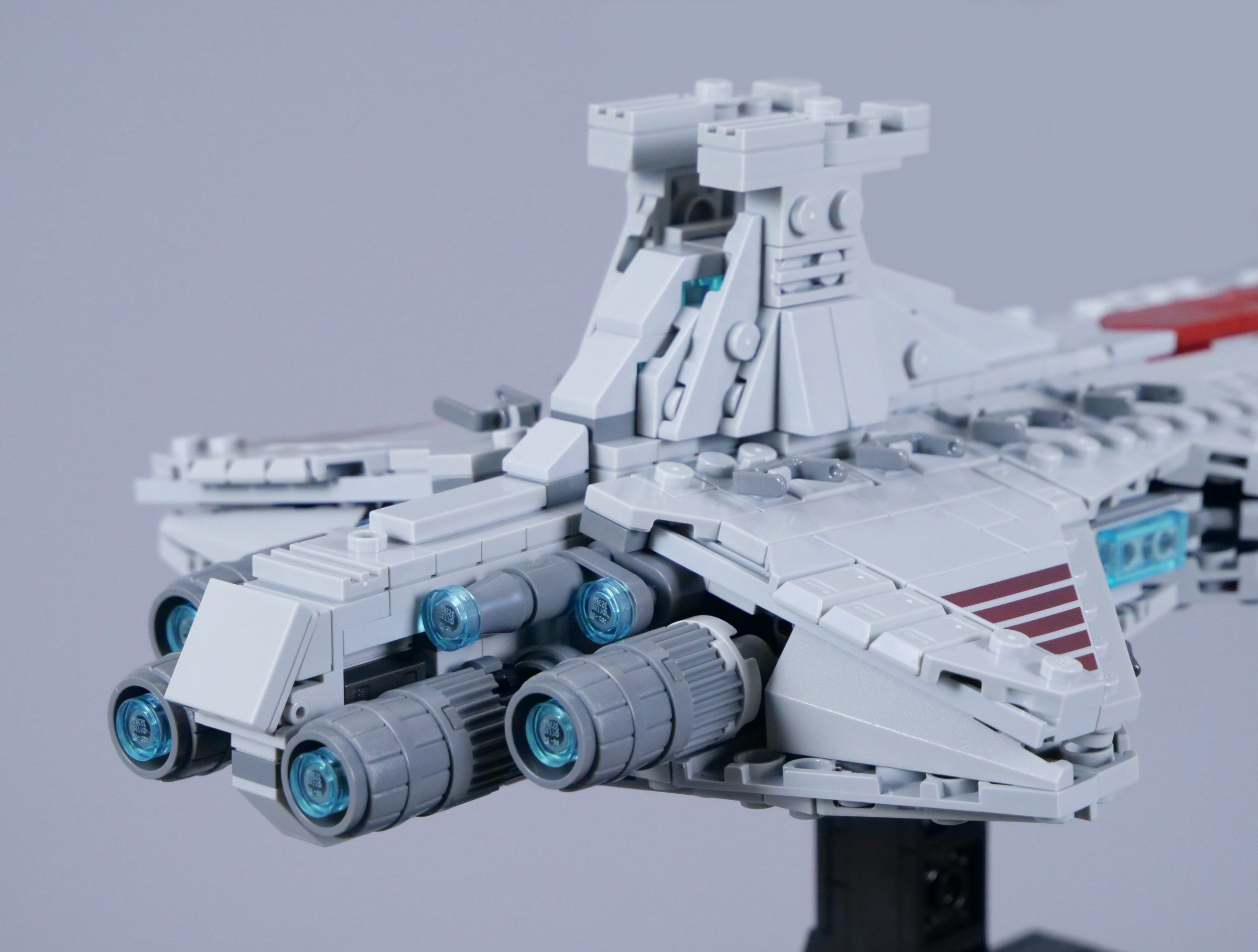 The engine assembly at the stern is broadly accurate to the source material, using dark bluish grey barrels and 2x2 round textured bricks for the main engines, while the smaller engines are constructed with 1x1 round bricks. This configuration reflects the starship as it appeared in Star Wars: The Clone Wars, whereas the live-action design has one more nacelle on each side.