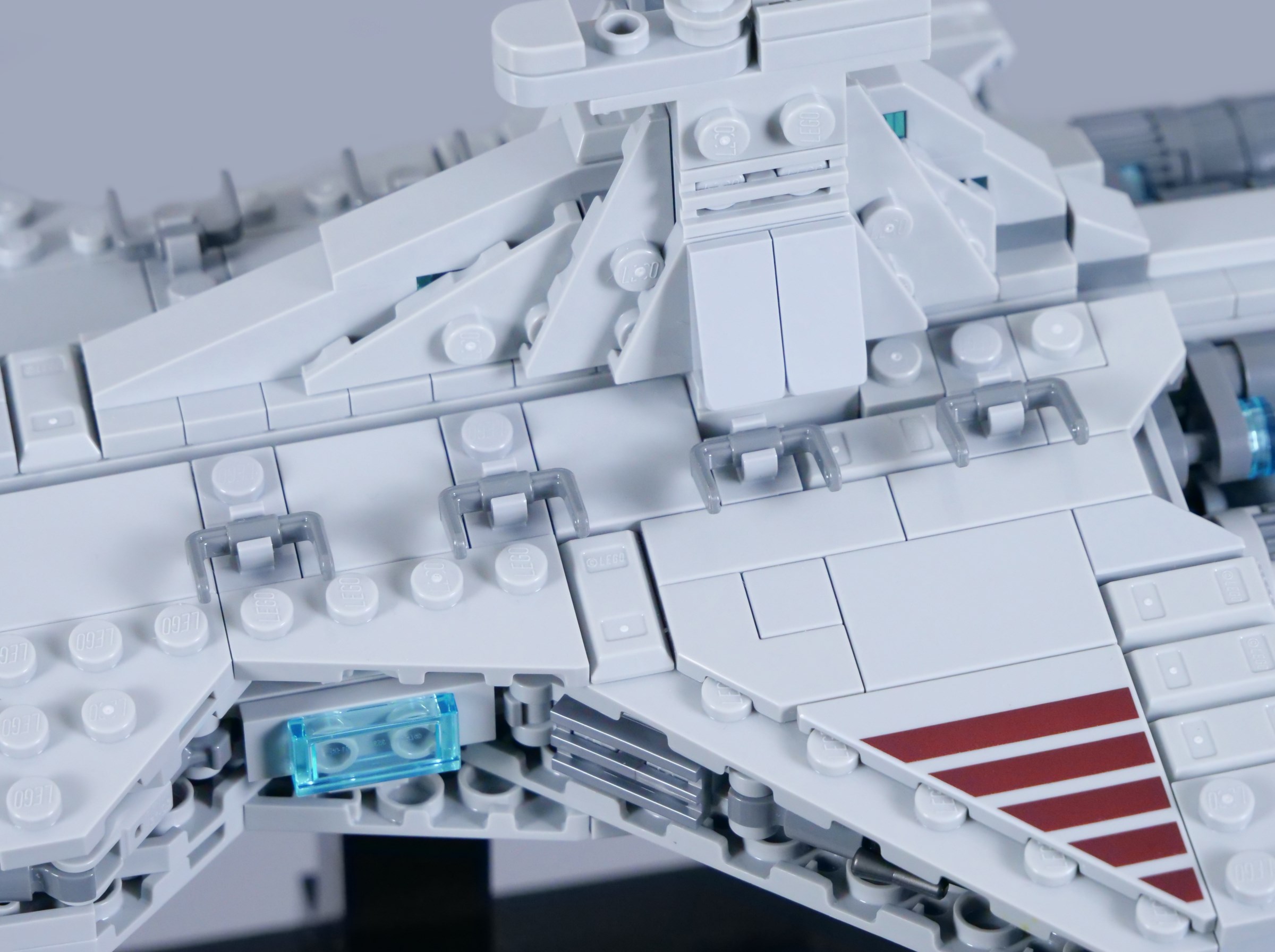 A new 4x4 triangular tile debuts here, corresponding with the familiar 2x2 triangular tile. These are printed with accurate dark red stripes, but I am sure the tiles will appear without decoration elsewhere. Otherwise, the texture on the hull surface continues to please, incorporating several more 1x2 ingots to break up the tiles.