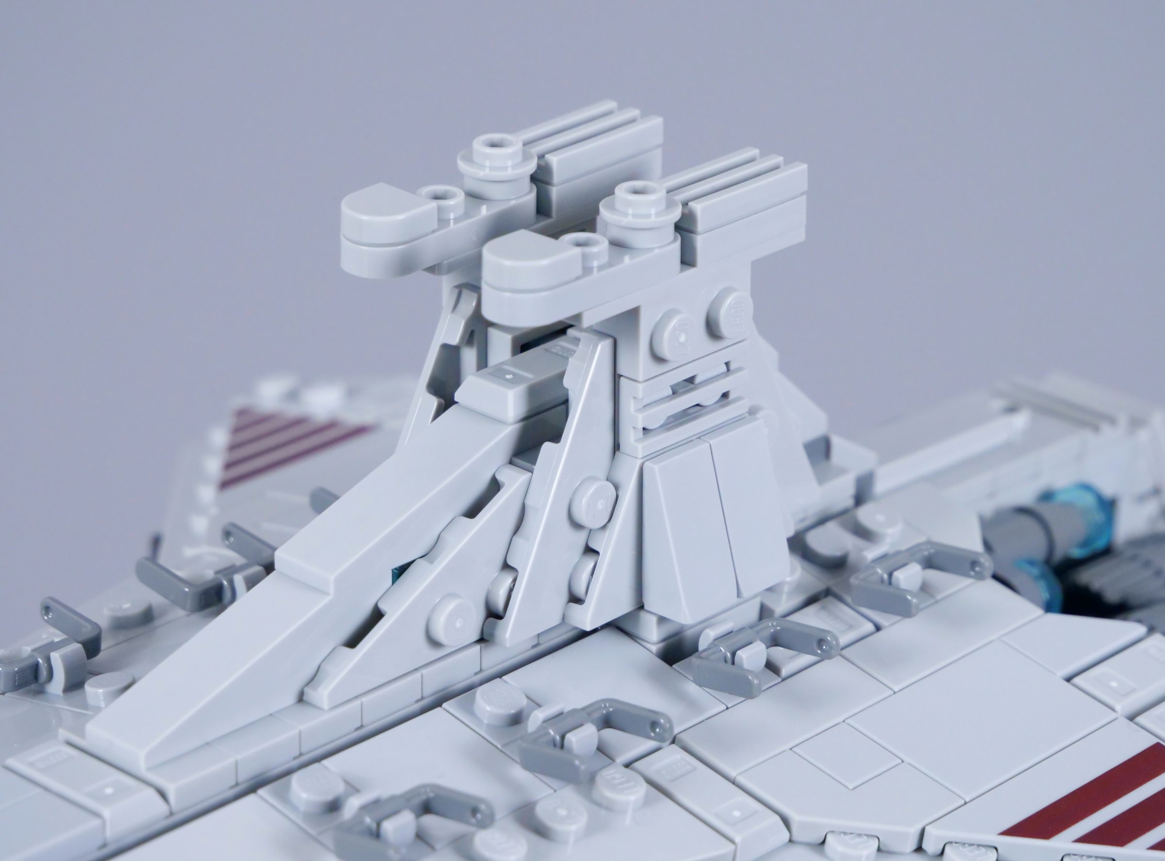 Among the vessel's most distinctive features are its twin command bridges, with one directing ship operations and the other starfighters. The curvature towards the front is accurate and 1x1 round plates with hollow studs work nicely as the communication and scanner arrays placed on top. The 1x3 rounded plate is not available in dark red currently, otherwise you could swap the bridge colour to designate this as a flagship.