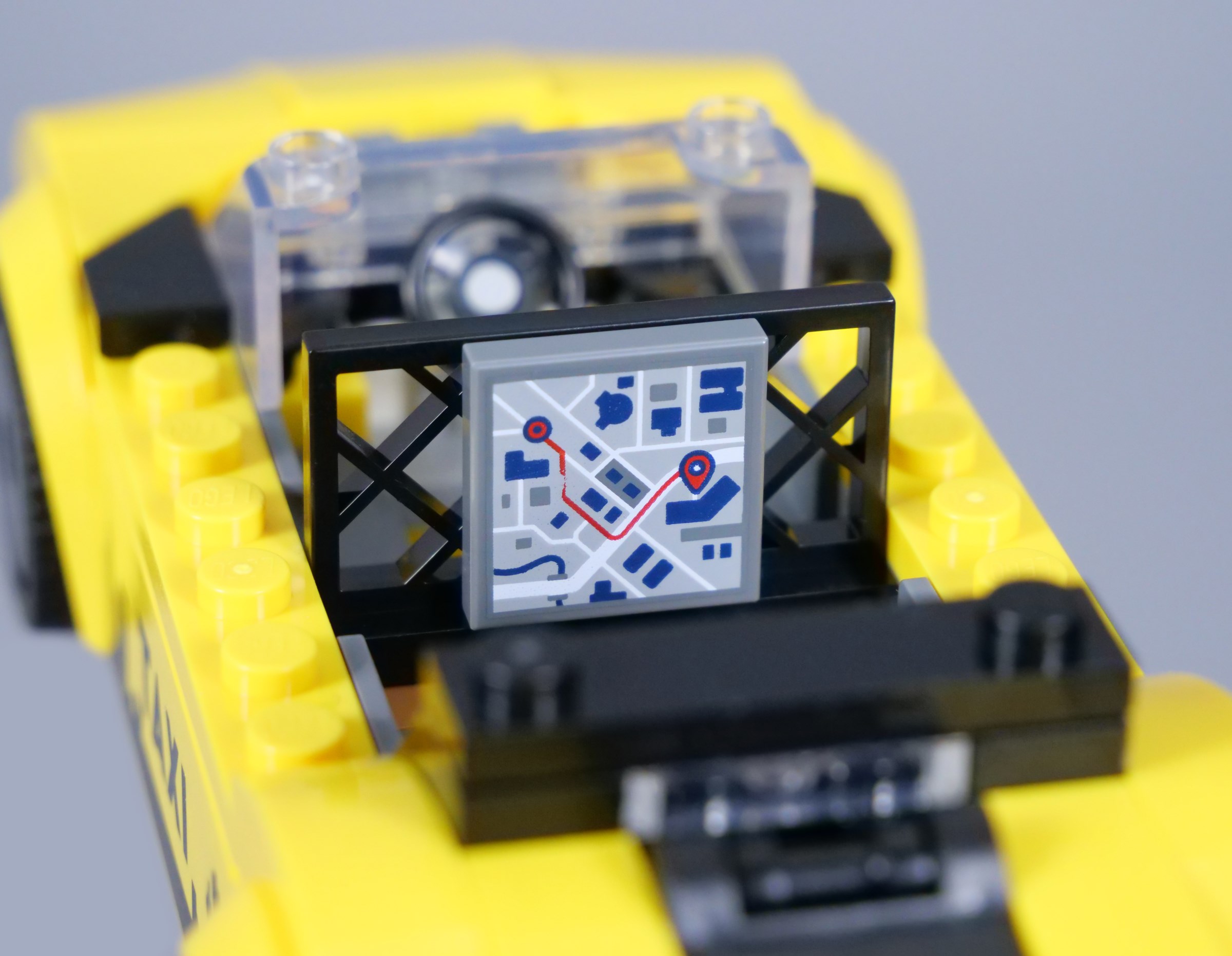 The roof is easily removable to place two figures inside. There is a steering wheel in front of the driver's seat and a fence piece separating the passenger area, with a digital map attached. This is another printed piece, showing the planned route on a 2x2 inverted tile.