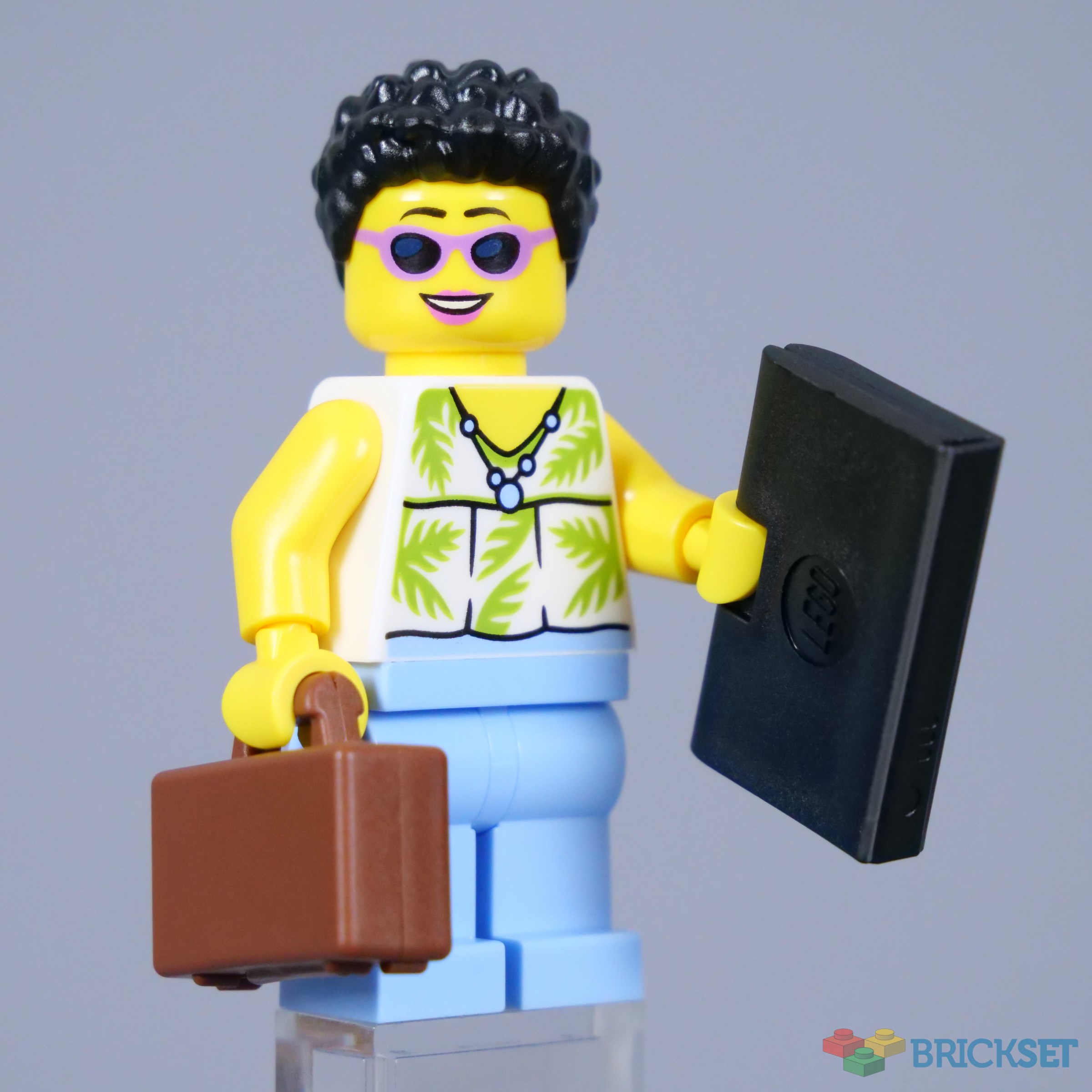 This minifigure certainly seems ready for a holiday, especially given the alternative expression with sunglasses on. I like the textured hair component as well, plus the reddish brown suitcase and the laptop.